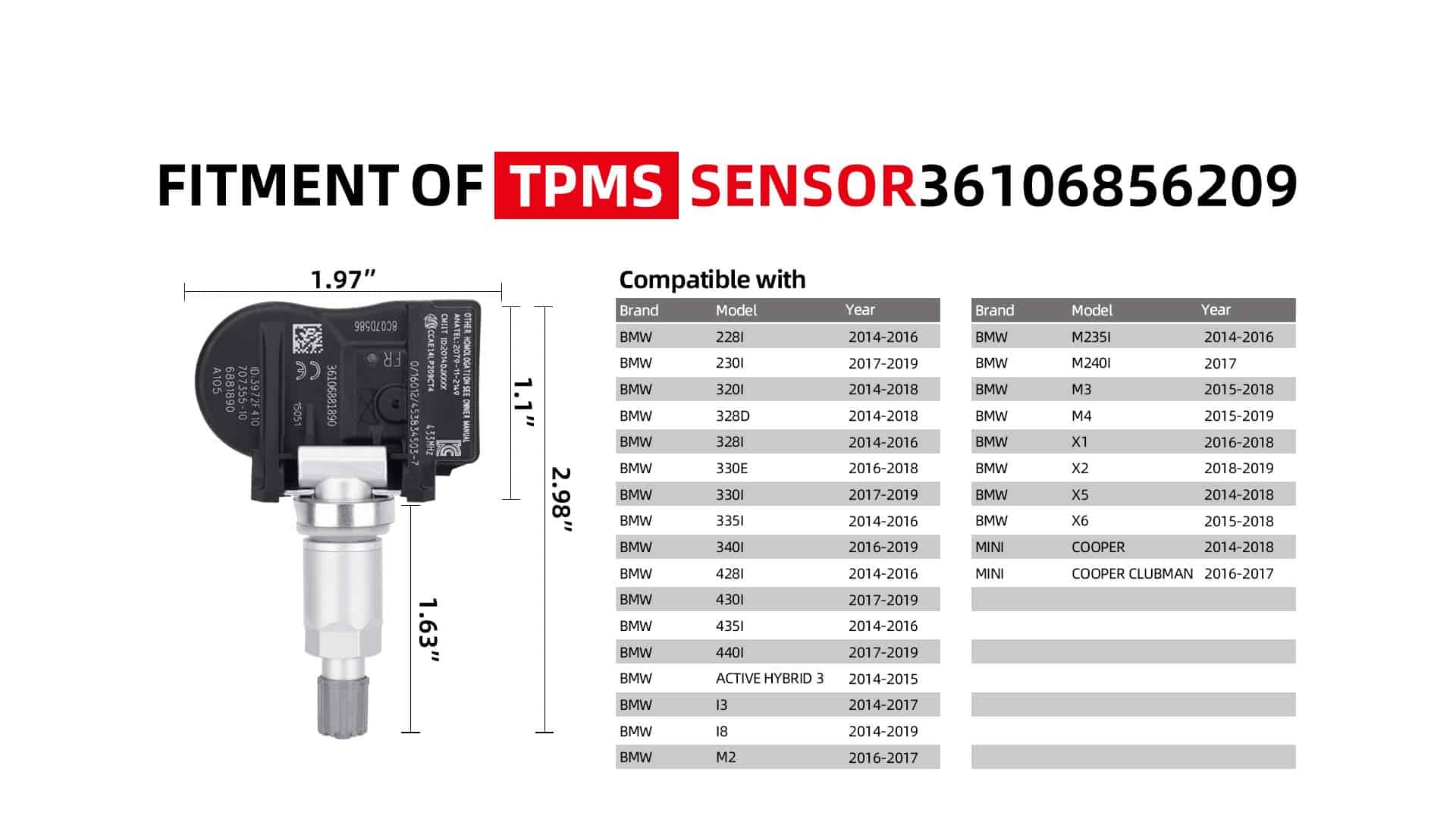 Reemplace el sensor de monitoreo de presión de neumáticos (TPMS) en su BMW con este set de 4 sensores compatibles. Cada sensor viene preprogramado de fábrica para garantizar su confiabilidad y seguridad. La batería de cada sensor está diseñada para durar hasta 10 años de uso normal y resistir temperaturas de hasta 120 grados. Su instalación y rendimiento han sido probados al 100% para garantizar un funcionamiento sin problemas. Si no está completamente satisfecho con nuestros sensores TPMS, no dude en contactarnos para resolver cualquier problema y asegurar una experiencia de compra satisfactoria.