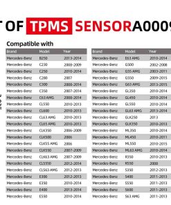 Sensor de Sistema de Monitoreo de Presión de Neumáticos (TPMS) A0009050030 4-Pack Compatible con una amplia gama de vehículos Mercedes Benz. Este sensor es ideal para los modelos mencionados, cubriendo desde el B250 hasta el Smart Fortwo. Con un rango de compatibilidad extenso, es una opción segura para reemplazar sensores antiguos o defectuosos. Fabricado con materiales de alta calidad, garantiza un rendimiento confiable y duradero. Además, ofrecemos una garantía del 100% de satisfacción, por lo que si no está completamente satisfecho con el producto, nuestro equipo de atención al cliente estará disponible para ayudar a resolver cualquier problema que pueda surgir.