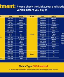 Además, todos nuestros sensores vienen con una garantía de 1 año, por lo que puede tener la tranquilidad de saber que está obteniendo un producto de alta calidad respaldado por un excelente servicio al cliente. ¡No dude en contactarnos si necesita ayuda con su sensor TPMS!