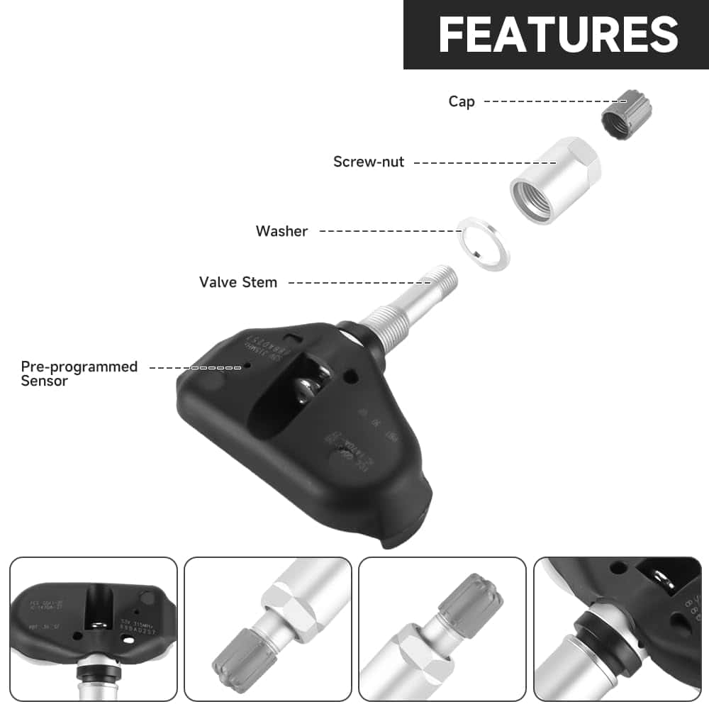 Sistema de Monitoreo de Presión de Neumáticos Sensor están hechos de aleación y plástico ABS, fabricados de acuerdo con estándares de producción, duraderos, alta dureza, no es fácil de deformar, a prueba de golpes, reemplazos OE directamente que ofrecen un ajuste perfecto, aseguran que su vehículo funcione con niveles óptimos de seguridad. OE de ajuste directo reemplazo del Sensor de Sistema de Monitoreo de Presión de Neumáticos, fácil de instalar. Fácil de instalar con herramientas simples en solo minutos. No se requieren herramientas especiales para la instalación. Compra con garantía: 365 días de garantía de kilometraje irrestricta. Trabajamos arduamente para brindarte una experiencia de compra positiva porque realmente nos importa tu satisfacción. No dudes en contactarnos con cualquier pregunta adicional.