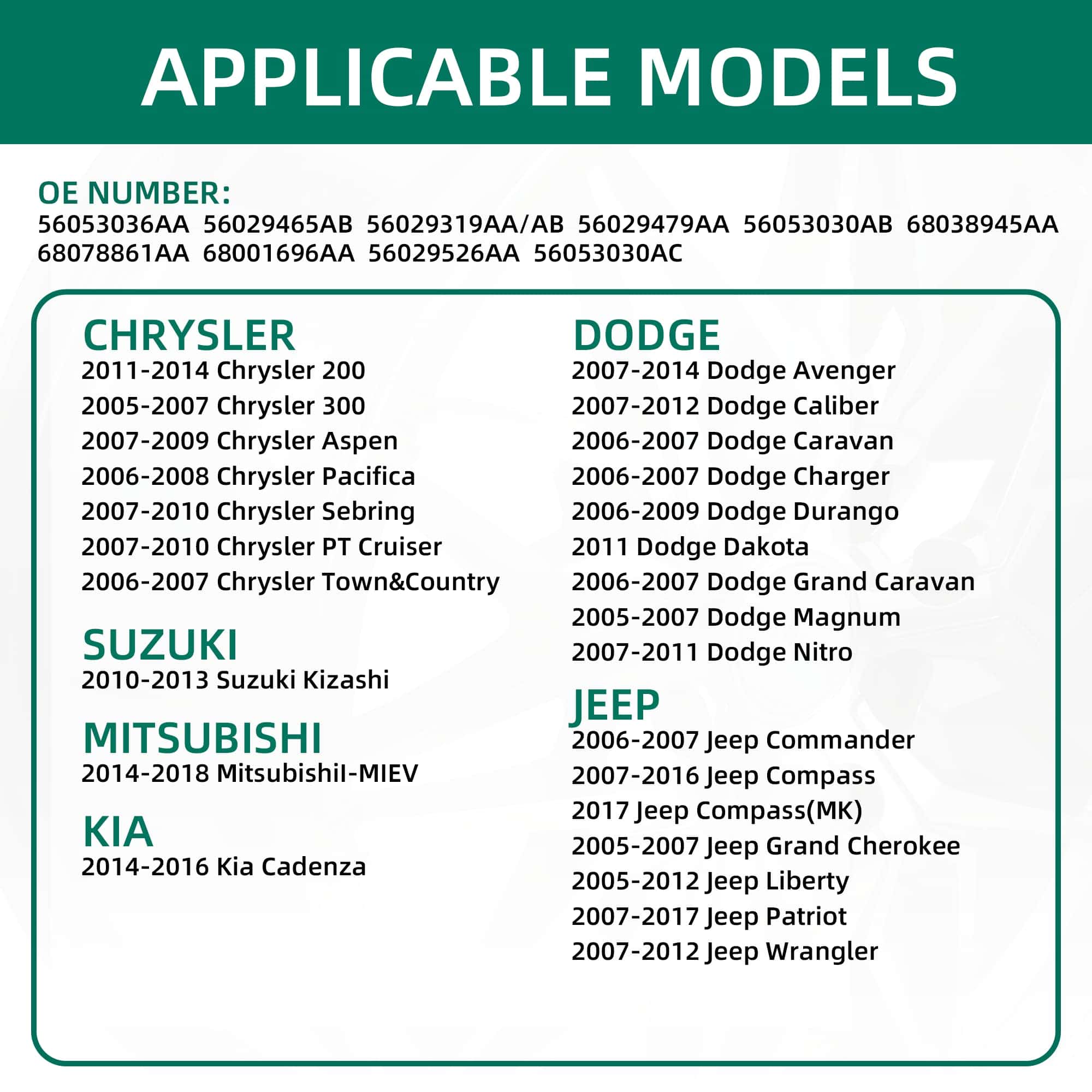Número OE de referencia: 68078861AA&AB&AC, 68001696AA&AB, 56053030AB, 56029479AA&AB, 56029465AC&AB, 56053036AA, 43130-57L00