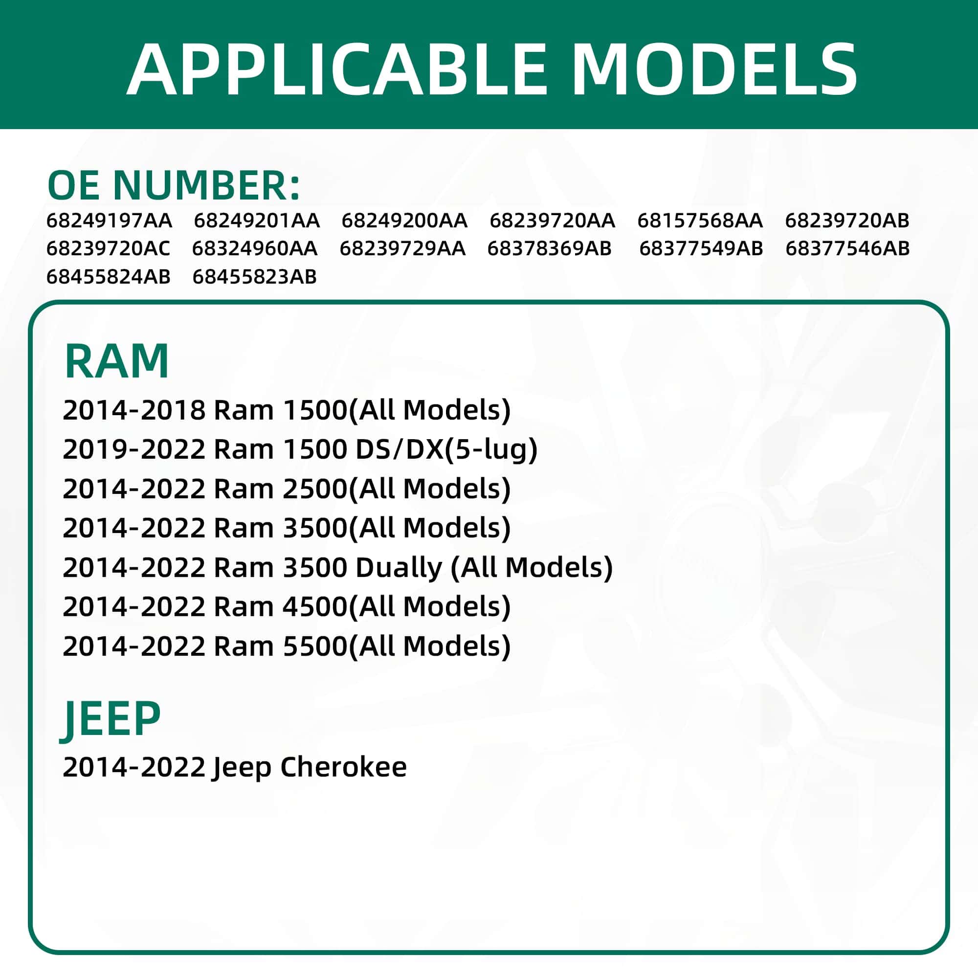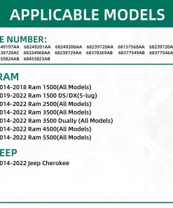 1. PREFECT REPLACEMENT El TPMS es compatible con JEEP CHEROKEE 2014-2021, RAM 150 (DS/DX (5-tornillos) 2014-2022, RAM 2500 2014-2022, RAM 3500 2014-2021, RAM 4500 2014-2022, RAM 5500 2014-2022 (Nota: los sensores TPMS no son compatibles con RAM 1500 DT-(6-tornillos) 2019-2022, ver imagen para modelo específico) Por favor, verifique la compatibilidad antes de la compra para evitar cargos de instalación innecesarios.