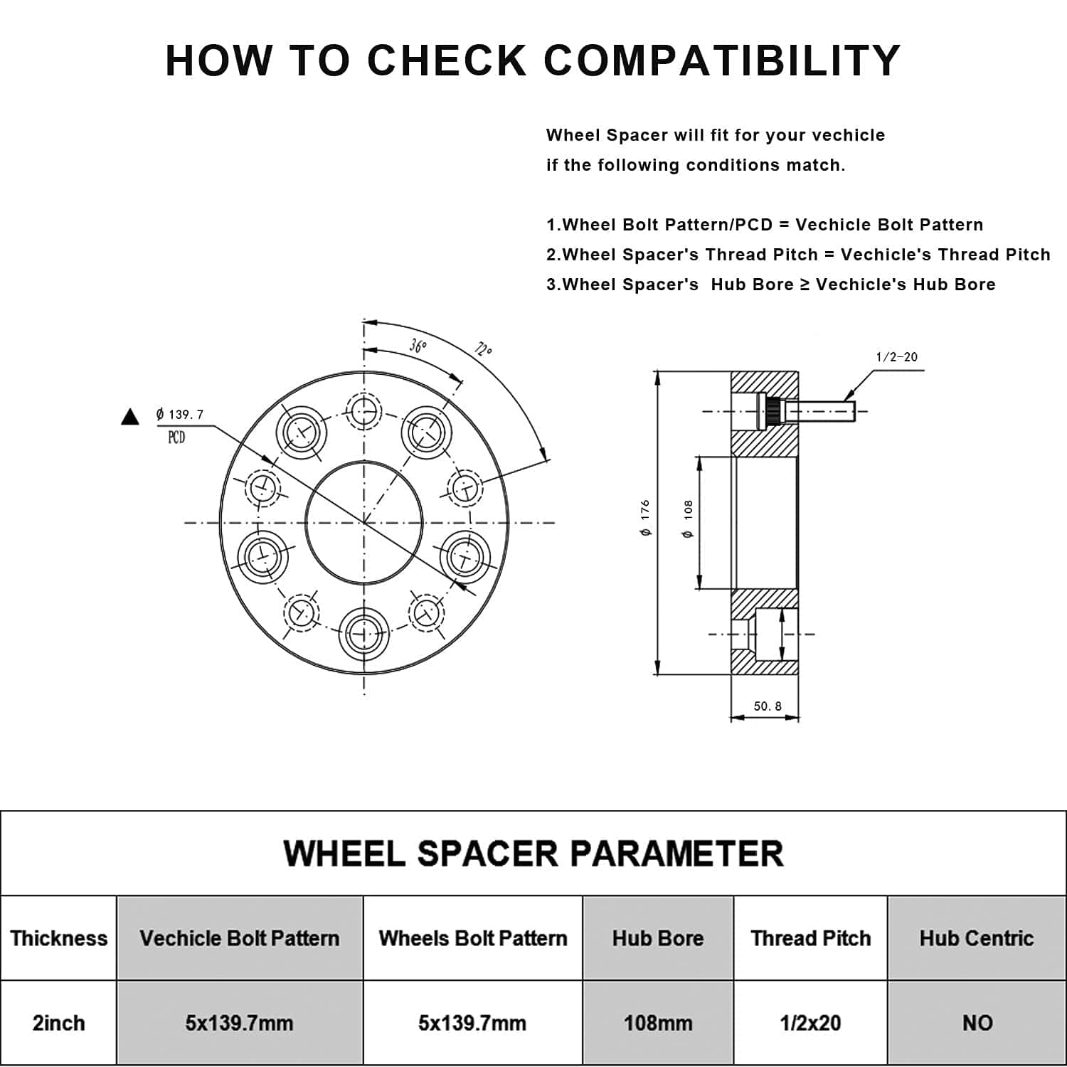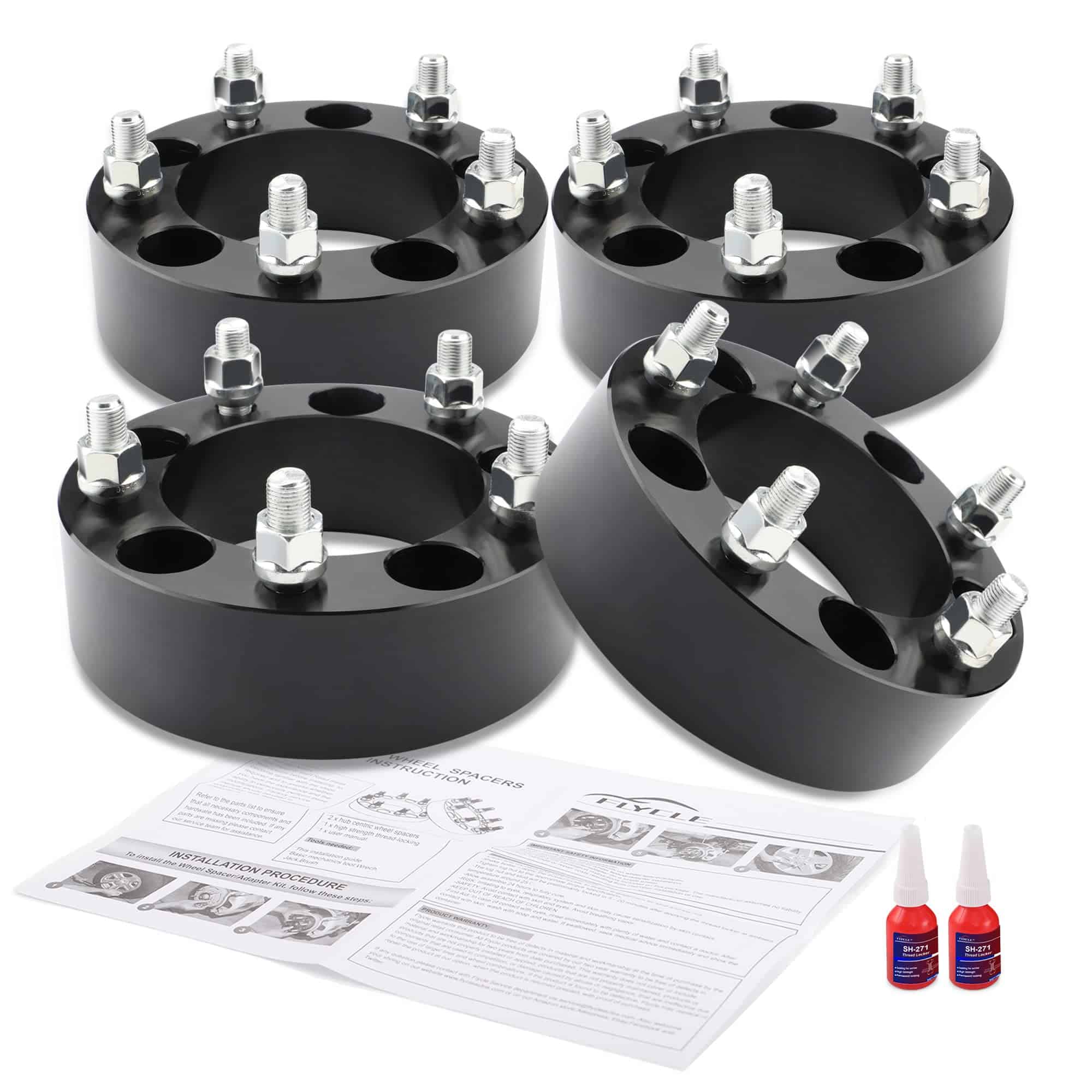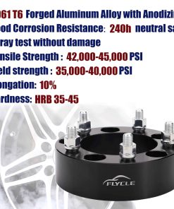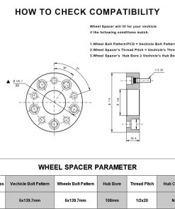 Cantidad: Cuatro (4) Grosor: 2″ (50.8mm) Patrón de perno del vehículo: 5×5.5″ o 5×139.7mm Diámetro del centro: 108mm Paso de rosca del perno/tuerca: 1/2×20 Material: Aluminio de grado aeroespacial T6 con pernos de grado 12.9