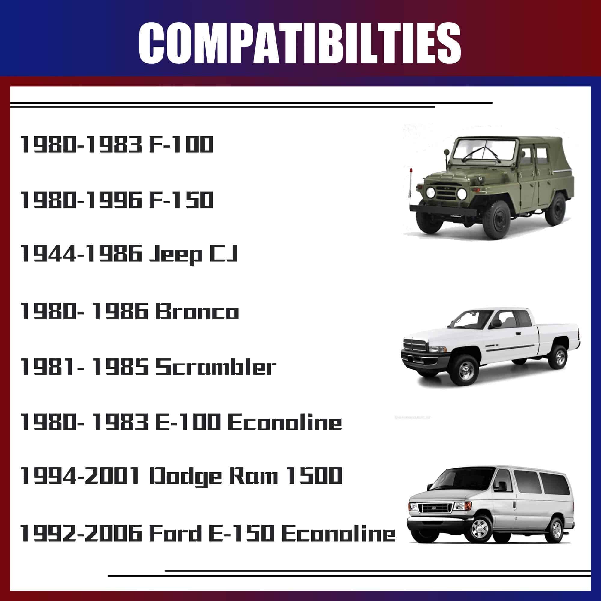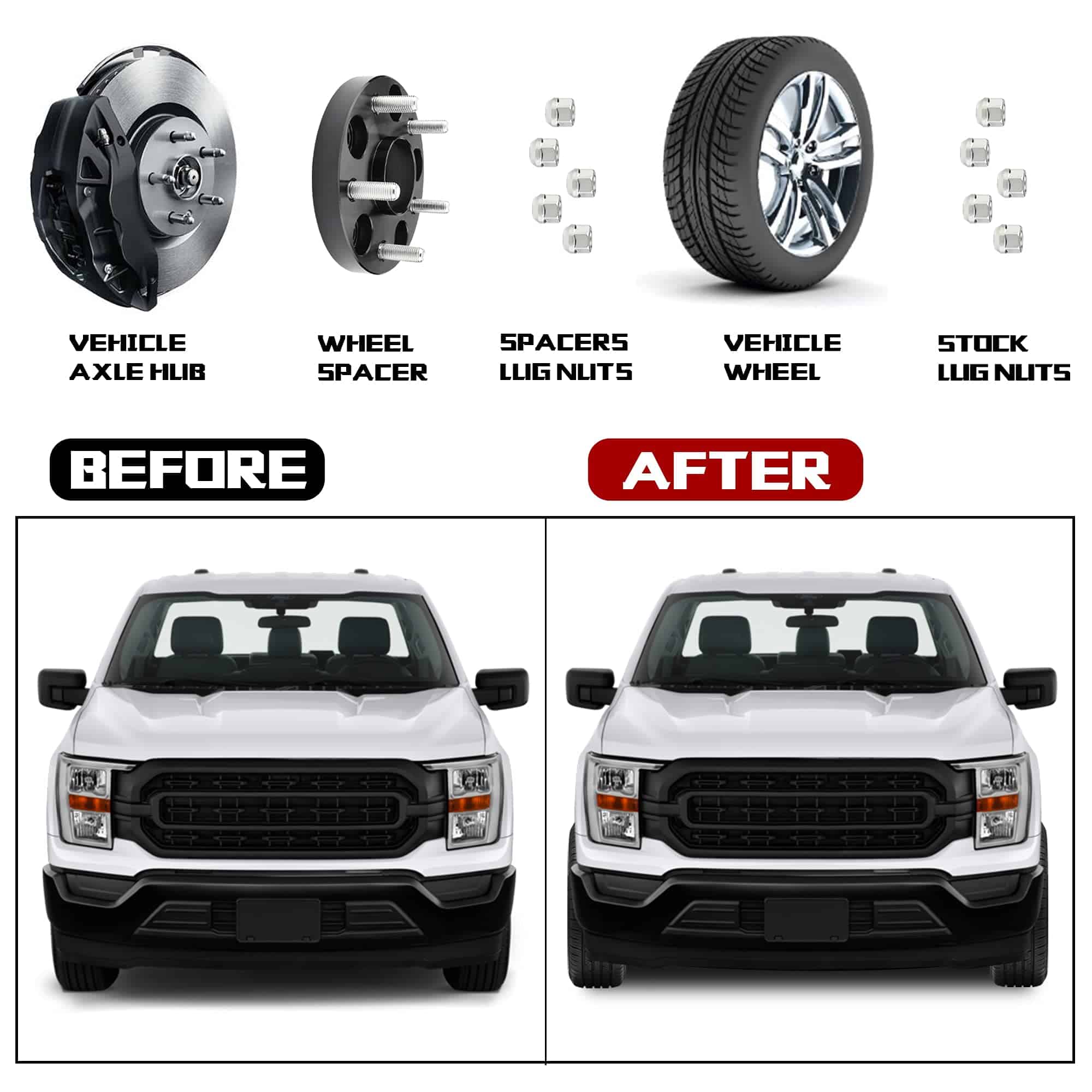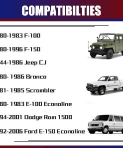 Especificaciones del Separador de Rin Cantidad: Cuatro (4) Grosor: 2″ (50.8mm) Patrón de perno del vehículo: 5×5.5″ o 5×139.7mm Patrón de perno del rin: 5×5.5″ o 5×139.7mm Diámetro central: 108mm Paso de rosca del perno/tuerca: 1/2×20 Material: Aluminio de Grado Aeroespacial T6 con pernos de Grado 12.9 PAQUETE INCLUYE 4 separadores de rin (2″ por unidad) 2 bloqueadores de roscas de alta resistencia (rojo) 2 manual del usuario. Observaciones: Una caja de color incluye 2 separadores de rin, 1 bloqueador de roscas y 1 manual del usuario. Función: Aumentar el espacio para rines más grandes o más anchos y mejorar las características/manejo y espacio para frenos. Dándole a su vehículo una apariencia más agresiva. Compatibilidad 1944-1986 Jeep CJ 1994-2001 Dodge Ram 1500 1992-2006 Ford E-150 Econoline 1980-1983 F-100 1980-1996 F-150 1980-1983 E-100 Econoline 1980-1986 Bronco 1981-1985 Scrambler INFORMACIÓN IMPORTANTE DE SEGURIDAD Nunca modifique el separador de rin. Nunca quite los pernos de fábrica instalados en el separador de rin. Nunca use una llave de impacto para la instalación del separador de rin. No apile múltiples separadores en una sola rueda.