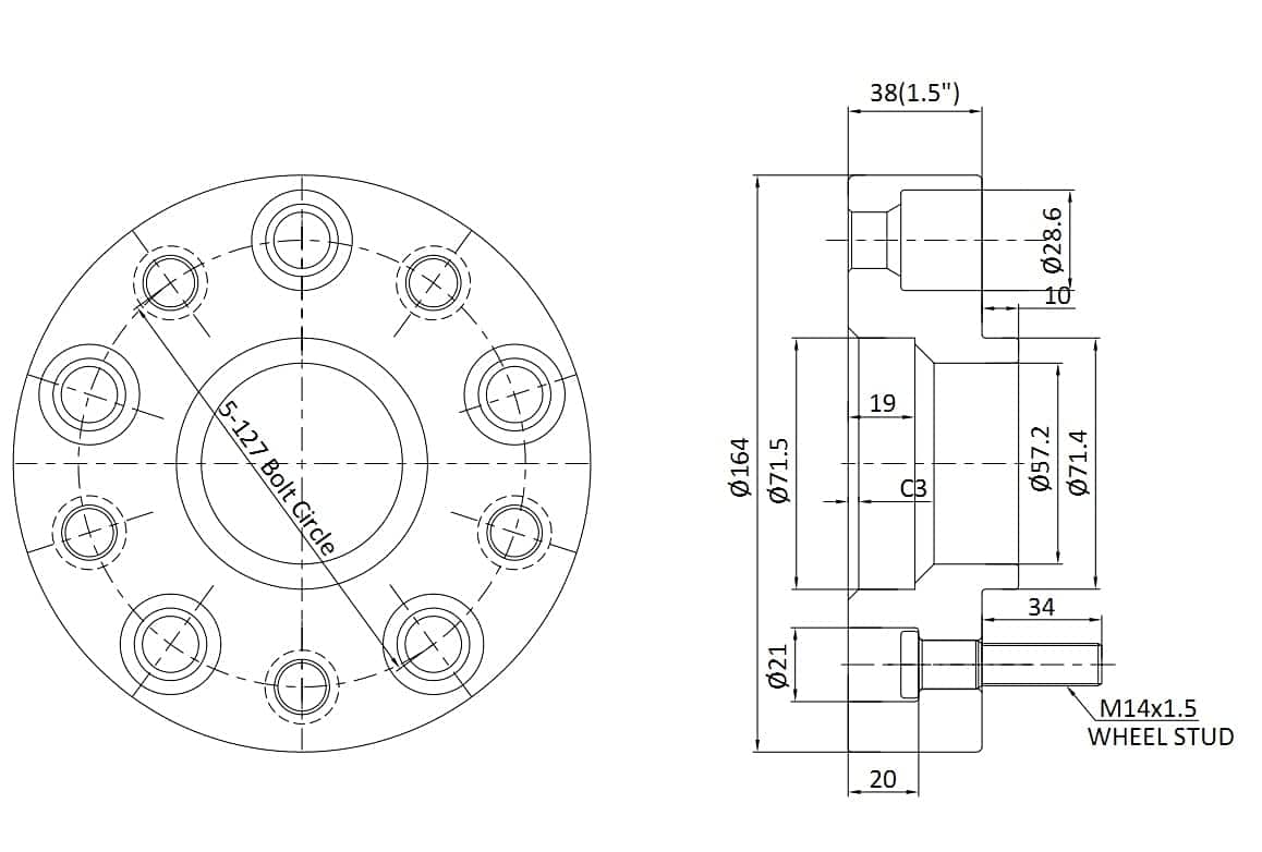 Especificación: 5X5″ (5X127mm) a 5X5″ (5X127mm) PCD (Patrón de perno de vehículo/rueda), Paso de rosca SAE M14X1.5 (34 0.3 mm de longitud de rosca), 71.5 mm de diámetro de hub, 4pcs 1.5″