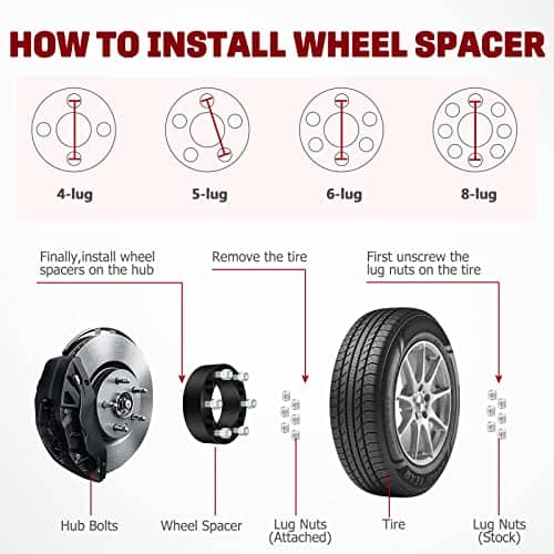 4. INSTALACIÓN – Se recomienda no usar una llave de impacto al instalar los separadores de rueda, puede atornillar los pernos a mano o instalarlos con una llave de torsión. Antes de instalar la rueda, equilibre la misma y elimine el polvo o suciedad. Se recomienda usar pegamento para roscas y guantes profesionales durante la instalación. Vuelva a apretar todas las tuercas de los birlos después de conducir 50-100 millas, y vuelva a apretarlas nuevamente después de conducir 2000-3000 millas.
