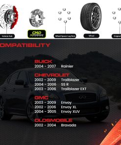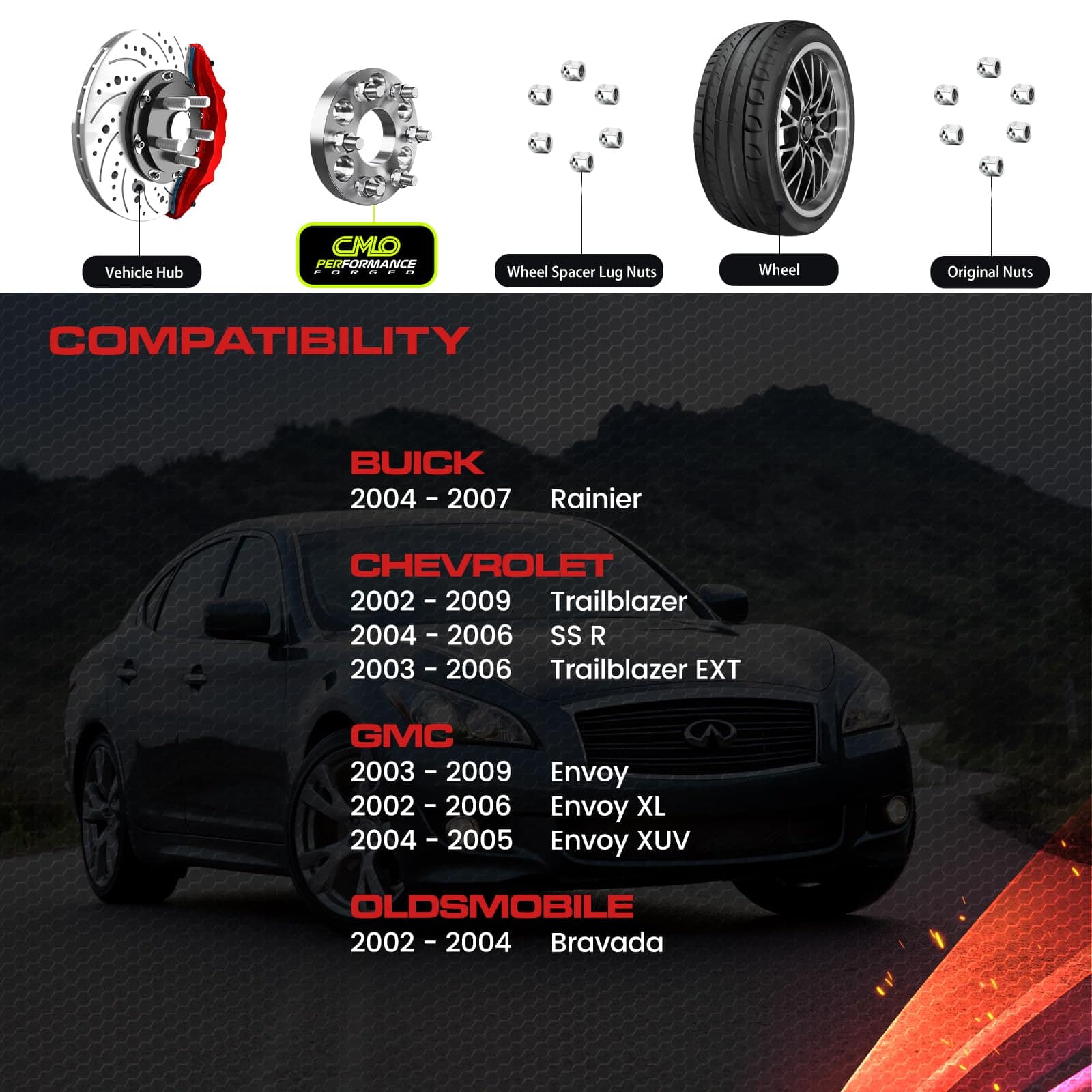 Nuestros espaciadores de rueda están diseñados para la corrección de desplazamiento, mejorando el rendimiento en la conducción y realzando la apariencia general del vehículo. Fabricados con aluminio de alta calidad 6061 T-6, conocido por su resistencia a la tracción y durabilidad. Los espaciadores están ensamblados con pernos de acero al carbono de clase 10.9 (grado 8 SAE) con tratamiento térmico. Respaldados por nuestra garantía de reemplazo de 2 años contra cualquier defecto funcional. Compatible con Buick Rainier 2004-2007, Chevy Trailblazer 2002-2009, Trailblazer EXT 2003-2006, SSR 2004-2006, GMC Envoy 2003-2009, Envoy XL 2002-2006, Envoy XUV 2004-2005, y Oldsmobile Bravada 2002-2004.