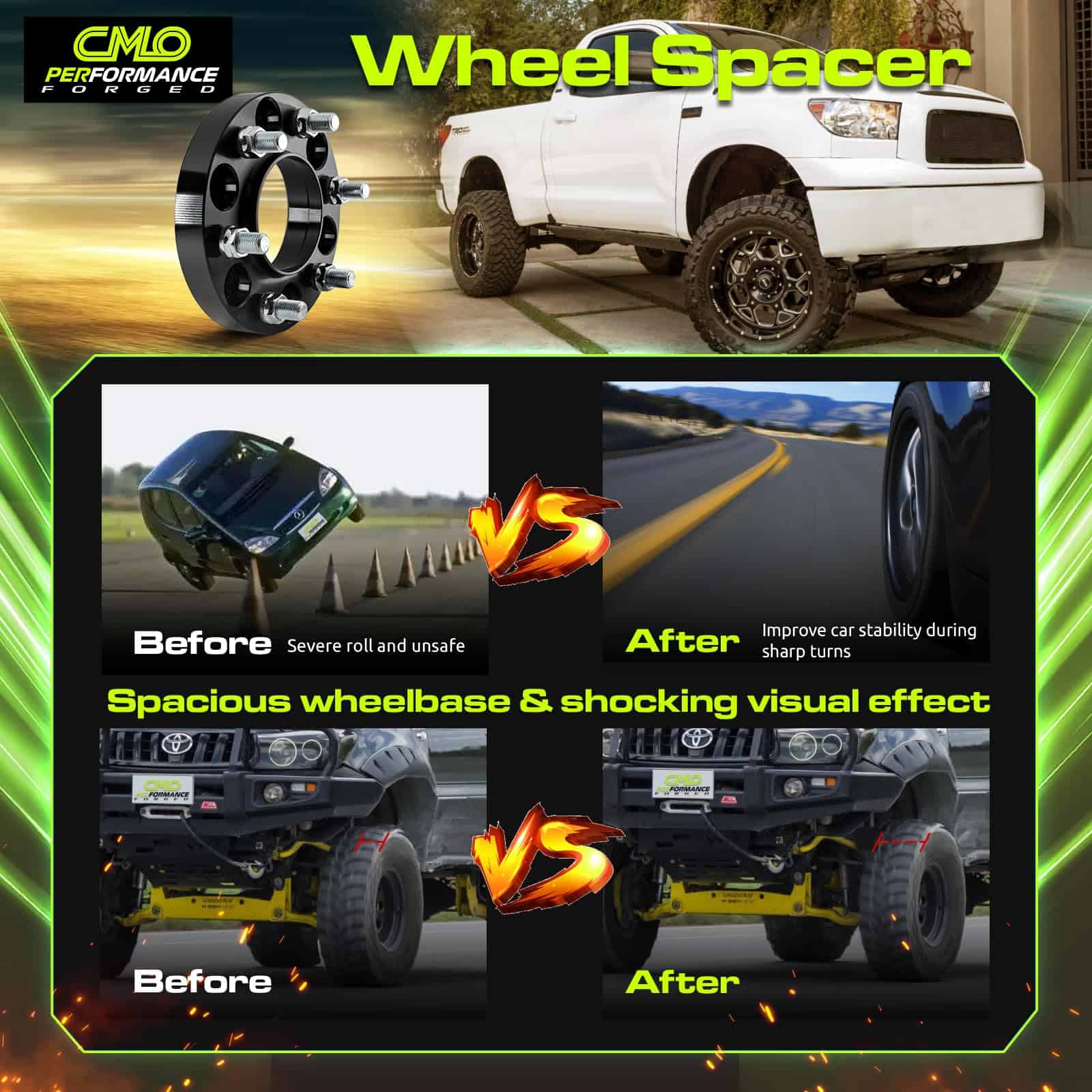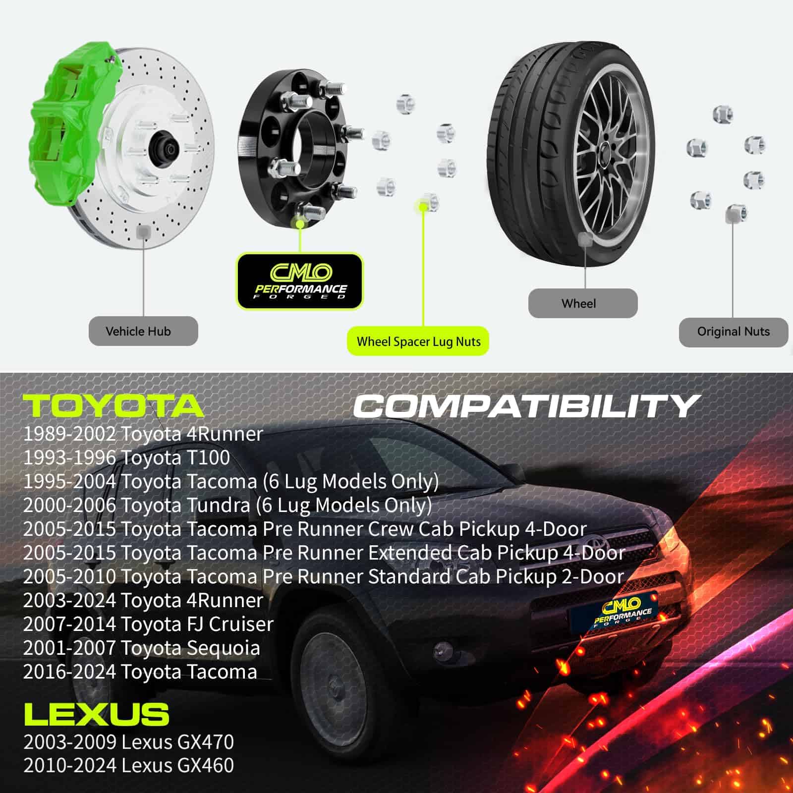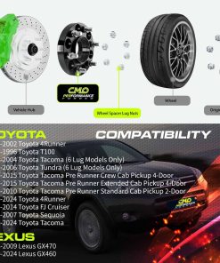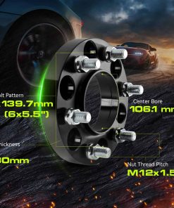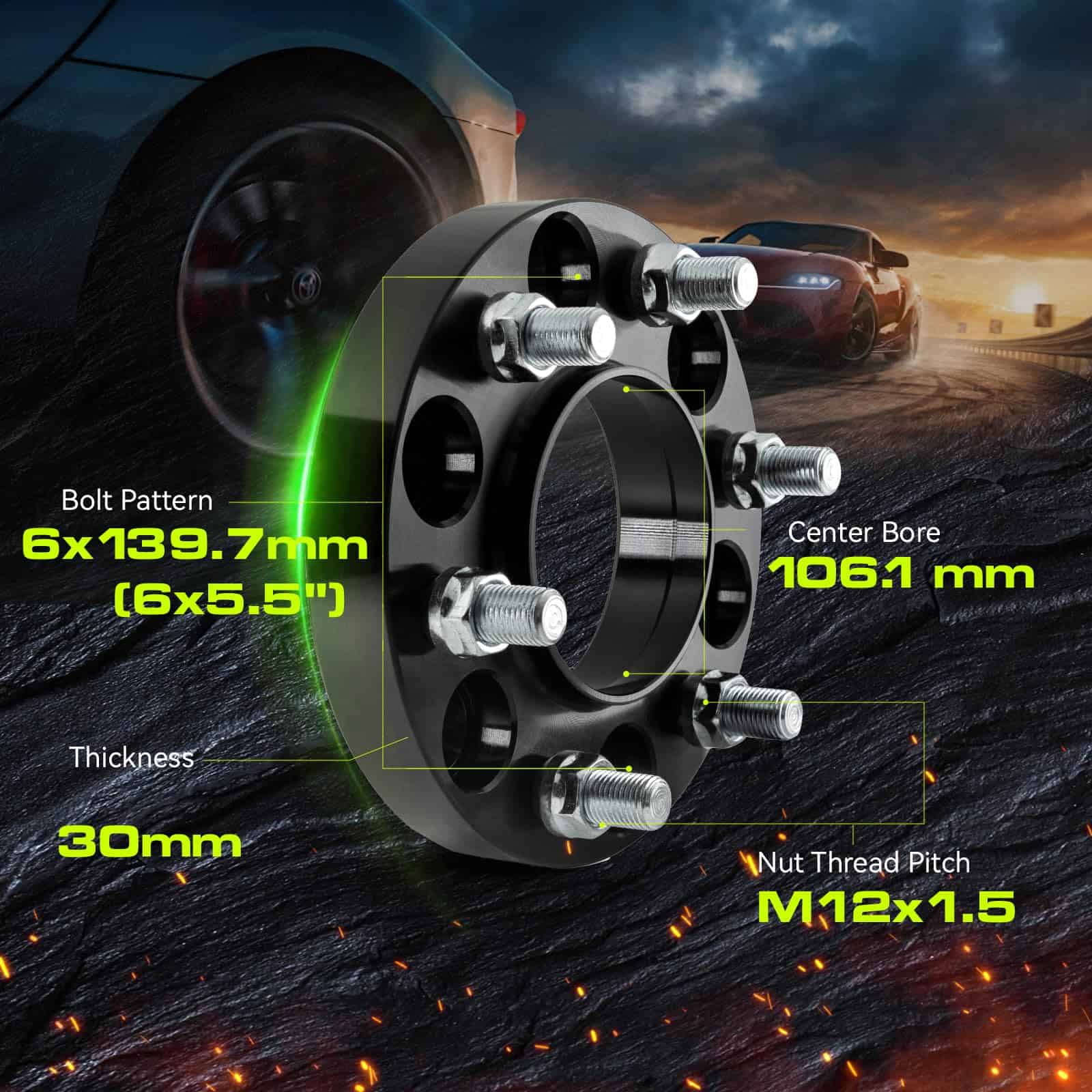 Producto Detallado Cantidad: 2 piezas. Diseño de centro Hubcentric anodizado en negro e instalación con pernos para aplicación de 6×139.7 106mm de diámetro central y 12×1.5. Ancho: 30mm por lado. Beneficios Nuestros espaciadores de rueda están hechos para la corrección del desplazamiento, mejorando el rendimiento en el manejo y realzando la apariencia general. Calidad Hechos con aluminio de alta calidad 6061 T-6, el material es conocido por su resistencia a la tracción y durabilidad. Los espaciadores están ensamblados con pernos de acero al carbono de grado 10.9 (grado 8 SAE) con tratamiento térmico. Los espaciadores de rueda Customadeonly también cuentan con nuestra garantía de producto de 2 AÑOS contra cualquier defecto funcional. Compatibilidad Compatible con Land Cruiser 1969-1997, Pick Up 1980-1995, 4Runner 1984-2008 (solo modelos de 6 pernos), T100 1993-1996, Tacoma 1995-2008 (solo modelos de 6 pernos), Tundra 2000-2006 (solo modelos de 6 pernos).