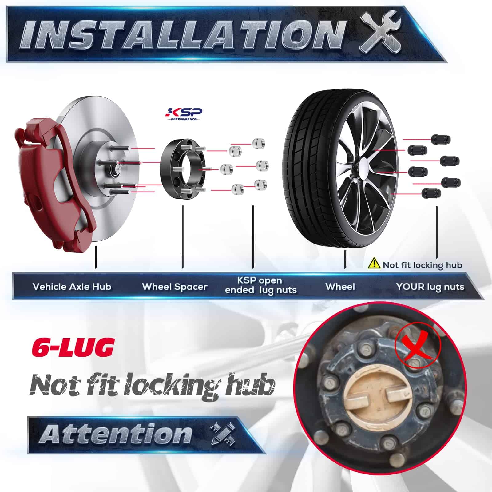 b KSP Performance Wheel Spacers Adapters W/H High Quality Guarantee r Por favor ten en cuenta que algunos vehículos tienen tornillos cortos en sus cubos, especialmente Toyota Tacoma, 4Runner, FJ Cruiser, etc. Para instalar de manera segura este separador de rueda, se pueden tomar una de las siguientes formas de resolver este problema. una es cambiar a tornillos más largos, otra es comprar tuercas estendidas con cono br b ESPECIFICACIONES: r /p Grosor: 1.25 pulgadas | 32 mm br Patrón de Pernos del Vehículo: 6×5.5» | 6×139.7 mm br Patrón de Pernos de Rueda: 6×5.5» | 6×139.7 mm br Rosca: M12X1.5 br Buje/Centro: 106 mm b COMPATIBILIDAD:(Por favor verifica la compatibilidad de tu vehículo ANTES de comprar. Si no estás seguro, por favor envíanos mensajes): r 1995-2015 Toyota Tacoma 4WD y Pre-Runner 2WD br 2016-2018 Toyota Tacoma br 2000-2006 Toyota Tundra br 1995-2018 Toyota 4Runner br 2007-2018 Toyota FJ Cruiser br 2004-2018 Toyota Ventury br 2001-2007 Toyota Sequoia br 2005-2018 Toyota Fortuner br 1990-1995 Toyota Land Cruiser br 2003-2009 Lexus GX470 br 2010-2017 Lexus GX460 br 2011-2014 Lexus HL450 br b AVISOS IMPORTANTES: p – Se recomienda que los compradores tomen las medidas adecuadas para garantizar que al añadir el separador, su rueda/neumático no golpee el guardabarros u otra parte del vehículo br – Asegúrate de ajustar las tuercas a las especificaciones del fabricante br – Evita usar una llave de impacto; el uso incorrecto puede causar daños a los componentes br – Vuelve a ajustar todas las tuercas después de 50-100 millas de conducción, y luego nuevamente cada 2-3,000 millas. br – No se aceptan devoluciones ni intercambios una vez instalado br – La instalación debe ser realizada solo por un profesional capacitado br