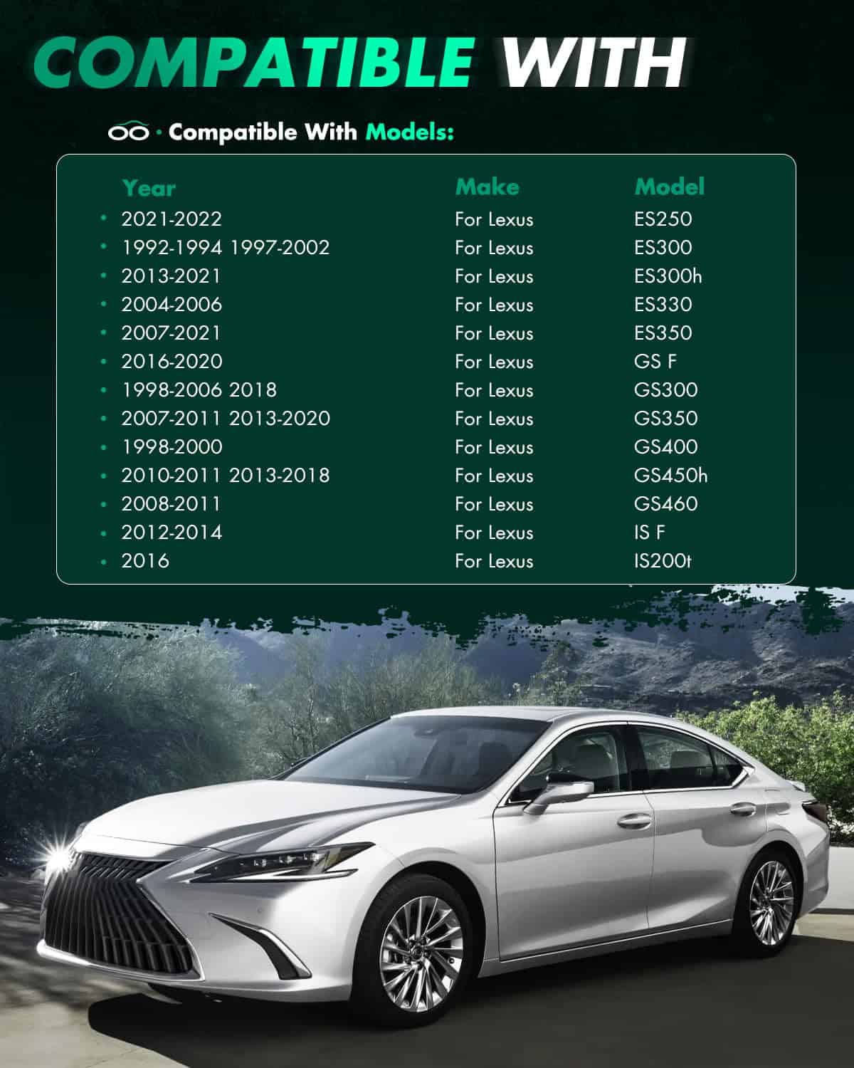 1. Ajuste de separadores de rueda de 5×4.5 para Toyota Camry, Toyota Highlander, Toyota Sienna, Toyota Avalon, Toyota Corolla iM, Toyota Matrix, Toyota Mirai, Toyota MR2, Toyota Solara, Toyota Supra, Toyota Venza, Lexus ES250, Lexus ES300, Lexus ES300h, Lexus ES330.