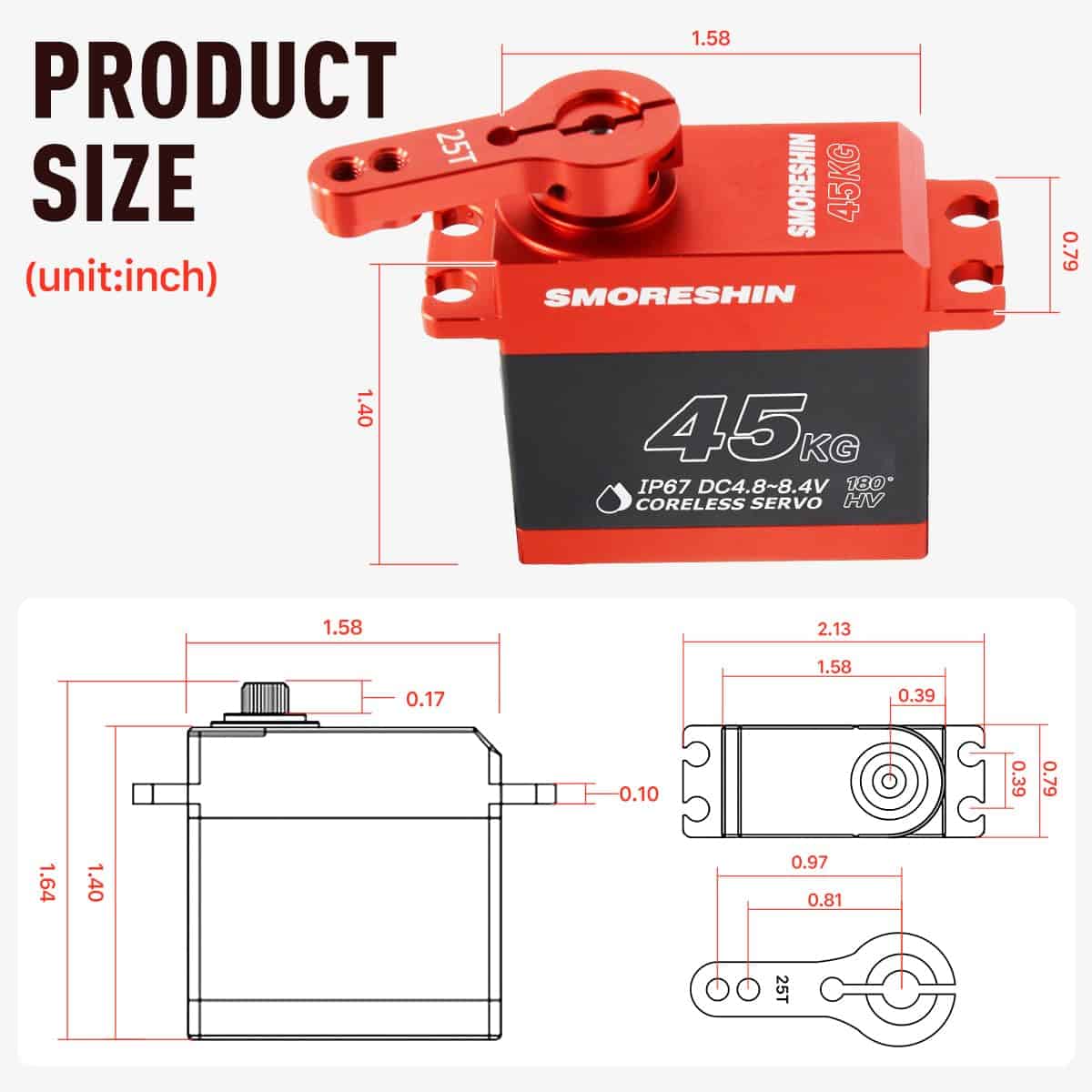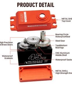 Voltaje de funcionamiento: 4.8-8.4V. El Par Máximo puede alcanzar 38kg.cm @ 8.4V, 34kg.cm @ 4.8V. Velocidad Alta: 0.15sec/60 @ 4.8V, 0.17sec/60 @ 8.4V. Los Engranajes de Metal Completo proporcionan durabilidad y confiabilidad, exhiben una resistencia superior a la vibración e impacto, lo que los hace adecuados para aplicaciones que requieren un rendimiento estable en entornos exigentes. Equipado con un potenciómetro de alta precisión y un Chip Digital de alta resolución, este Servo ofrece una estabilidad excepcional, una resistencia robusta a la interferencia, tiempos de respuesta rápidos y control preciso. La Carcasa de Aluminio CNC disipa eficientemente el calor generado por los componentes electrónicos internos, evitando el sobrecalentamiento y reduciendo el ruido, mejorando el rendimiento y la vida útil del Servo. Clasificación IP67 a prueba de agua, la carcasa con clasificación IP67, combinada con tornillos sellados de goma impermeables, asegura que el Servo permanezca desprotegido cuando se sumerge brevemente en agua hasta 1M de profundidad a temperatura y presión normales.