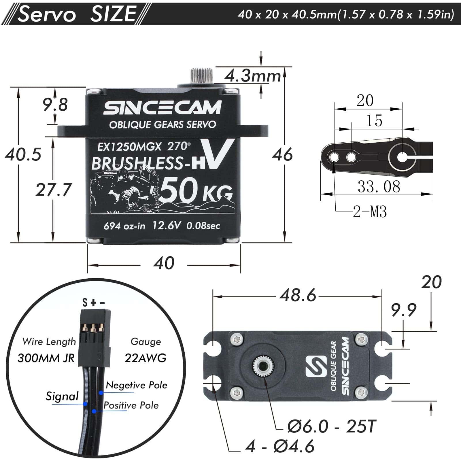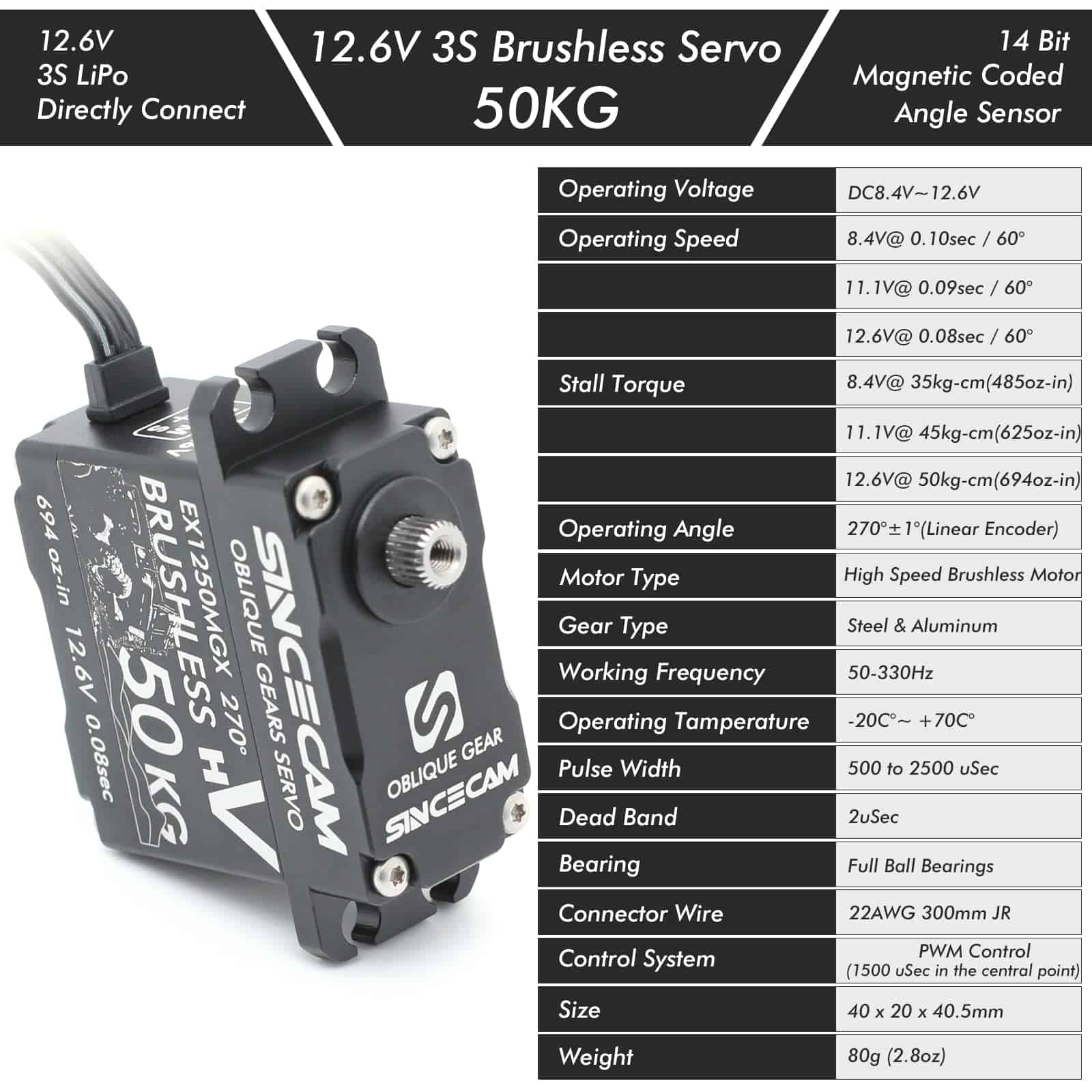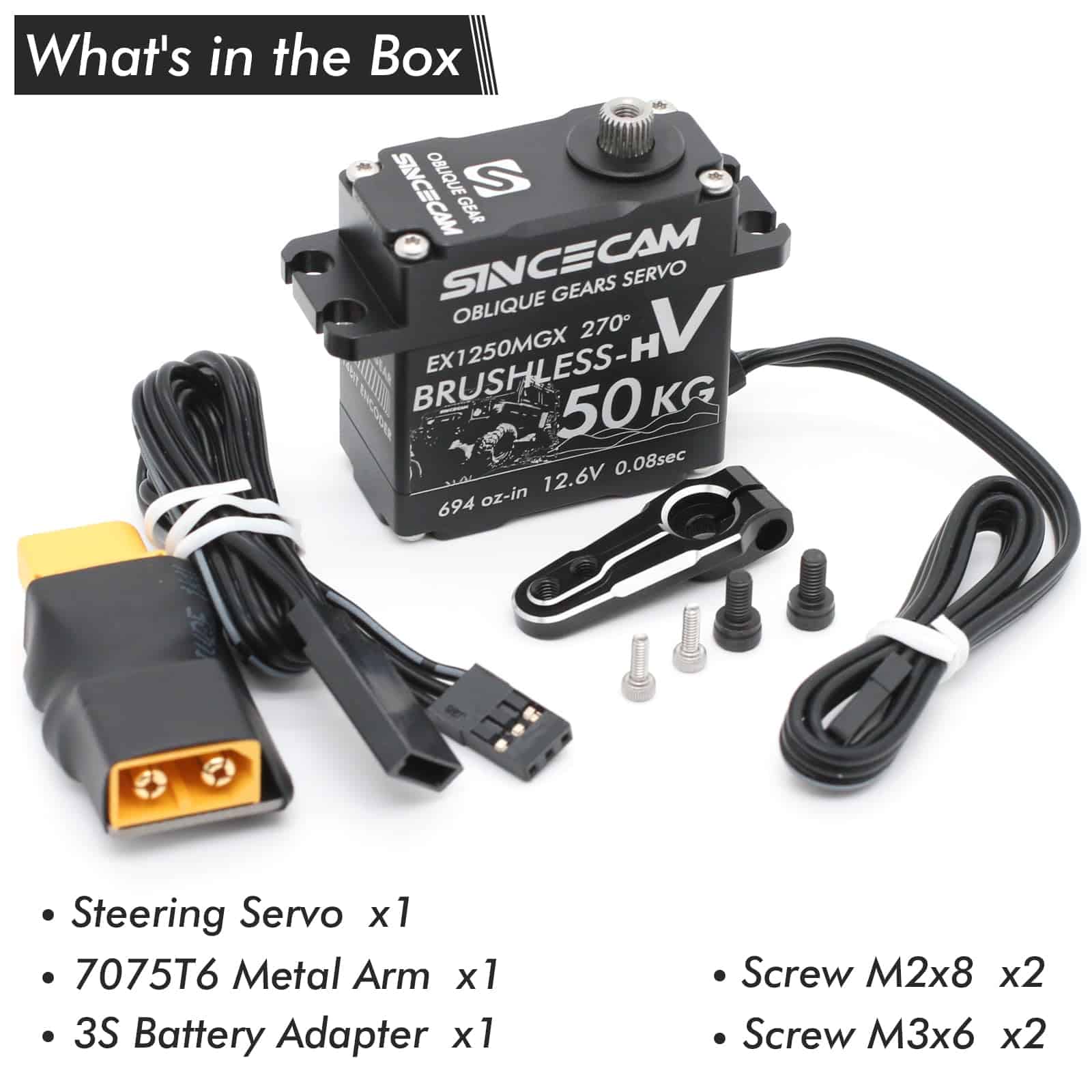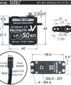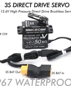1. Alto Torque: Servo SC1250MGX de 12V con hasta 50kg-cm de torque @12.6V y velocidad de hasta 0.08sec/60 @12.6V. Conectado directamente a baterías de 3S Li-po a través de adaptador de batería, sin necesidad de BEC.