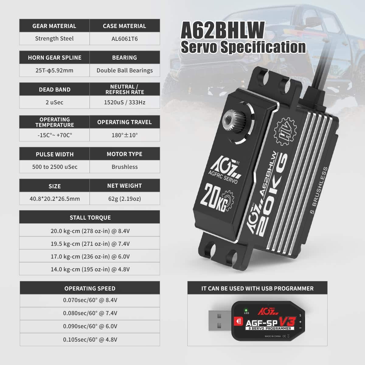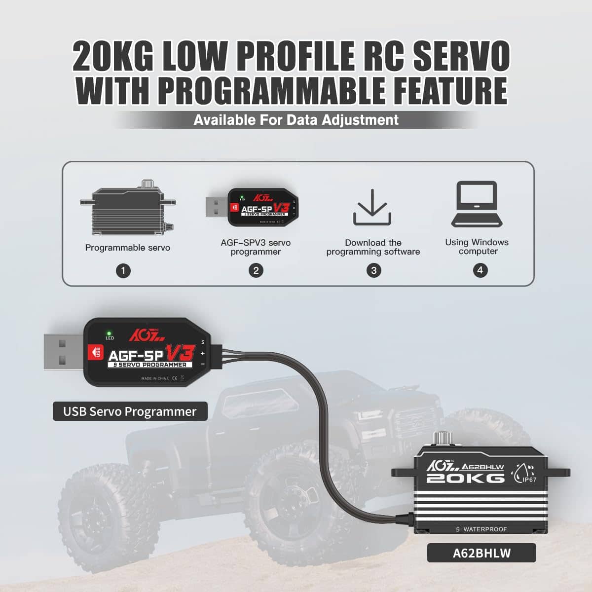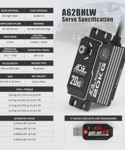 1. Programable: Este servo de alto par mejorado es programable mediante el programador de servos AGF-SPV3 (no incluido) para cambiar el par, la velocidad, el ángulo, la inversión, la posición neutral, etc.