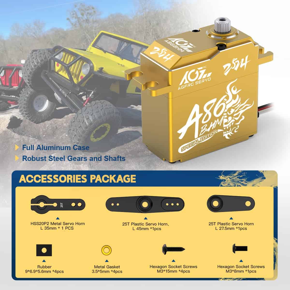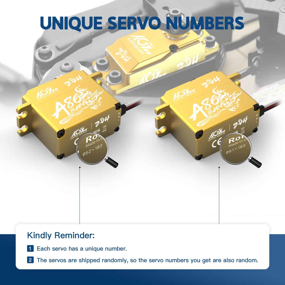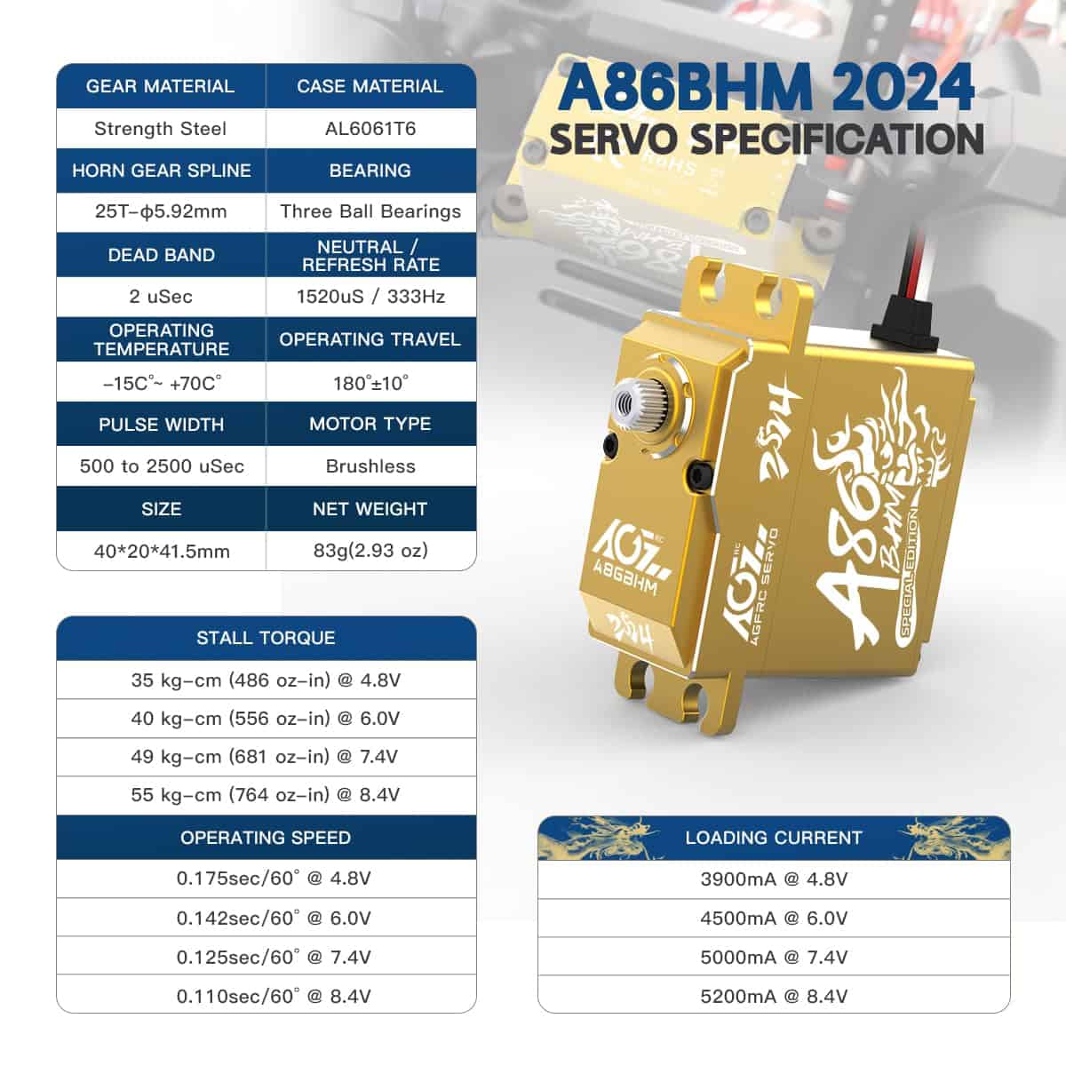Este A86BHM 2024 es un estilo especial para la celebración de la tienda 2024 AGFRC con carcasa dorada y tiene una cabeza de dragón grabada con láser, y cada servo tiene un número diferente, pero el número es aleatorio. Así que cada persona tiene su propio servo único y exclusivo.