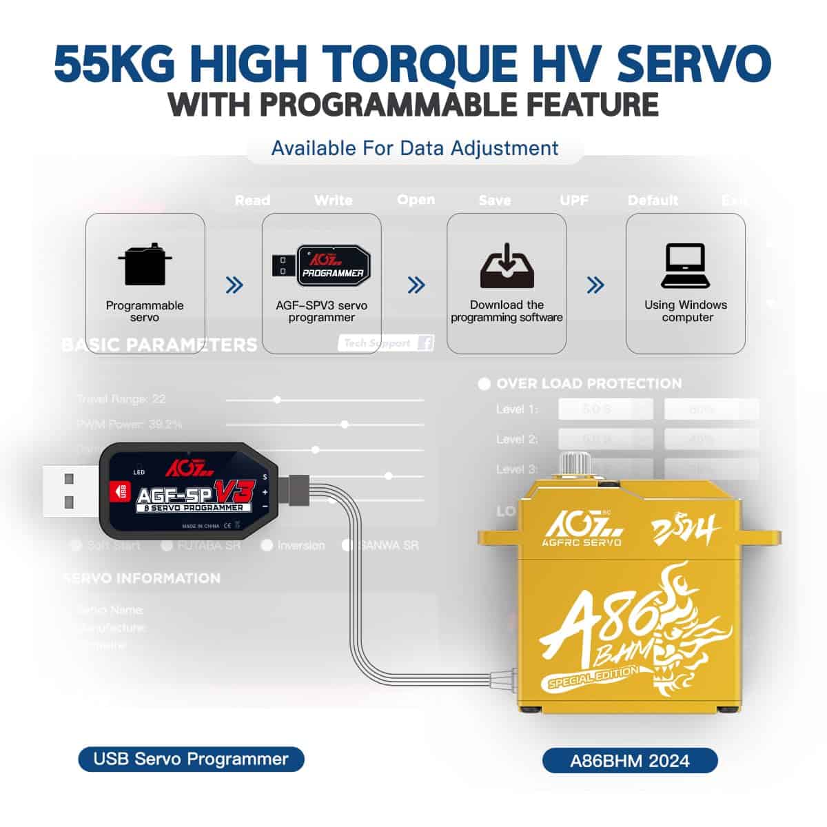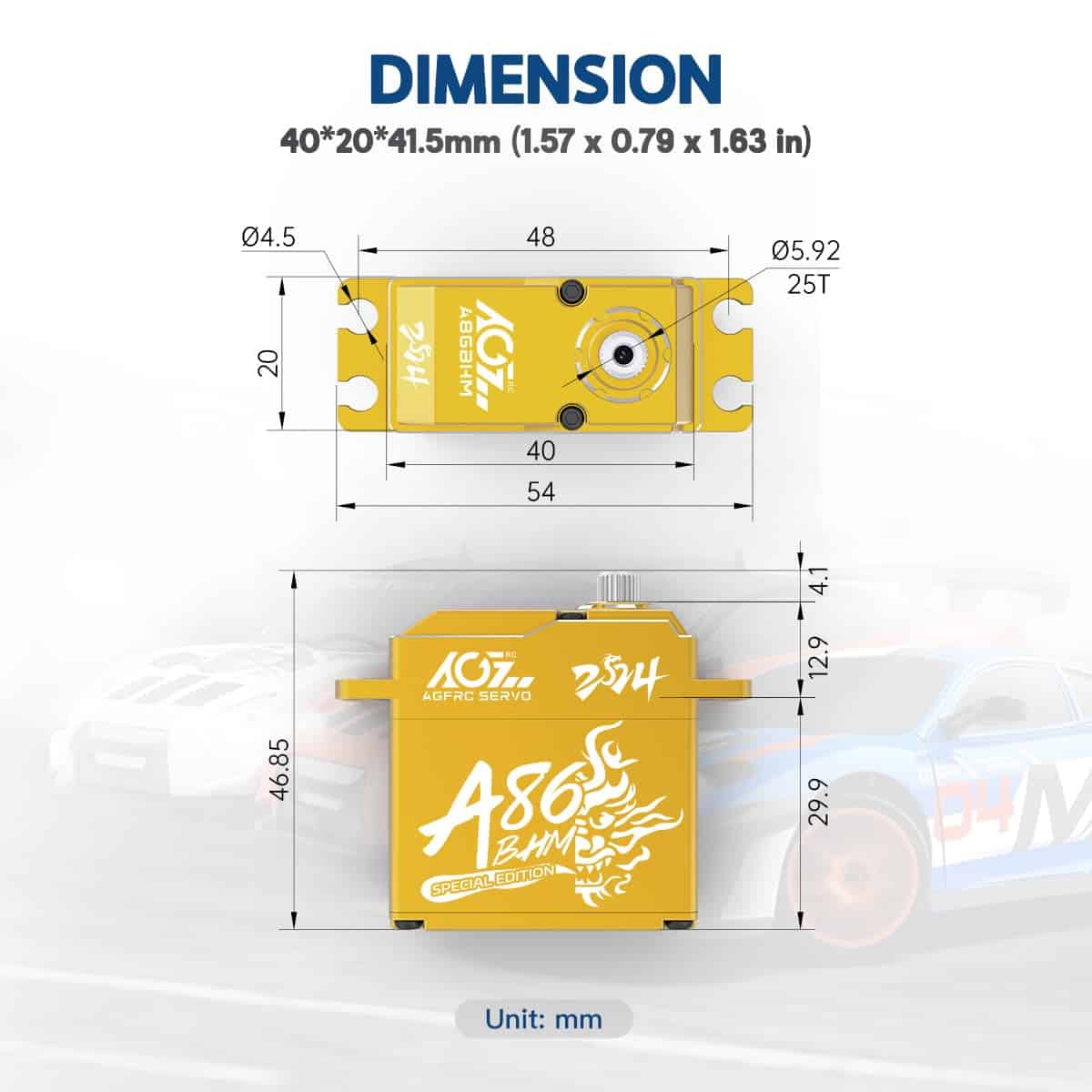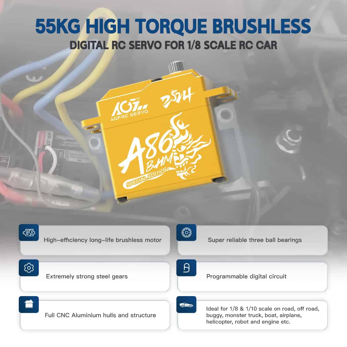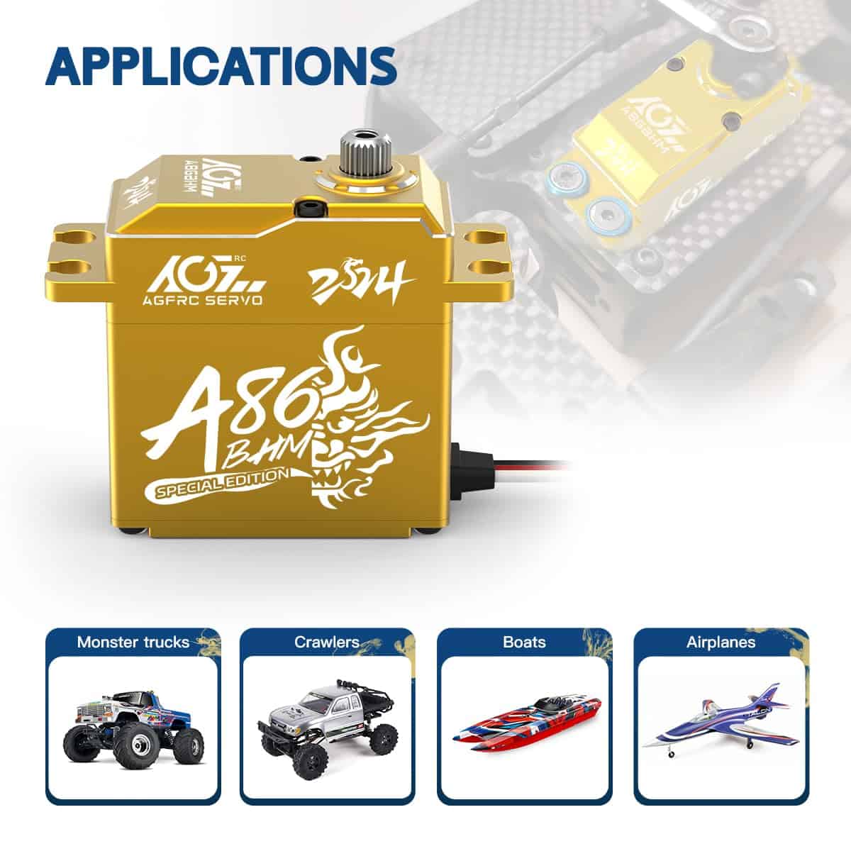 Este A86BHM 2024 es un estilo especial para la celebración de la tienda 2024 AGFRC con carcasa dorada y tiene una cabeza de dragón grabada con láser, y cada servo tiene un número diferente, pero el número es aleatorio. Así que cada persona tiene su propio servo único y exclusivo.