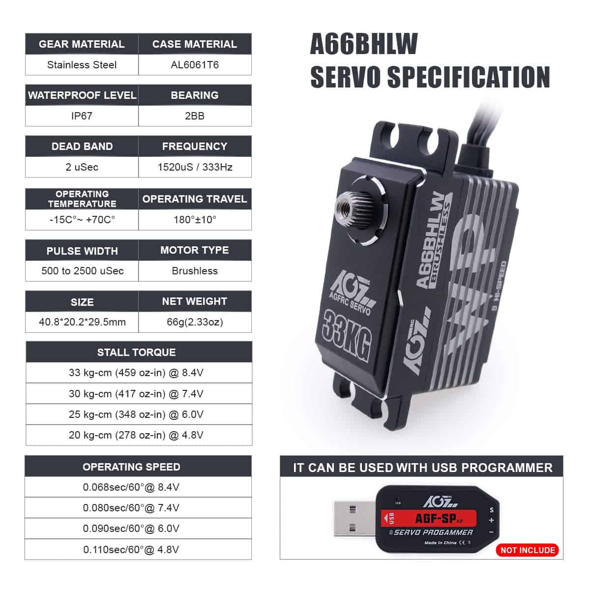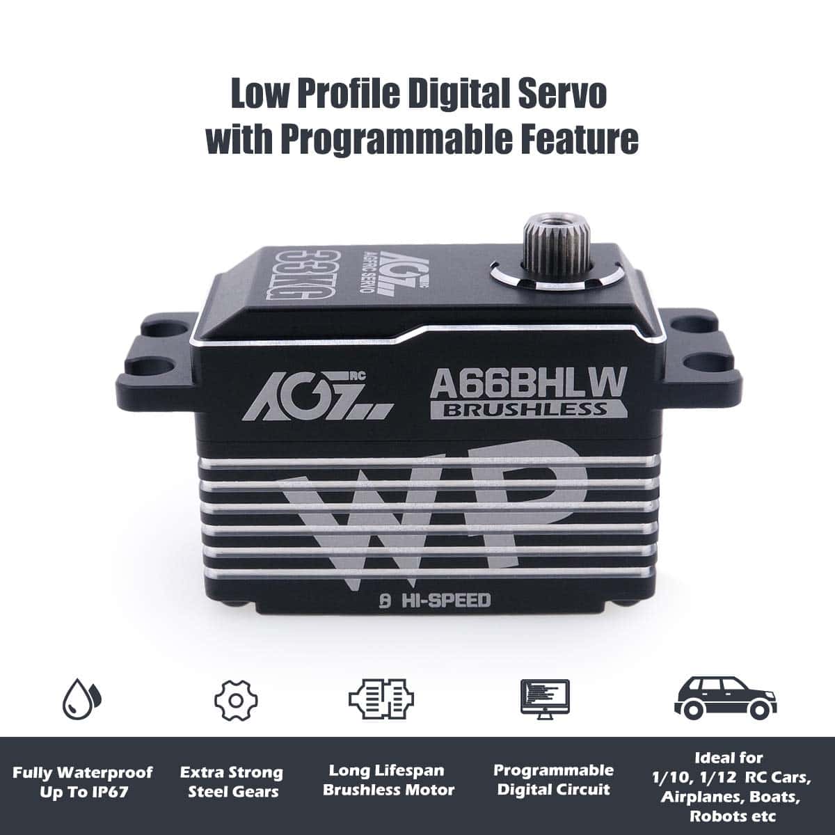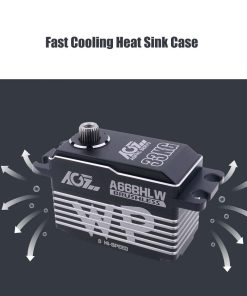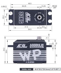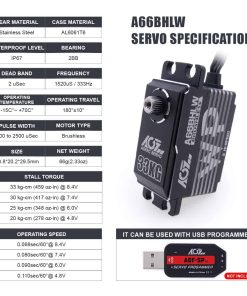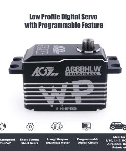 Servo digital AGFRC de perfil bajo 33KG de alto par de torsión a prueba de agua con engranaje de metal programable para modelo RC 1/10, ángulo de control 180� (A66BHLW). Características: 1. Actualización y Programable – El servo digital impermeable de alto par de torsión mejorado es programable mediante AGF-SPV2/3 servo programador (no incluido) para cambiar el par de torsión, velocidad, ángulo, inversión, etc. 2. Diseño a Prueba de Agua – El motor de servo digital de dirección AGFRC utiliza tecnología de producción de alta precisión para reducir la desviación de producción y mejorar la estanqueidad del producto. Con diseño impermeable IP67, que hace que el servo siga funcionando normalmente cuando entra agua en el servo. Dimensiones: 40.8 x 20.2 x 29.5 mm (1.61 x 0.80 x 1.16 pulgadas). 3. Alta Precisión y Rendimiento – Linealidad y precisión avanzadas con sensor magnético de ángulo de precisión, estable, bajo ruido, impermeable IP67, a prueba de polvo. Equipado con engranaje de acero resistente, la carcasa de aluminio CNC completo puede mejorar la disipación de calor, con bajo consumo de energía. 4. Alto Par de Torsión y Velocidad – El par máximo del servo de cuerpo corto es de hasta 33 kg-cm (458 oz-in) @ 8.4V. Velocidad de funcionamiento: 0.068seg/60 @ 8.4V. Voltaje de funcionamiento: 4.8V ~ 8.4V, Peso: 66g (2.33oz). 5. Aplicación – Ideal para coches de turismo 1/10, 1/12, coches de carreras en carretera, aviones, superficie a escala 1/10, barcos, aplicaciones de aviones.