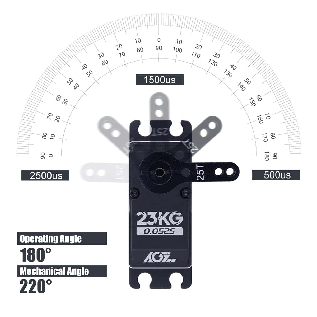 4. Aplicación & Rotación de 180 Grados – Ideal para buggy 1/8 1/10, camiones monstruo, coche RC, en carretera, fuera de carretera, avión, helicóptero, etc. El ángulo predeterminado es de 180 grados cuando el rango de señal es de 500uSec a 2500uSec, después de la programación, se puede reducir o aumentar.