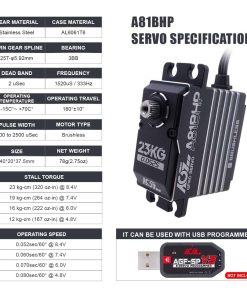 3. Súper Velocidad & Alto Par – La máxima velocidad de este servo de dirección es de hasta 0.052Sec/60 @8.4V y un par de hasta 23 kg-cm (320 oz-in) @8.4V.