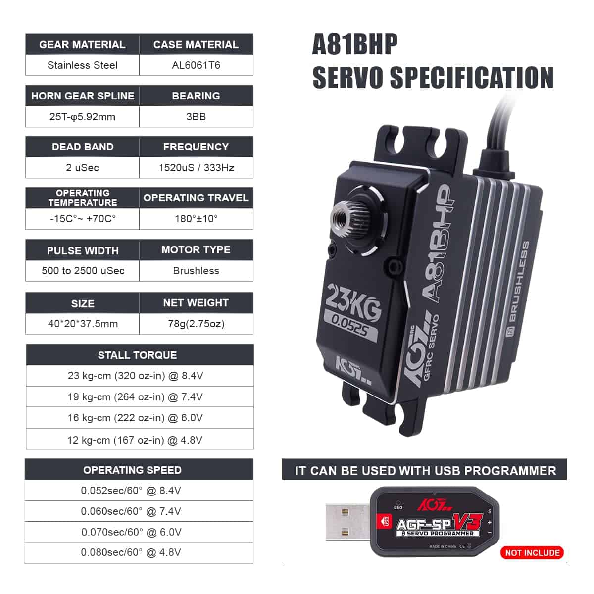 1. Programable – Este servo de alta velocidad es programable mediante el programador de servo AGF-SPV3 (no incluido) para cambiar el par, la velocidad, el ángulo, la inversión, etc. Por favor, leer las instrucciones cuidadosamente antes de usar.