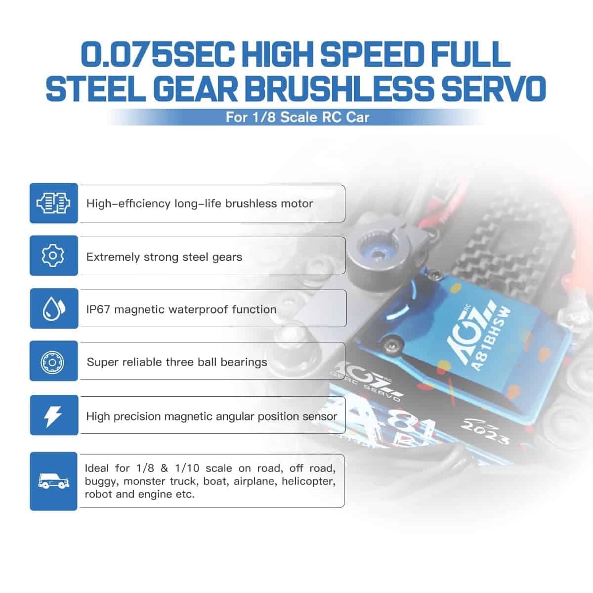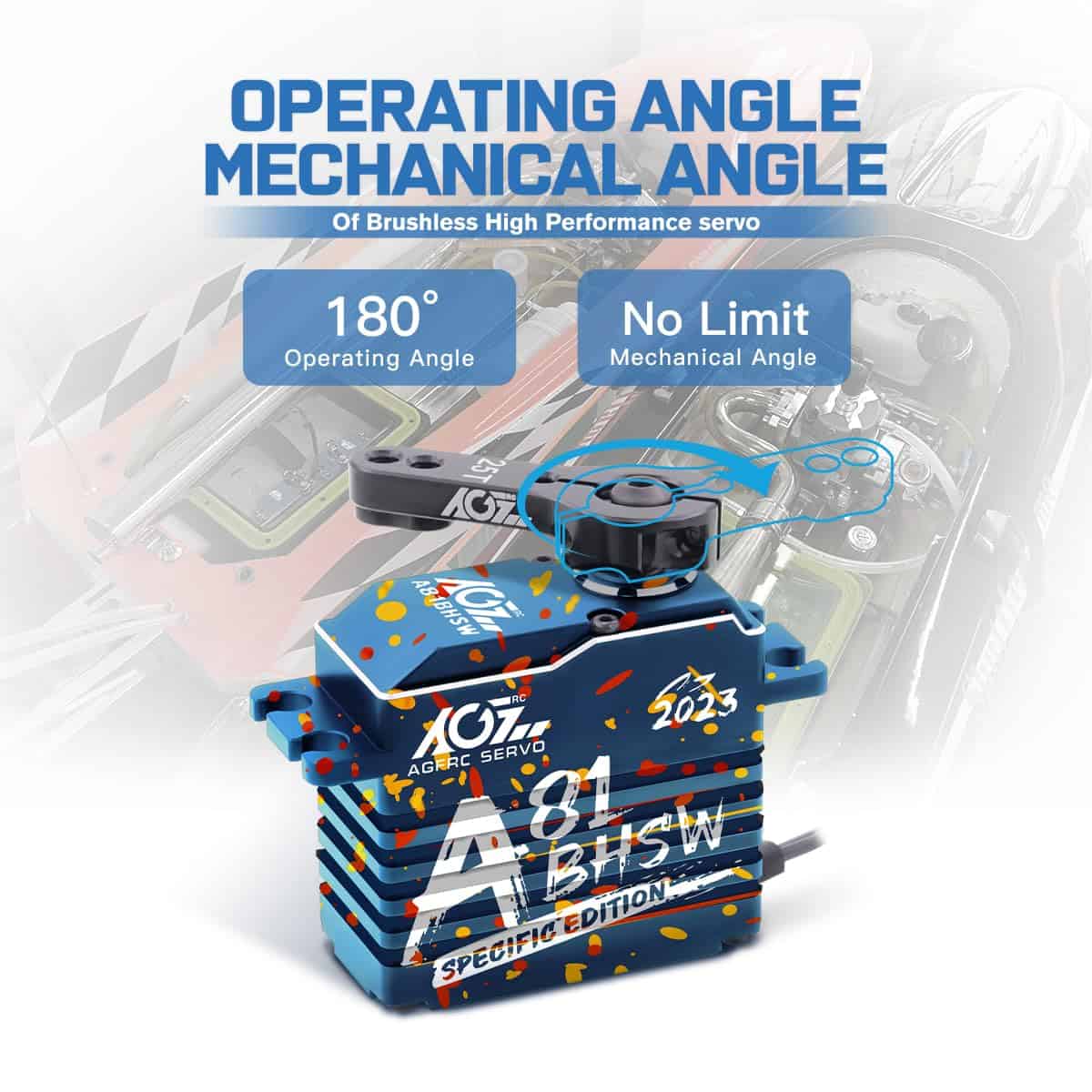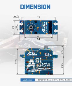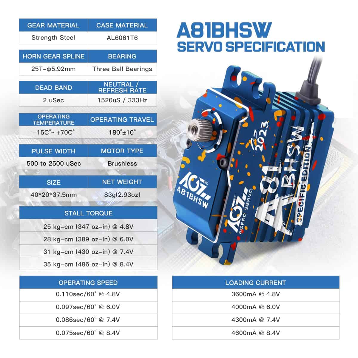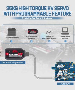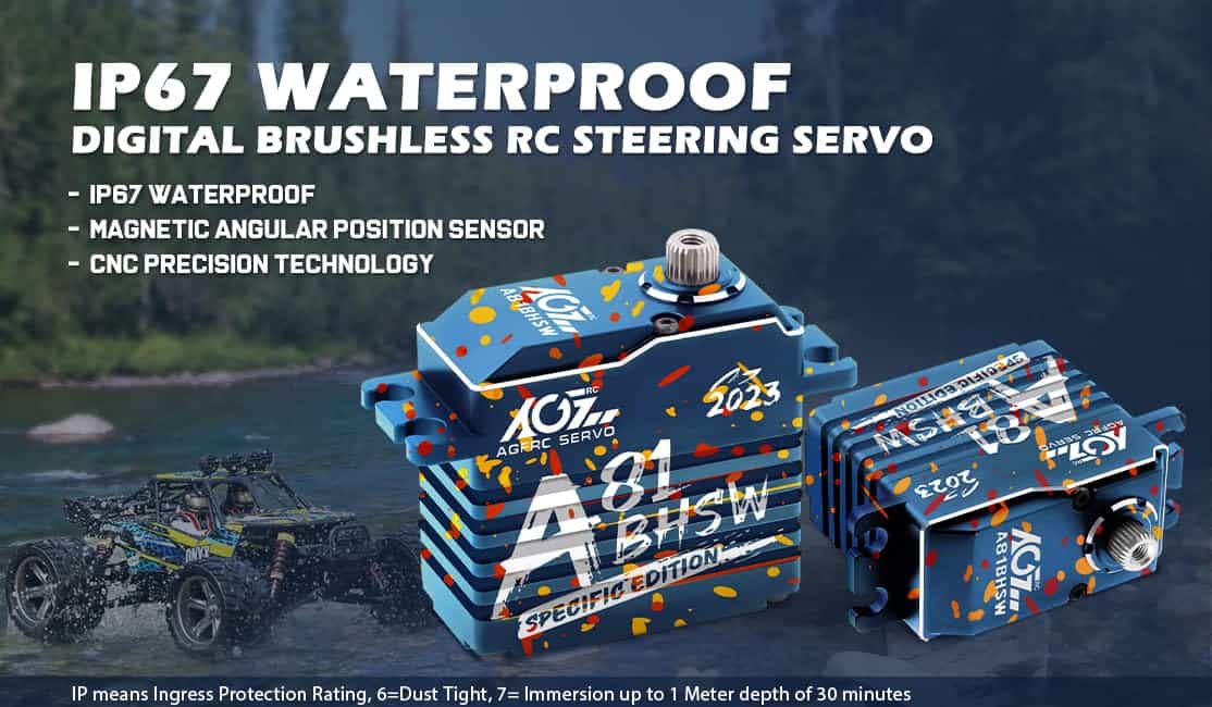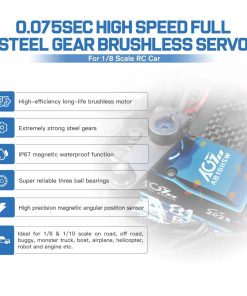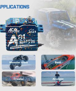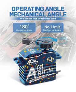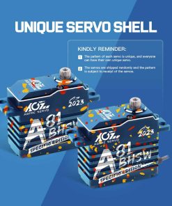 Este A81BHSW es un estilo especial para la celebración de la tienda AGFRC 2023. Debido al proceso único, el patrón de la carcasa de cada servo es diferente, por lo que cada persona tiene su propio servo exclusivo y único. El grabado láser del servo está fijo, pero el patrón es aleatorio. Características: Eje de acero cromado de alta resistencia Engranajes de acero patentados extra fuertes Tres rodamientos de bolas súper fuertes Motor brushless de alta eficiencia Circuito digital programable Sensor magnético de alta precisión y nivel de impermeabilización IP67 Resistencia al Stall: 25 kg-cm @ 4.8V, 28 kg-cm @ 6.0V, 31 kg-cm @ 7.4V, 35 kg-cm @ 8.4V Velocidad de funcionamiento: 0.110seg/60 @ 4.8V, 0.097seg/60 @ 6.0V, 0.086seg/60 @ 7.4V, 0.075seg/60 @ 8.4V Marca: AGFRC Nombre del artículo: A81BHSW 2023 Sistema de control: PWM, 1520uS/333Hz Nivel impermeable: IP67 Banda muerta: 2 uSec Ángulo mecánico: Sin límite Recorrido de operación: 180 +/- 10 grados, 500 a 2500 uSec Spline del engranaje del cuerno: 25T- 5.92mm Rodamiento: 3BB Material de la carcasa: AL6061T6 Tamaño: 40x20x37.5mm Peso: 83g Cable: TYU 300mm/22AWG Paquete incluido: 1 x Servo impermeable AGFRC A81BHSW 1 x Cuerno de Servo Metálico Negro 25T 1 x Kit de accesorios