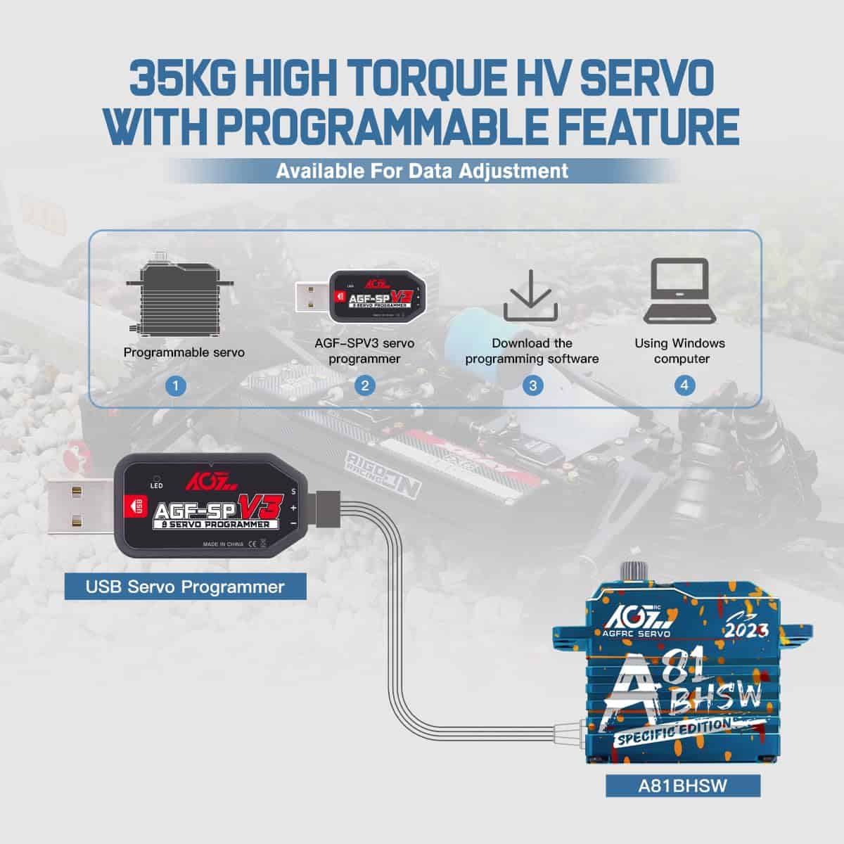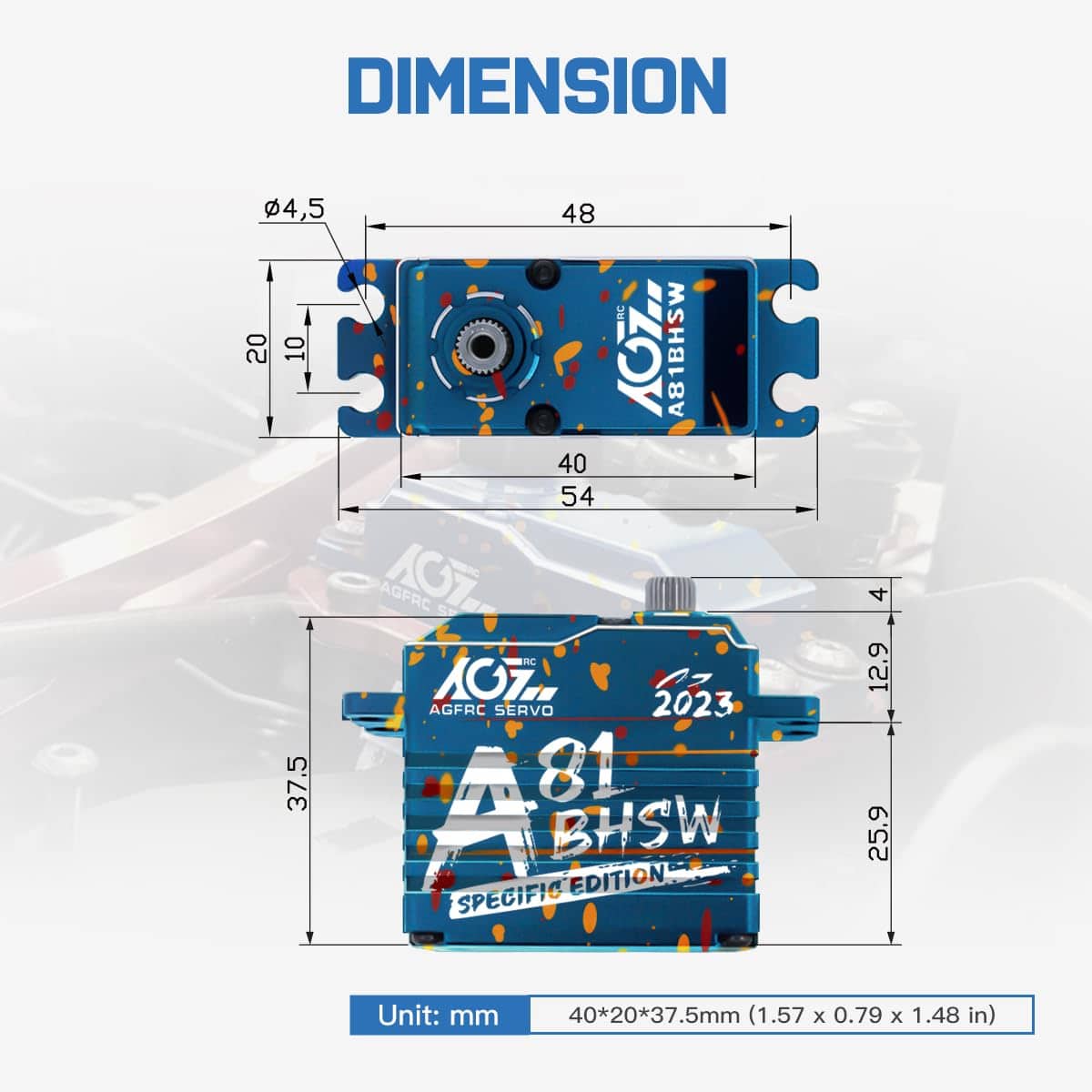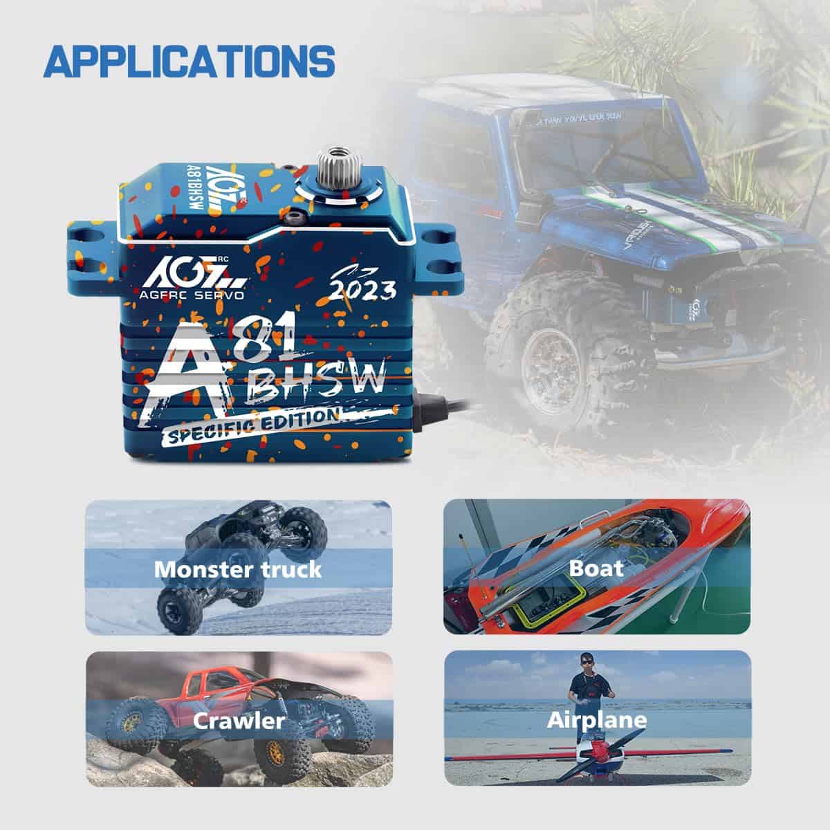 Este A81BHSW es un estilo especial para la celebración de la tienda AGFRC 2023. Debido al proceso único, el patrón de la carcasa de cada servo es diferente, por lo que cada persona tiene su propio servo exclusivo y único. El grabado láser del servo está fijo, pero el patrón es aleatorio. Características: Eje de acero cromado de alta resistencia Engranajes de acero patentados extra fuertes Tres rodamientos de bolas súper fuertes Motor brushless de alta eficiencia Circuito digital programable Sensor magnético de alta precisión y nivel de impermeabilización IP67 Resistencia al Stall: 25 kg-cm @ 4.8V, 28 kg-cm @ 6.0V, 31 kg-cm @ 7.4V, 35 kg-cm @ 8.4V Velocidad de funcionamiento: 0.110seg/60 @ 4.8V, 0.097seg/60 @ 6.0V, 0.086seg/60 @ 7.4V, 0.075seg/60 @ 8.4V Marca: AGFRC Nombre del artículo: A81BHSW 2023 Sistema de control: PWM, 1520uS/333Hz Nivel impermeable: IP67 Banda muerta: 2 uSec Ángulo mecánico: Sin límite Recorrido de operación: 180 +/- 10 grados, 500 a 2500 uSec Spline del engranaje del cuerno: 25T- 5.92mm Rodamiento: 3BB Material de la carcasa: AL6061T6 Tamaño: 40x20x37.5mm Peso: 83g Cable: TYU 300mm/22AWG Paquete incluido: 1 x Servo impermeable AGFRC A81BHSW 1 x Cuerno de Servo Metálico Negro 25T 1 x Kit de accesorios