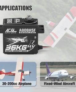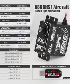 El A80BHSF está diseñado con firmware específico para aeronaves, proporcionando un centrado más estable y preciso durante el vuelo. Ofrece un motor sin escobillas para una operación de vida útil más larga y temperaturas de funcionamiento más bajas. Funciona entre 4.8V y 8.4V, puede alcanzar una torsión de 36kg-cm y una velocidad de 0.071segundos a 8.4V, es un servo digital programable de respuesta rápida que se adapta perfectamente a aplicaciones en aviones RC.