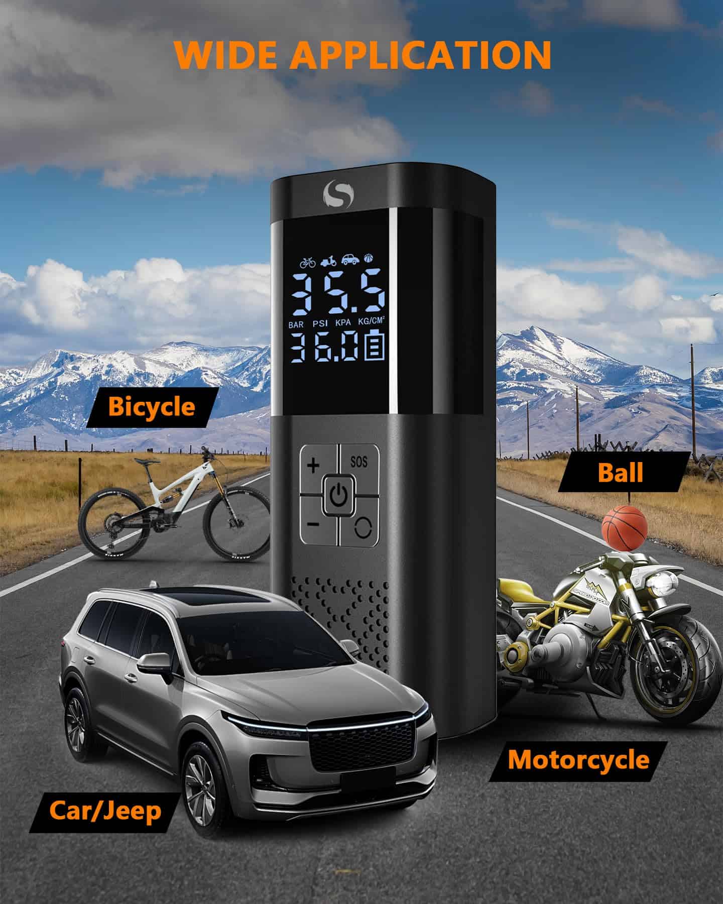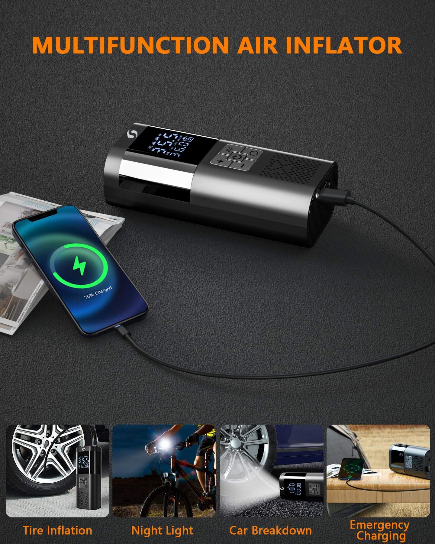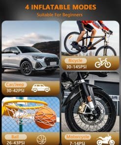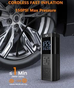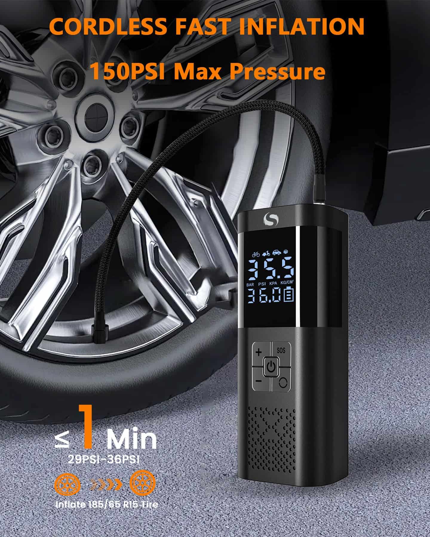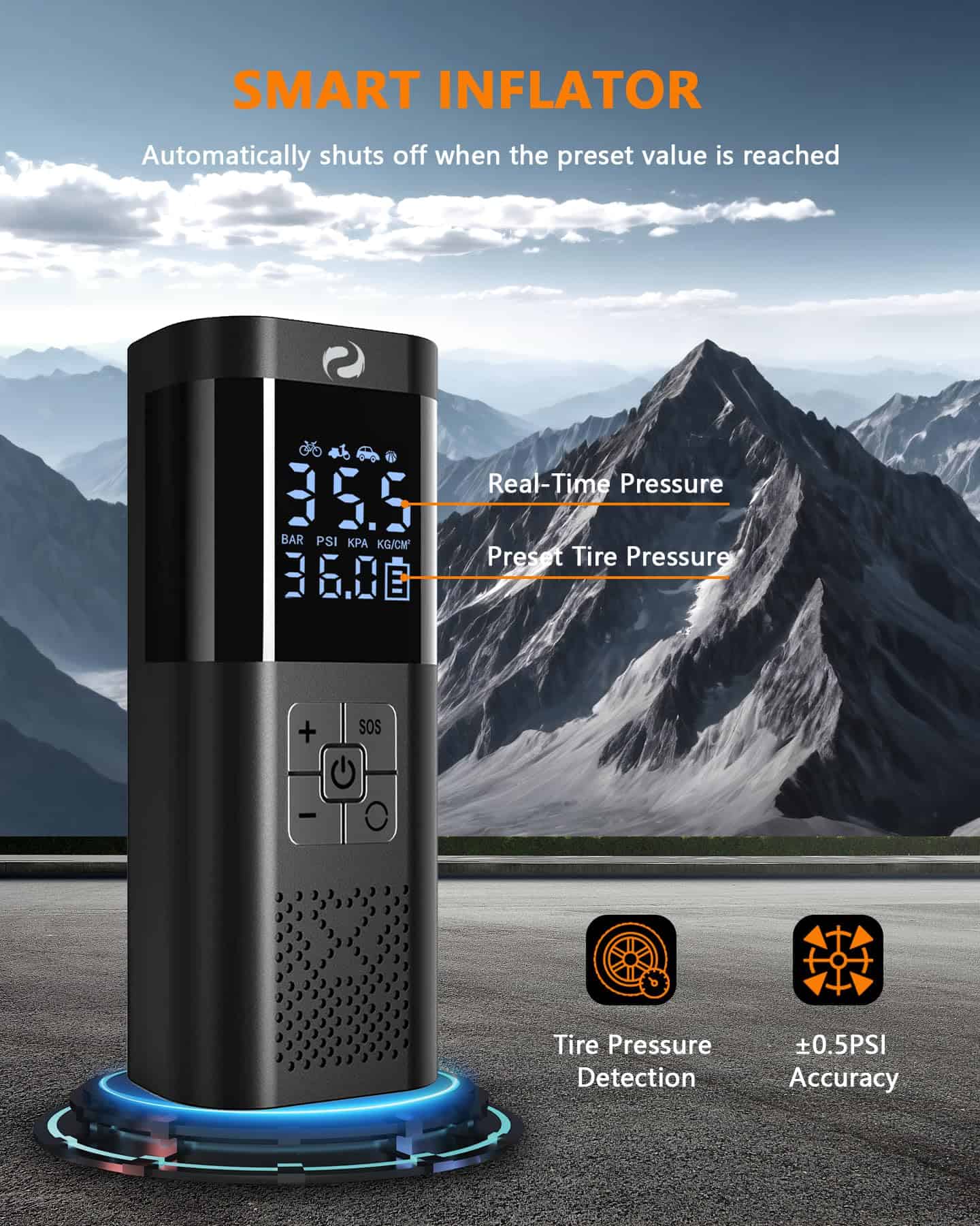 1. INFLACIÓN RÁPIDA Y SEGURA: No más tiempos largos de inflado, nuestro inflador de neumáticos portátil puede inflar un neumático de coche 195/55/R15 de 0 a 35 psi en 5 minutos. Simplemente ajuste la presión deseada y el compresor de aire para coche se apagará automáticamente cuando se alcance la presión objetivo.