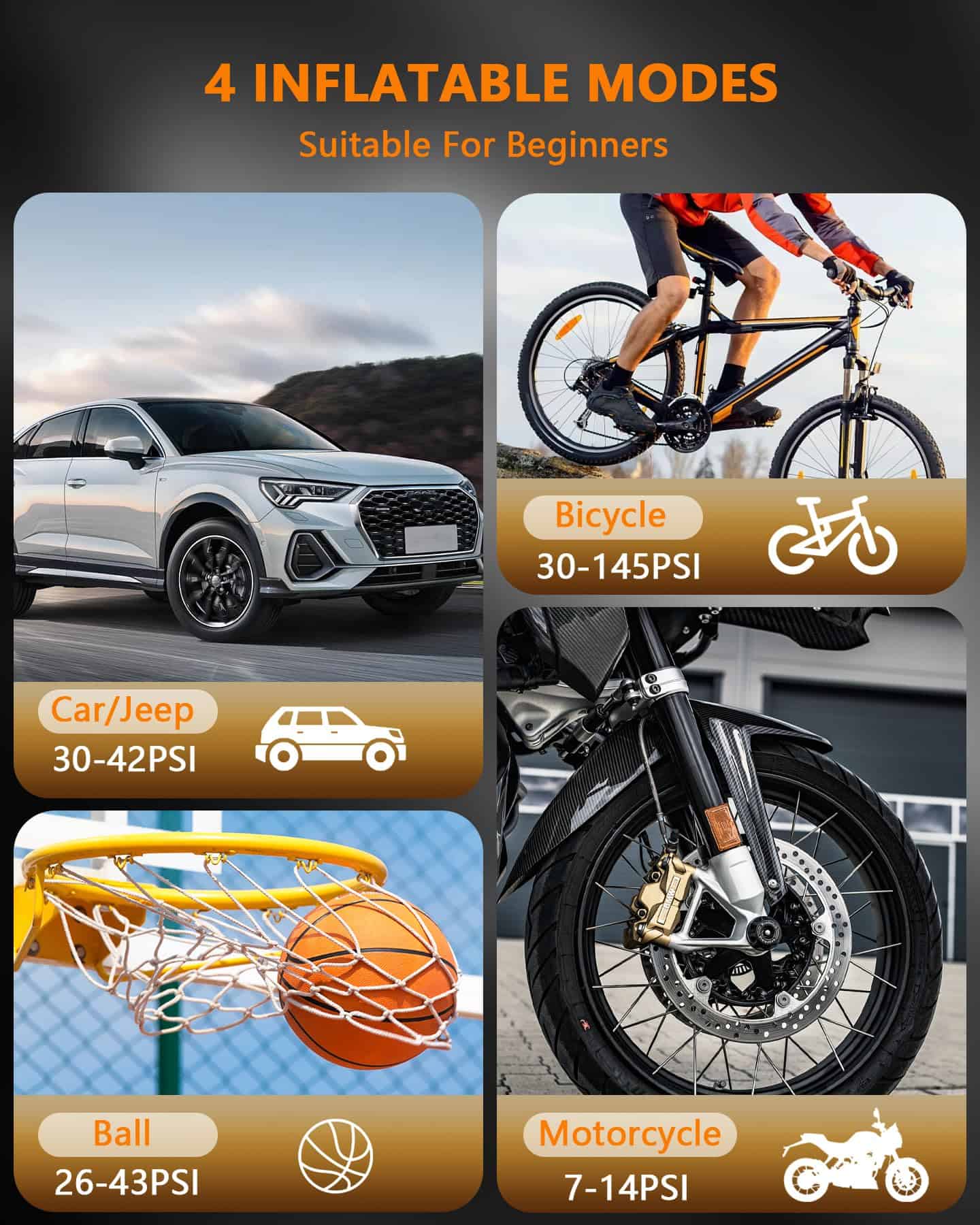 4. MULTIFUNCIÓN: El inflador de aire portátil viene con 5 boquillas auxiliares adicionales para satisfacer sus diversas necesidades. Puede inflar diferentes vehículos, como motocicletas, bicicletas, también se puede inflar en balones, aros de natación, otros botes inflables.
