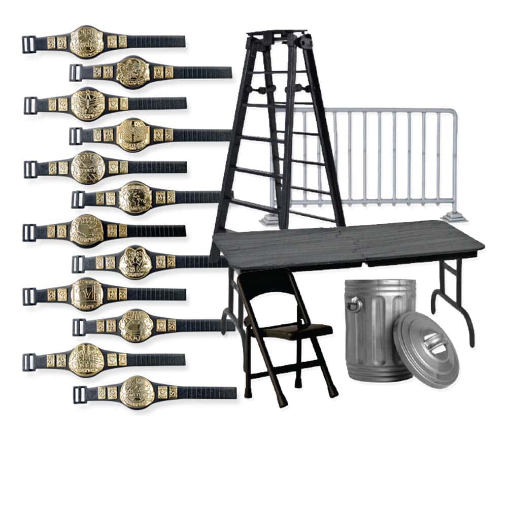 1. Actualiza tu colección de figuras de lucha libre con este Set de 12 Cinturones de Campeonato y 5 Accesorios.