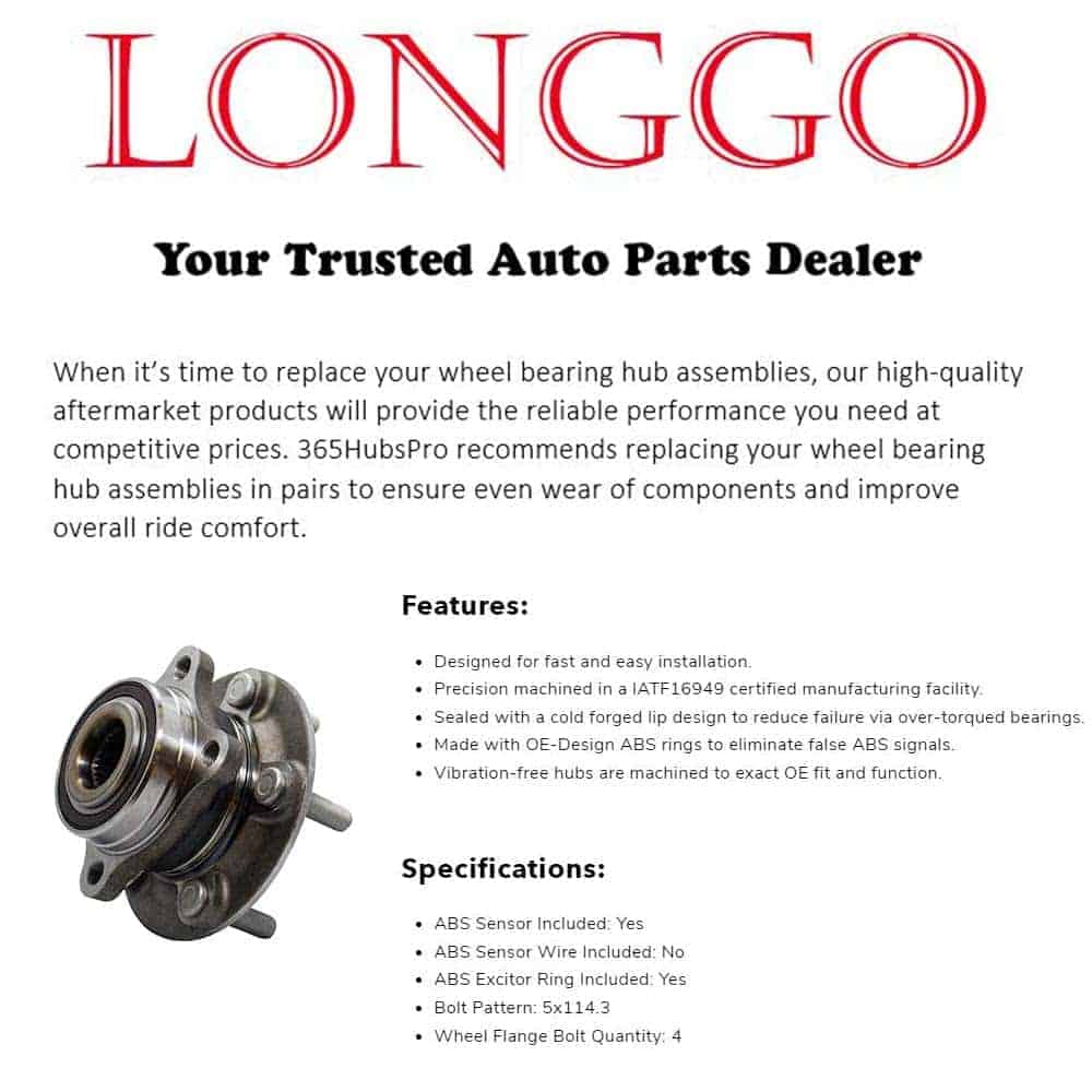 365hubs Auto Parts ofrece una amplia selección estándar y de alta calidad de piezas de buje de rueda para diferentes aplicaciones de vehículos. Nuestro producto de marca LONGGO se fabrica en instalaciones certificadas TS16949 para cumplir con los estándares de equipo original y brindar una mejor experiencia de conducción. Nuestras líneas de productos incluyen rodamientos de rueda, brida de rueda, ensamble de buje de rueda, kit de reparación de buje de rueda. Nos esforzamos por mantener la satisfacción del cliente al 100% al proporcionar piezas rentables y un excelente servicio al cliente antes y después de la venta. No dude en ponerse en contacto con nuestro servicio de atención al cliente para verificar la compatibilidad. Apto para Enclave (se ajusta en la parte delantera o trasera).