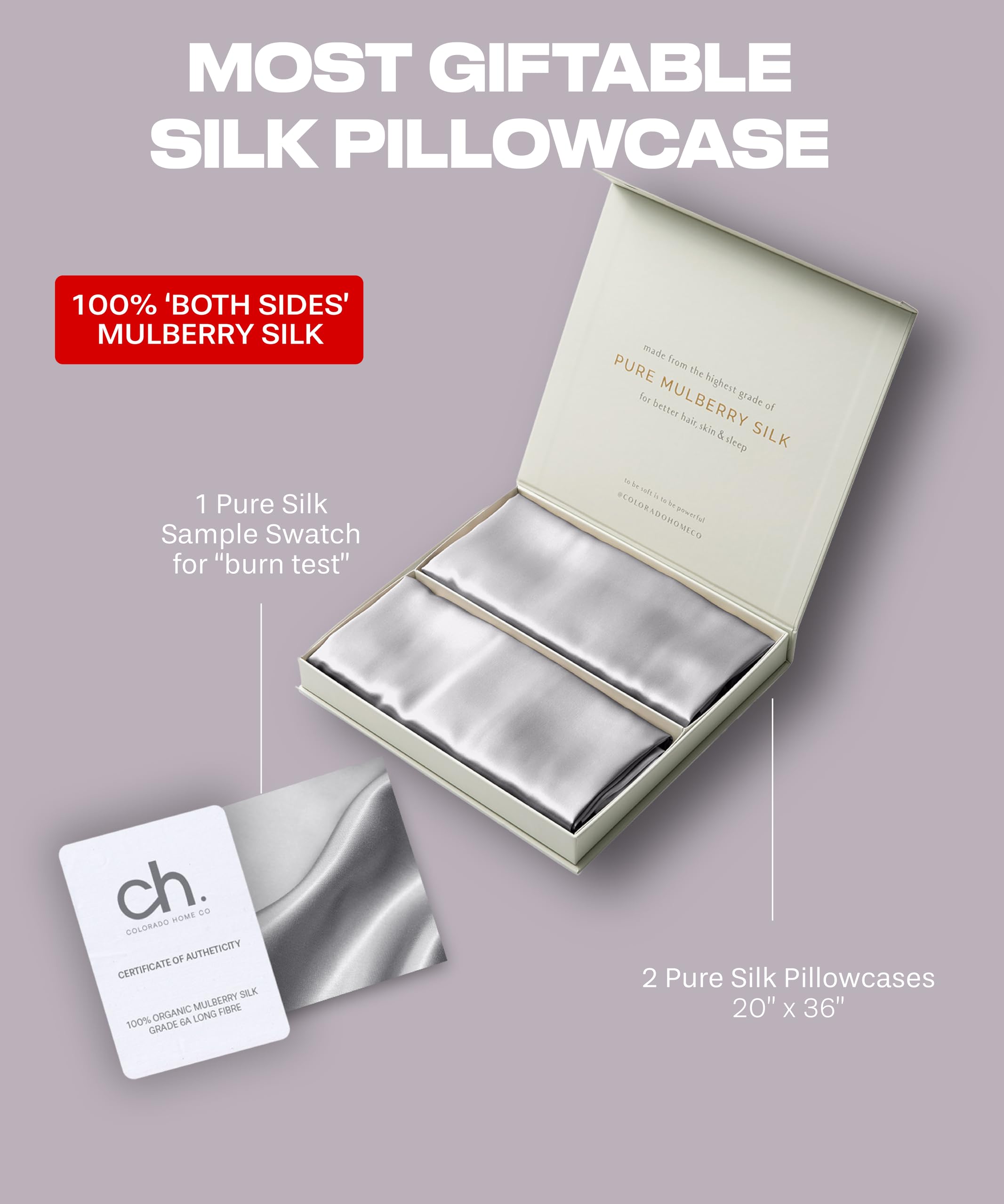 Funde en la suavidad increíble de nuestras fundas de almohada de seda orgánica infundidas con 18 aminoácidos. Disfruta de los beneficios anti-envejecimiento, anti-arrugas y anti-acné para tu cabello y piel. Duerme fresco y mejor con la mejor funda de almohada refrigerante para dormilones calurosos. Perfecto como regalo de lujo para tus seres queridos. Garantía vitalicia y soporte inigualable de nuestro equipo de atención al cliente.