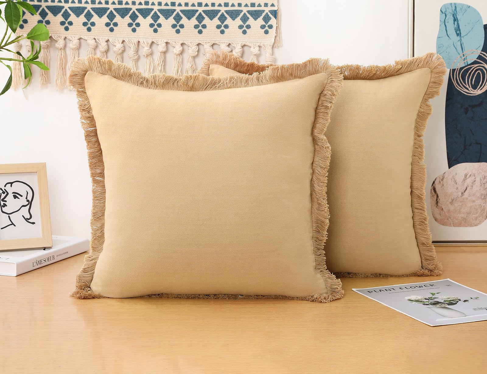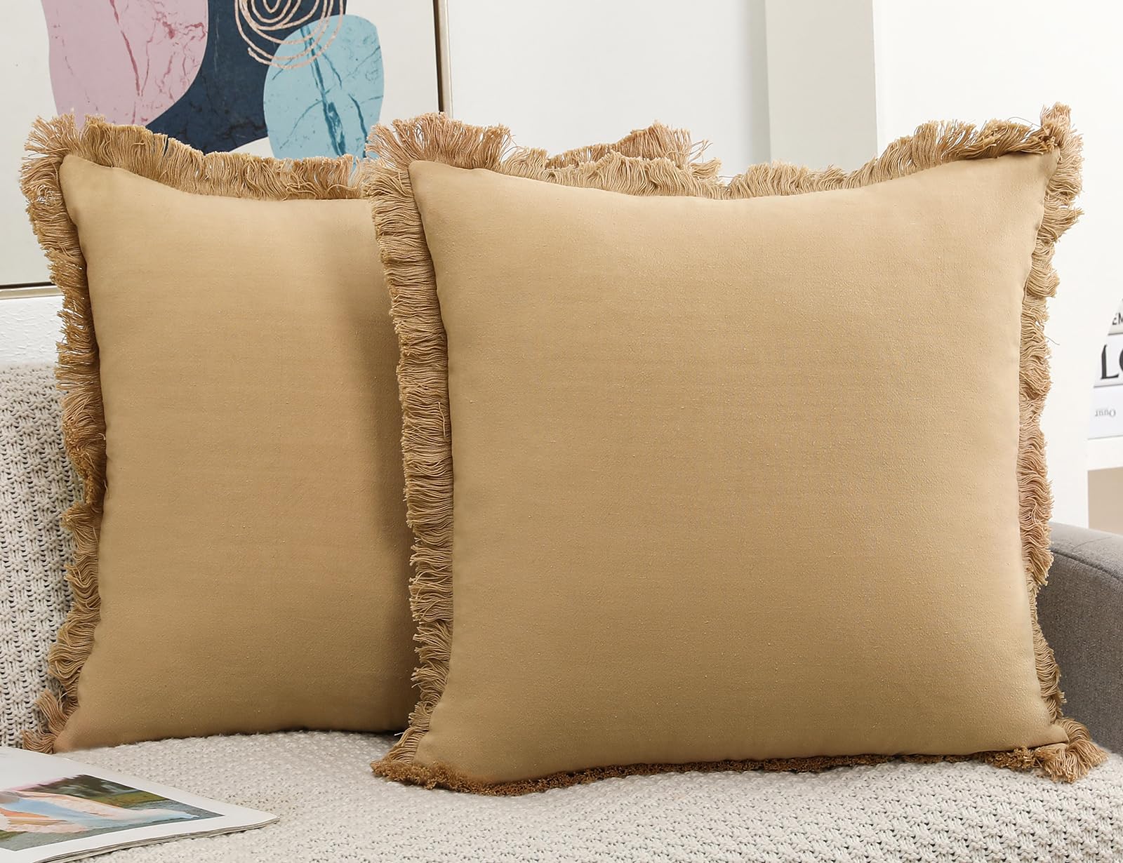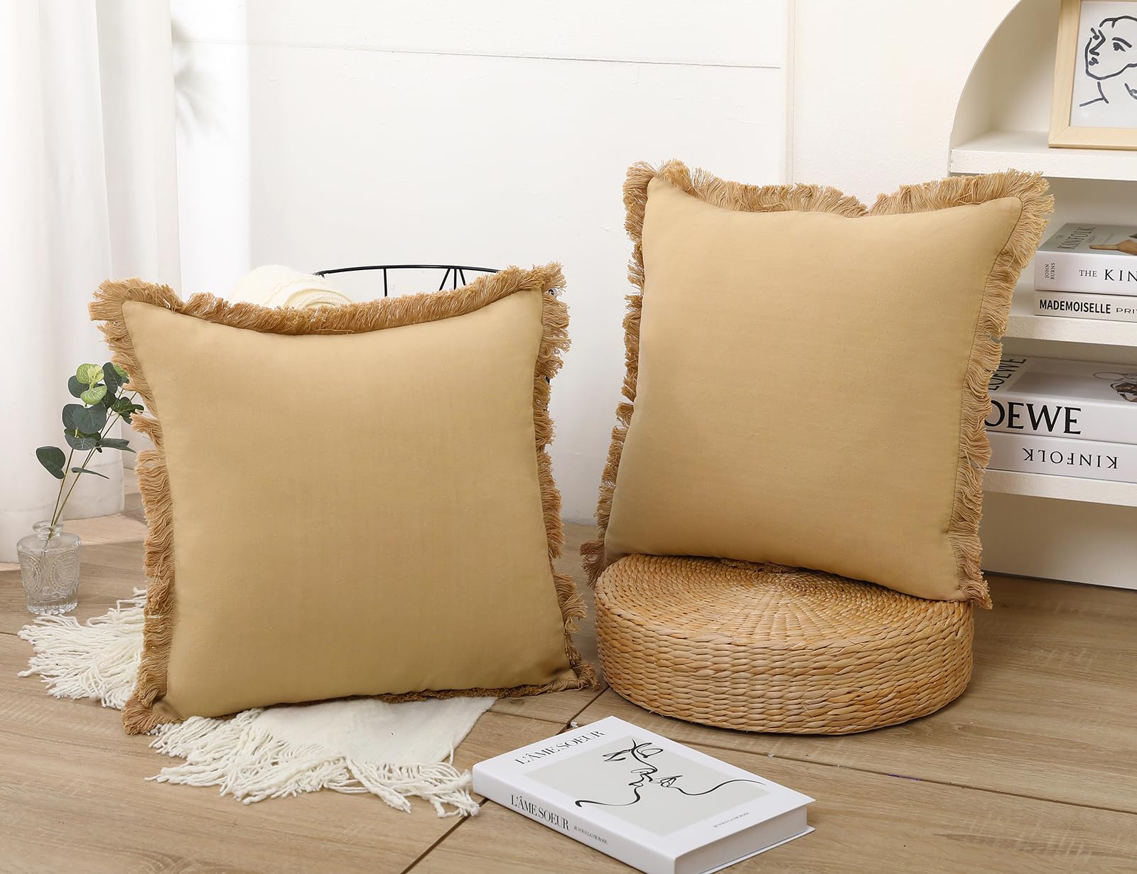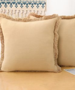 Set de 2 Fundas de Cojín de Lino Natural con Flecos en Color Caqui. Estas fundas de almohada decorativas cuentan con una borla chic de arpillera y son ideales para decorar tu sofá con un estilo granja. Medidas de 30×30 pulgadas. Hechas de 80% de Lino de Ramio y 20% de Algodón, de origen vegetal, estas fundas son acogedoras y transpirables, lo que te mantendrá fresco en verano y cálido en invierno. El diseño estético incluye una elegante textura natural y un fleco de 1 pulgada alrededor del borde, lo que las hace únicas y va bien con la decoración boho, granja, étnica, retro y chic. La cremallera invisible en el mismo color que la funda de almohada es elegante y fácil de quitar. Cada costura está reforzada para garantizar la durabilidad de la funda. Este set es el regalo perfecto para diferentes ocasiones y puede ser obsequiado a padres, novias, familiares y abuelas. Aviso: El paquete contiene 2 fundas de almohada sin rellenos. ¡Hazte con estas fundas y disfruta de la mejor calidad para tu hogar!