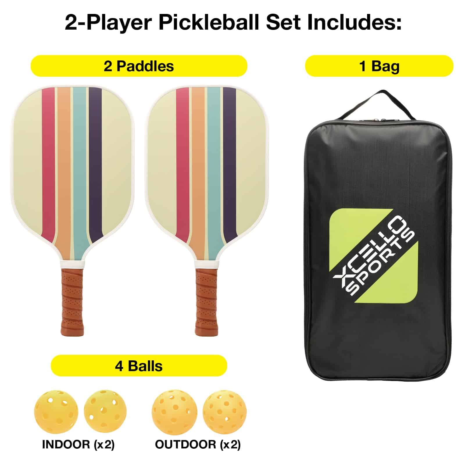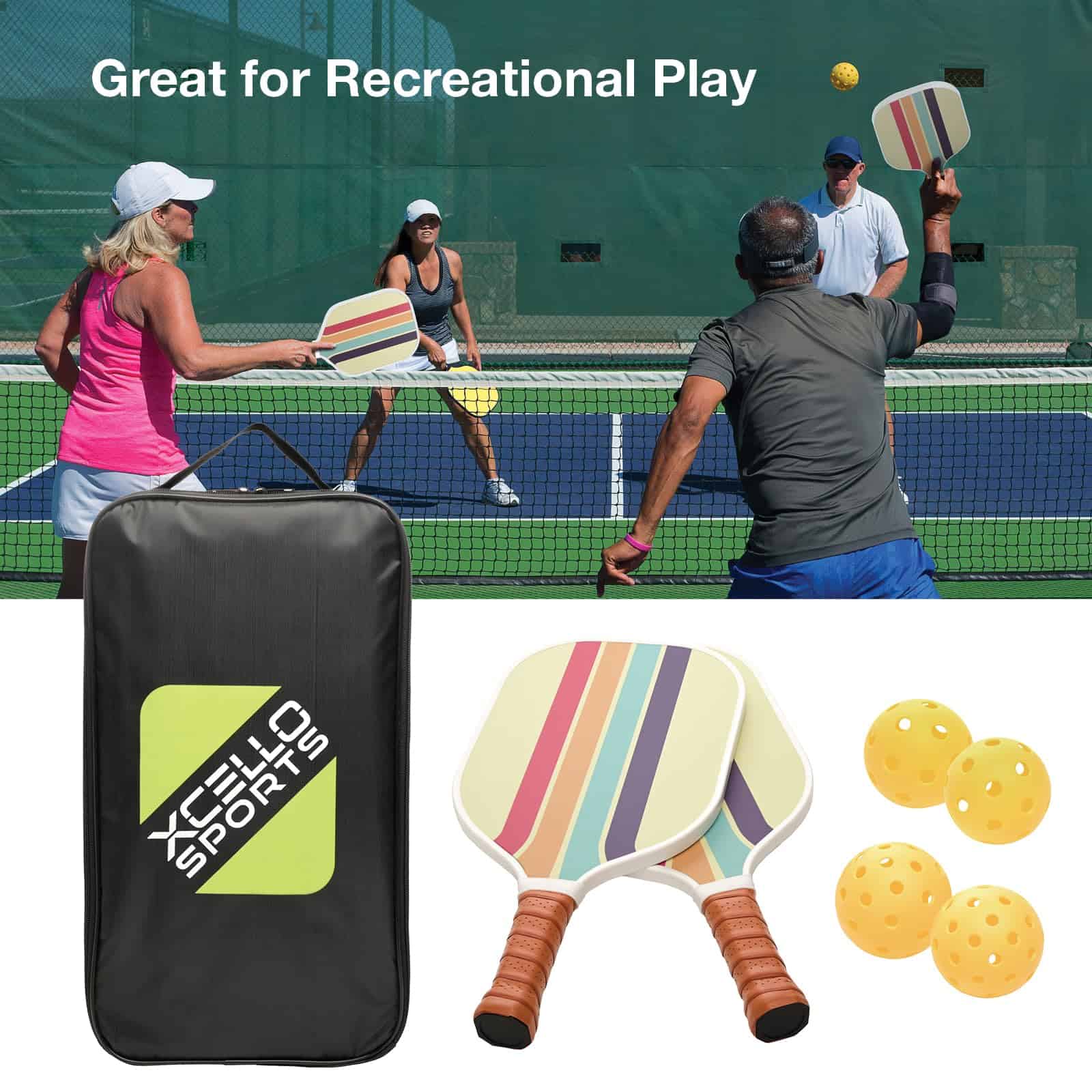 Prepárate para la diversión interminable y el juego competitivo con el Set de Paletas de Pickle Ball de Fibra de Vidrio Xcello Sports. Este set es perfecto tanto para principiantes como para jugadores experimentados que buscan equipos de alta calidad que ofrezcan un rendimiento excepcional. Cada set incluye dos paletas de pickleball de fibra de vidrio duraderas diseñadas para resistir el juego intenso, cuatro pelotas de pickleball amarillas brillantes (dos para uso en interiores y dos para uso en exteriores), y un práctico estuche de transporte para un almacenamiento y transporte fáciles. Las paletas cuentan con un agarre amortiguado, asegurando comodidad y control durante cada partido. Disponibles en cuatro estilos vibrantes: Retro Stripes, Rainbow Tie Dye, Blue Marble y Blue/Purple Gradient, este set aporta tanto funcionalidad como estilo a la cancha. Ya sea que estés jugando en tu patio trasero, en una cancha local o de vacaciones, el Set de Paletas de Pickle Ball de Xcello Sports es tu elección para juegos recreativos.
