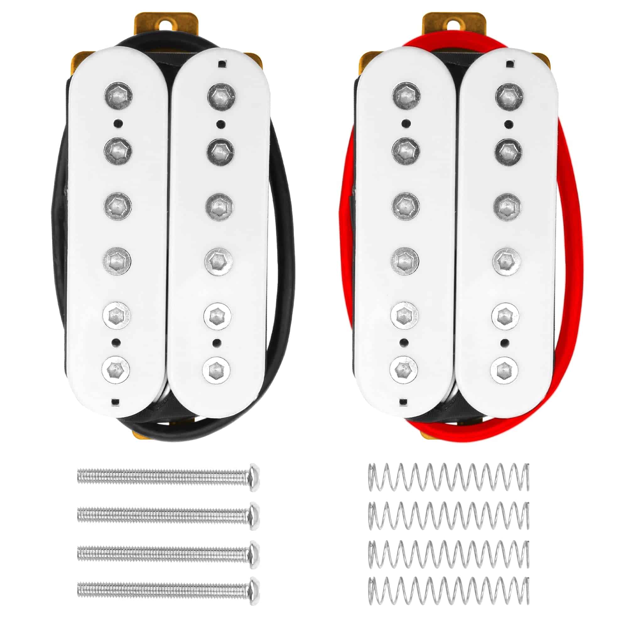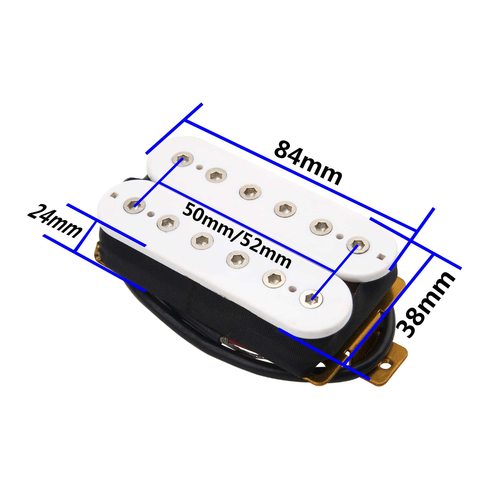 Esta pastilla doble para guitarra eléctrica con imán de cerámica y tornillo hexagonal es compatible con la mayoría de las guitarras eléctricas de doble pastilla o similares. La pastilla humbucker doble con imanes de cerámica enrollados ofrece una salida alta de 15k en el puente y 7,2k en el mástil, ideal para estilos de rock pesado como metal, punk y otros. Las pastillas humbuckers para guitarra eléctrica están hechas principalmente de metal, no son fáciles de dañar, cada pastilla incluye 2 tornillos y 2 muelles. Viene con tornillos de montaje y muelles, fácil de instalar y utilizar. Un gran reemplazo de pastilla doble para tus guitarras, la pastilla del mástil y del puente se adapta a las guitarras. Material: Metal + ABS, Cerámica Especificaciones del Producto: Espaciado de los agujeros de la pastilla del mástil: 50mm Espaciado de los agujeros de la pastilla del puente: 52mm Imán: Imanes de cerámica Color: Blanco/Negro/Rojo (opciones) Resistencia: Mástil 7.5k, Puente 15k Tamaño: 84 x 38 x 24mm (L x W x H) Peso: 220g Contenido del Paquete: 1 Pastilla de Guitarra Eléctrica para el Puente 1 Pastilla de Guitarra Eléctrica para el Mástil 4 Tornillos de Montaje 4 Muelles de Montaje Nota: 1. Si no está satisfecho con nuestro producto recibido, puede enviarnos correos electrónicos en cualquier momento. Le responderemos al instante y le ayudaremos a resolver su problema. 2. Debido a diferentes monitores, puede haber una ligera diferencia de color.