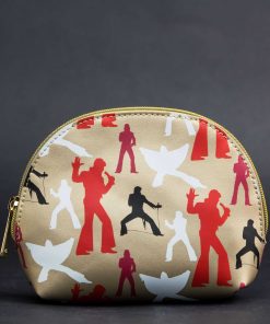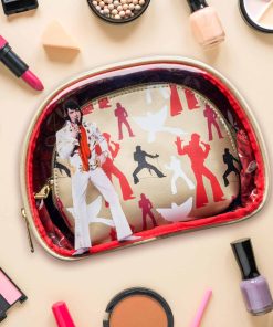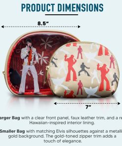 El Set de 2 piezas Loungefly Elvis Presley Aloha from Hawaii es un elegante y vibrante tributo al Rey del Rock n’ Roll. Este set incluye dos bolsas: Bolsa grande: Con unas medidas de aproximadamente 8.5″ x 6.5″ x 2.5″, presenta un diseño audaz con ribete de cuero sintético, un panel frontal transparente que muestra una imagen icónica de Elvis con su traje blanco clásico del concierto Aloha from Hawaii. El fondo resalta siluetas de Elvis en diversas poses, capturando su dinámica presencia en el escenario. Bolsa más pequeña: Con unas medidas de aproximadamente 7″ x 5″ x 2″, la bolsa compacta complementa a la bolsa grande con siluetas a juego de Elvis en rojo, negro y blanco, contra un fondo dorado metálico. El ribete de la cremallera es dorado para un acabado elegante. El interior está forrado con un estampado floral rojo inspirado en Hawai, añadiendo un toque de color y estilo temático. Perfecto para fanáticos de Elvis Presley, este set es a la vez funcional y una pieza coleccionable nostálgica.