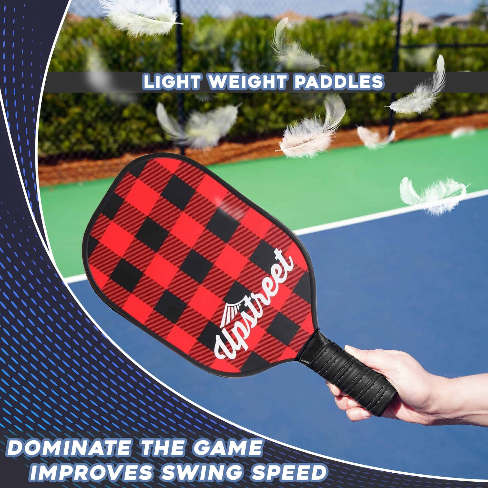 1. GRAN RAQUETA DE PICKLEBALL: La raqueta de pickleball estilo piel de serpiente de Upstreet tiene un diseño de color único y hermoso que es ideal para jugar juegos de pickleball con familiares y amigos. Este set de pickleball incluye una cubierta acolchada que es muy conveniente para guardar y transportar la raqueta de pickleball.