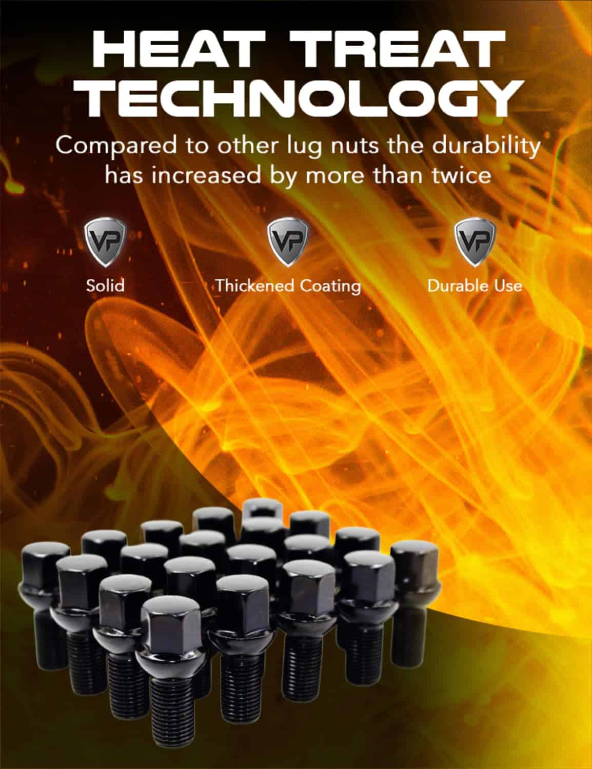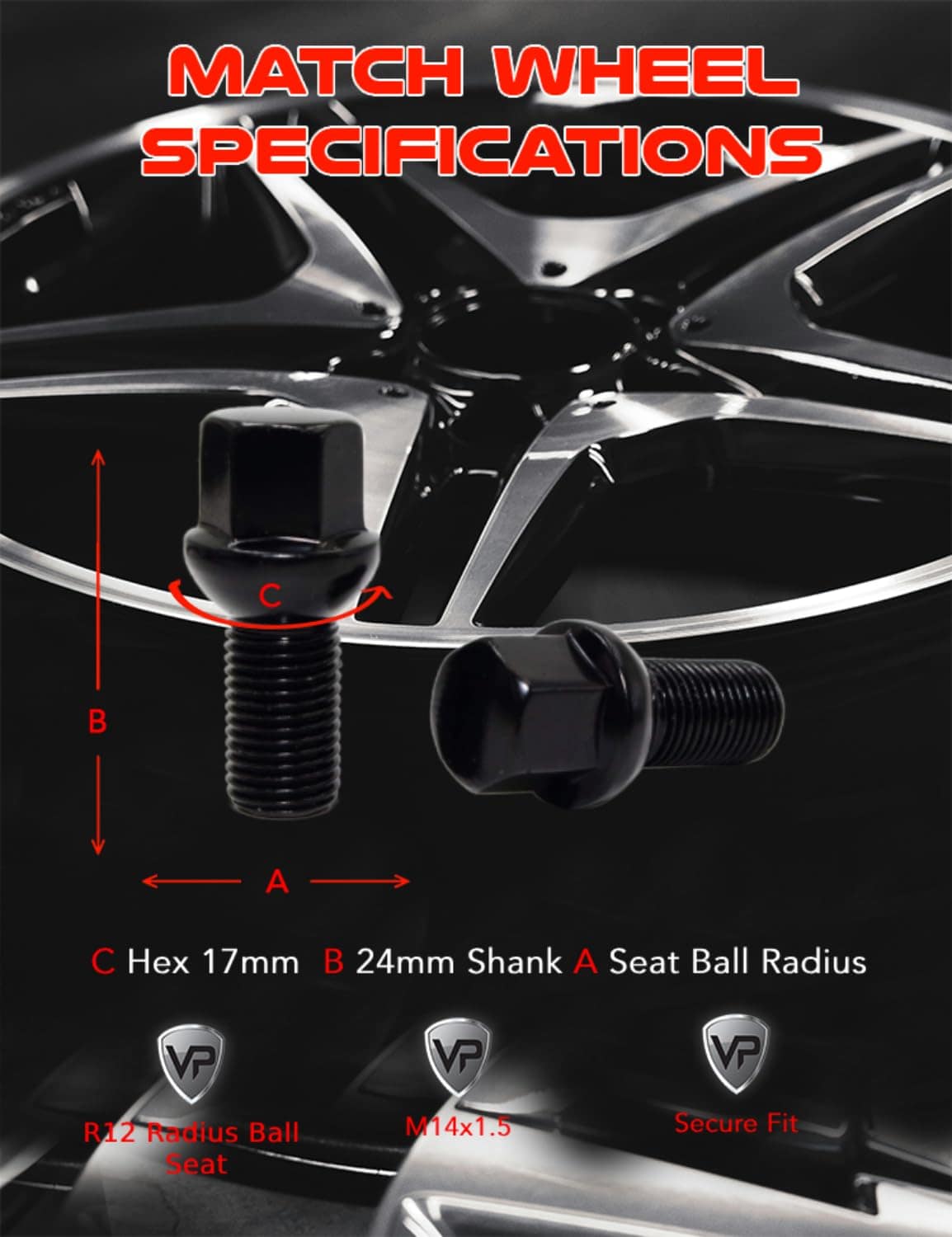 Set de 20 Pernos de Rueda de Bola R12 Veritek 14×1.5mm Negros 24mm de Longitud de Rosca 17mm Hex para Ruedas de Fábrica de Mercedes. Estos pernos de rueda han sido tratados térmicamente para su uso con ruedas selectas de fábrica OEM de Mercedes Clase A B C E CLA CLS E SLC. Con una rosca de 14×1.5mm y una longitud total de 1.85″ y un asiento de varilla de bola R12, estos pernos de rueda están construidos en acero de grado 10.9 tratado térmicamente para proporcionar la máxima durabilidad y resistencia a la tracción. Cumplen o incluso superan las normas de fábrica OEM para ofrecer un rendimiento excepcional y una larga vida útil en sus ruedas de Mercedes.