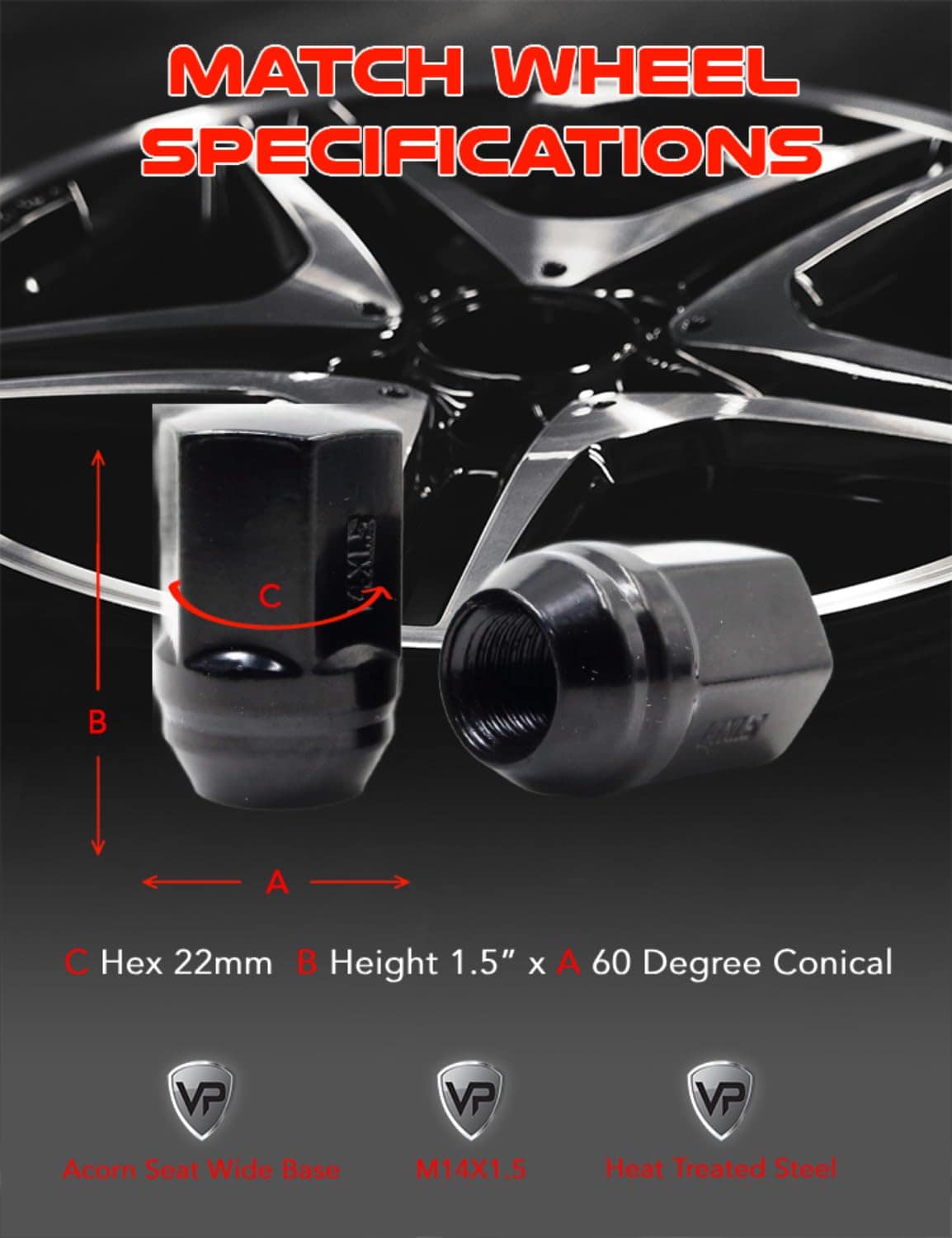 Set de 20 tuercas cónicas Duplex OEM estilo 1.46 pulgadas Veritek 14×1.5mm en color negro brillante. Estas tuercas están diseñadas específicamente para rines de fábrica de Dodge y Chrysler. Con un hexágono de 22mm, están tratadas térmicamente para asegurar un ajuste perfecto y durabilidad. La rosca de 14×1.5mm garantiza una instalación segura. Con una longitud total de 1.46 pulgadas, estas tuercas están fabricadas con acero de grado 10.9 de máxima resistencia. Son cementadas para proporcionar una resistencia y durabilidad excepcionales, asegurando un rendimiento óptimo en las condiciones más exigentes. Cumplen o superan los estándares de fábrica OEM para una total tranquilidad.
