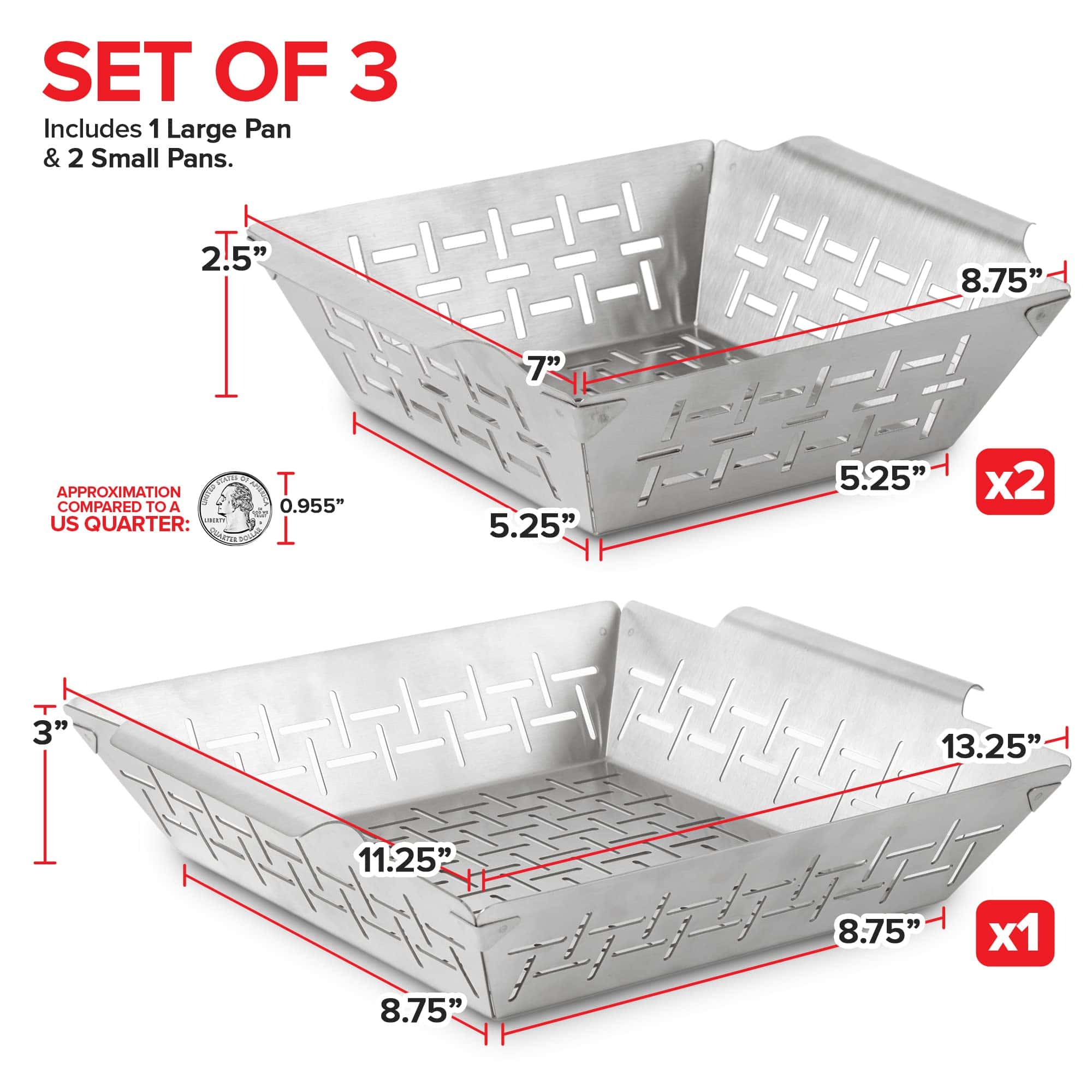 5. Set de 3 accesorios de parrilla para parrilla exterior: Incluye 1 bandeja grande y 2 bandejas pequeñas. Grande – 13.25 Largo superior, 11.25 Ancho superior, 8.75 Largo/Ancho inferior, 3 Altura. Pequeño – 8.75 Largo superior, 7 Ancho superior, 5.25 Largo/Ancho inferior, 2.5 Altura.
