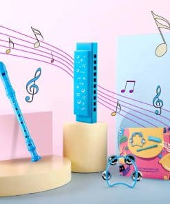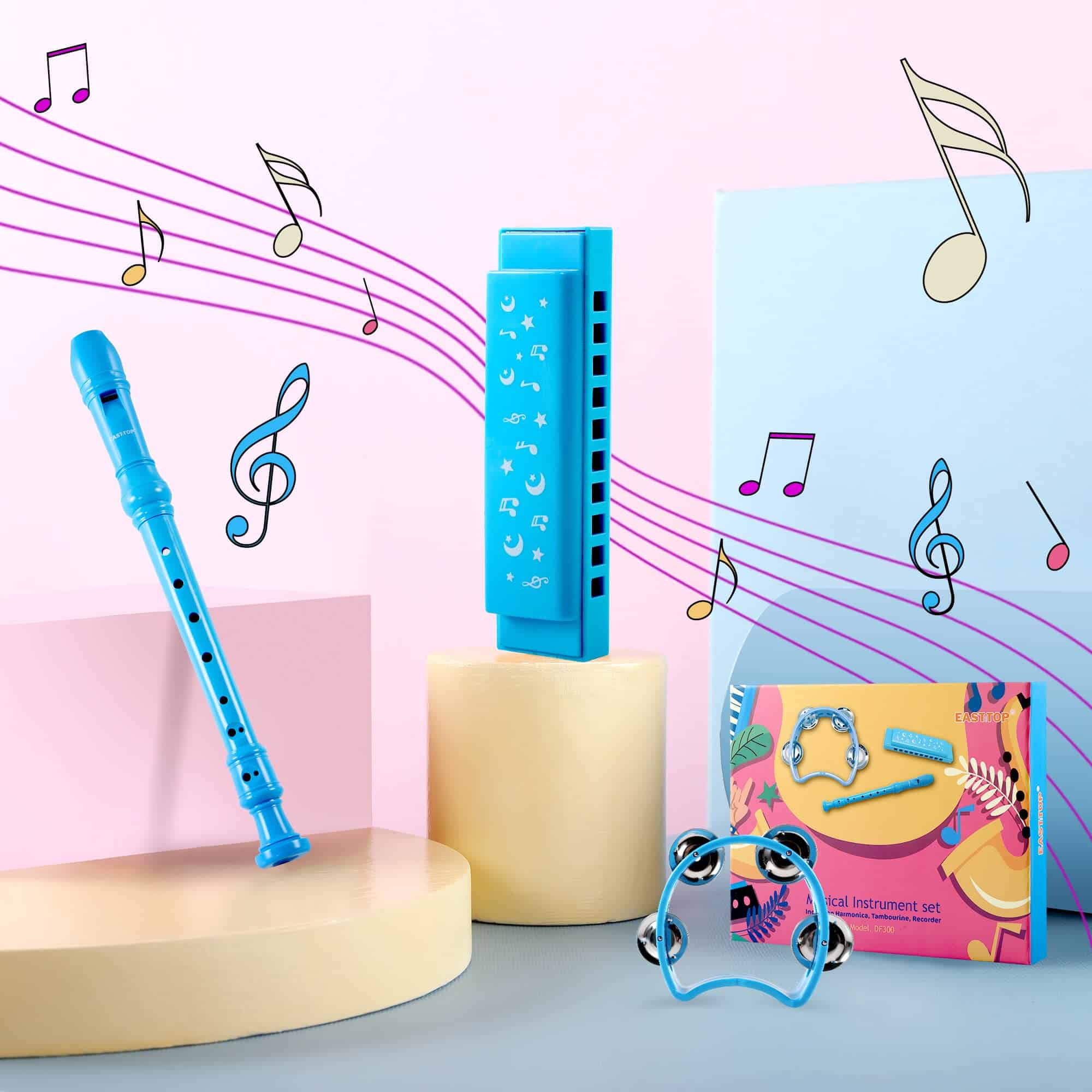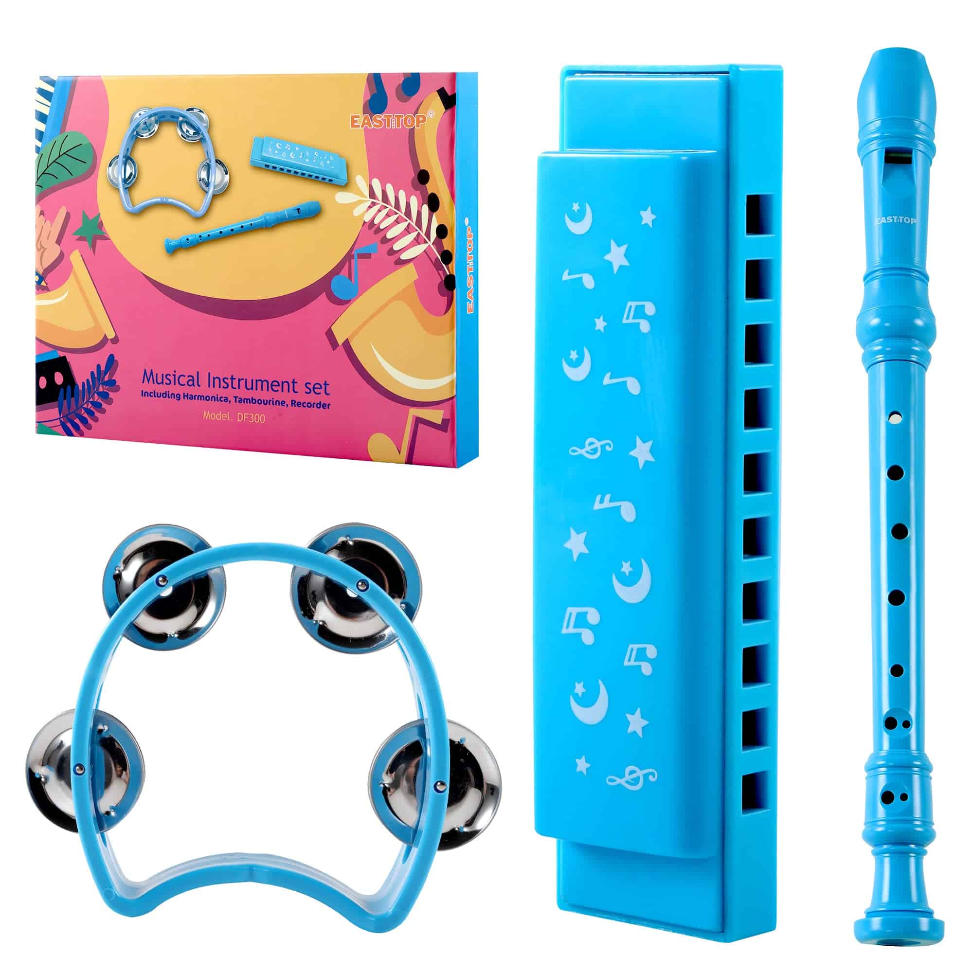 EAST TOP Kids Musical Instruments, 3Pcs harmonica and flute and hand bell for Kids Children, Preschool Education Early Learning Musical for Boys and Girls, blue. Conjunto que incluye 1 armonica, 1 flauta de 8 agujeros de plástico, 1 mini pandereta y estuche de papel resistente. Somos el fabricante de la marca East top. Respaldado con la garantía de devolución de dinero incondicional de 30 días de East top. Puedes estar seguro de comprar nuestros productos.