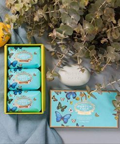 Set de 3 jabones Portus Cale Butterflies en caja regalo. Un lujoso set de tres jabones Portus Cale Butterflies, un regalo espléndido y fragante para cualquier ocasión. Estampado a mano y envuelto a mano por nuestras artesanas en papel azul turquesa adornado con mariposas. Cada jabón está hecho con una base 100% vegetal. Con un aroma refrescante y alegre, forman una espuma cremosa y fragante. Estos jabones vienen en una caja de lujo que se puede reutilizar para guardar objetos pequeños, como fotos o material de arte. Aroma: Caña de Azúcar y Limoncillo