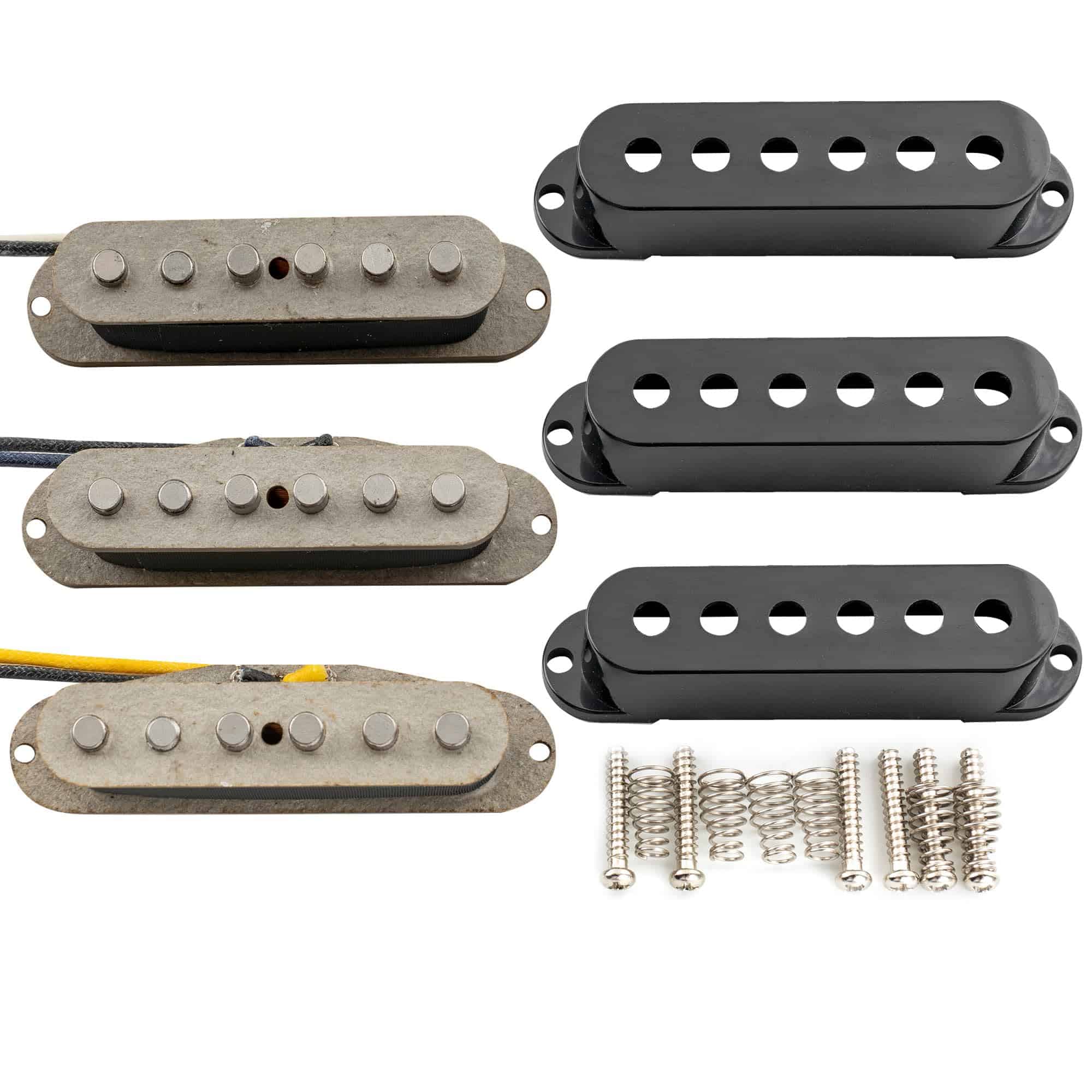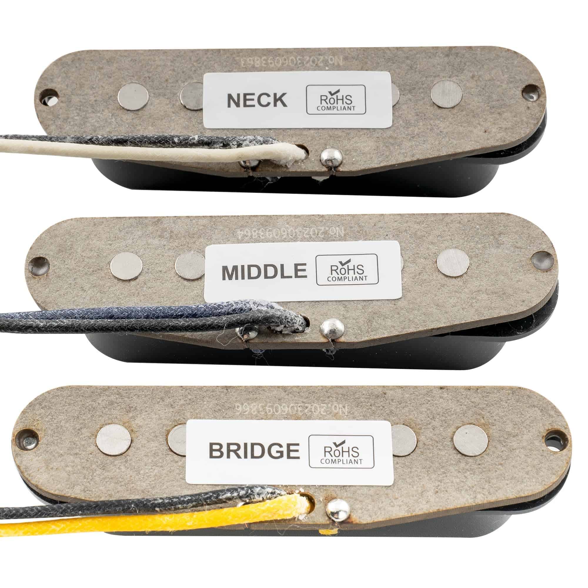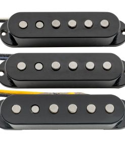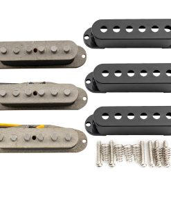 Set de pastillas magnéticas de Alnico 5 escalonadas para mástil, medio y puente para guitarra eléctrica estilo Stratocaster. Ofrece tonos vintage con piezas polares escalonadas para una salida equilibrada. La pastilla media de polaridad inversa y enrollado inverso (RWRP) ayuda a cancelar el ruido no deseado. Produce agudos claros y graves profundos, ideal para estilos musicales como Blues, Rock y Classic Rock. Incluye juego completo de pastillas y accesorios de montaje. Por favor, tenga en cuenta que los tornillos pueden no adaptarse a su instrumento, utilice los suyos si es posible.