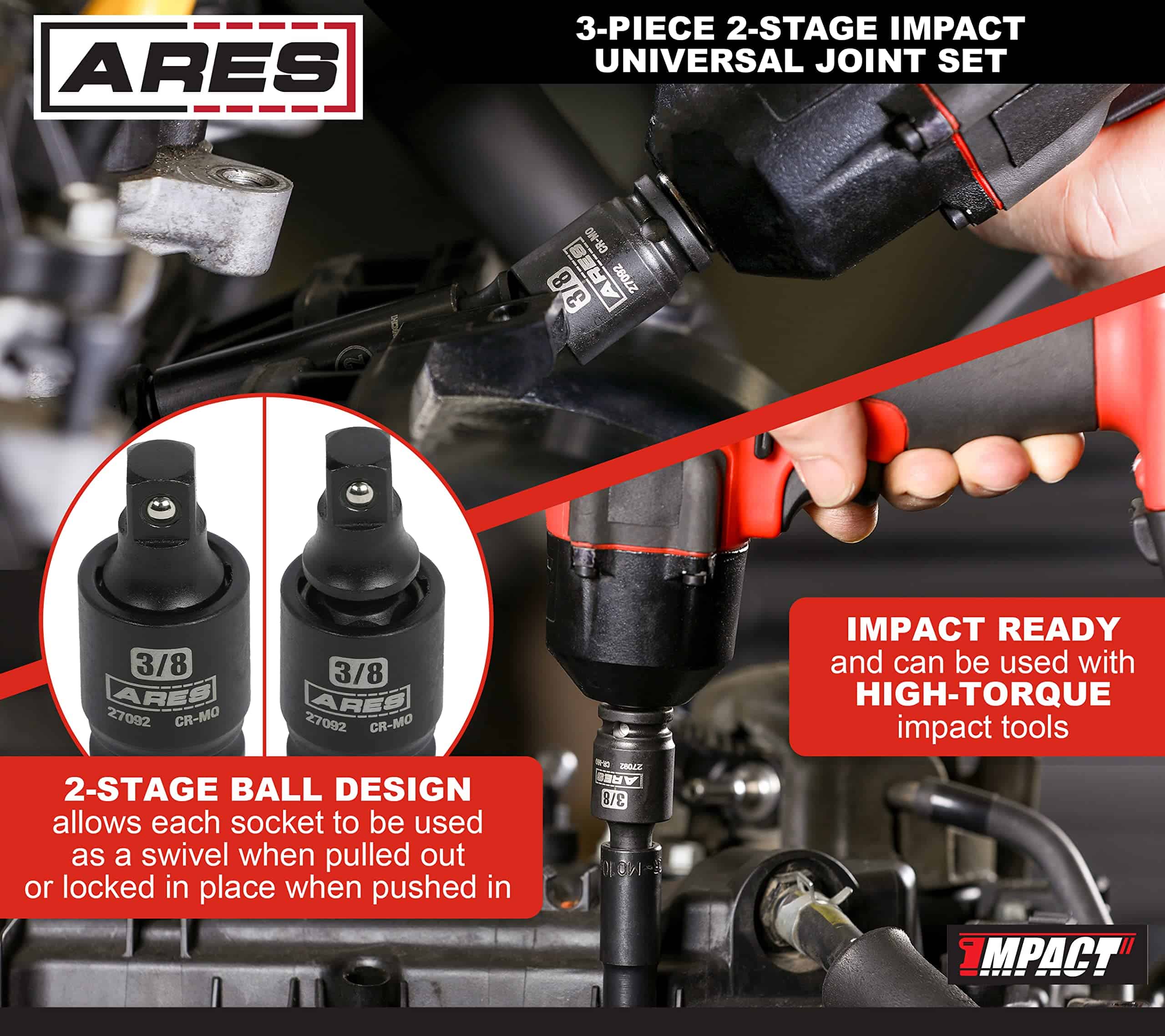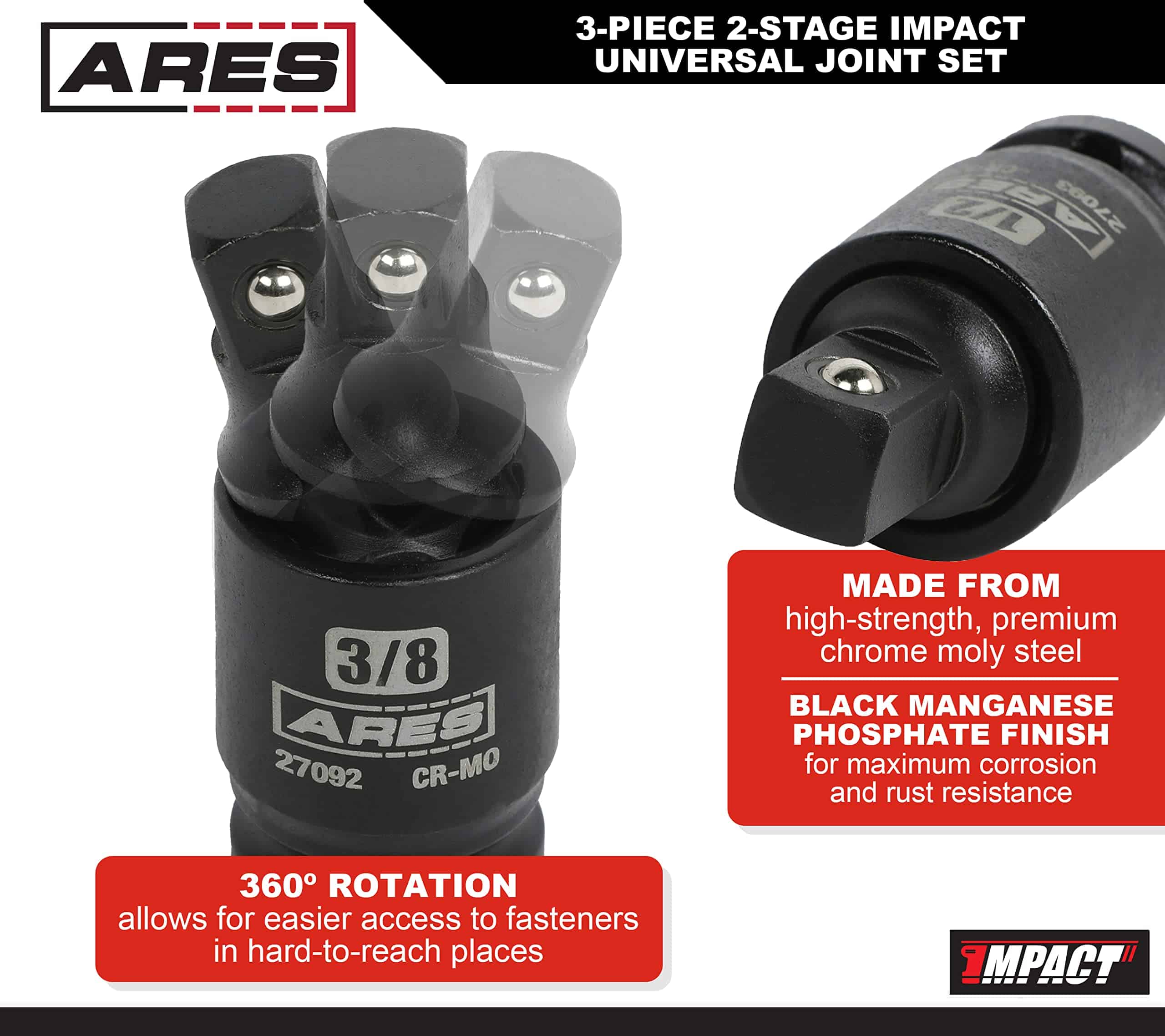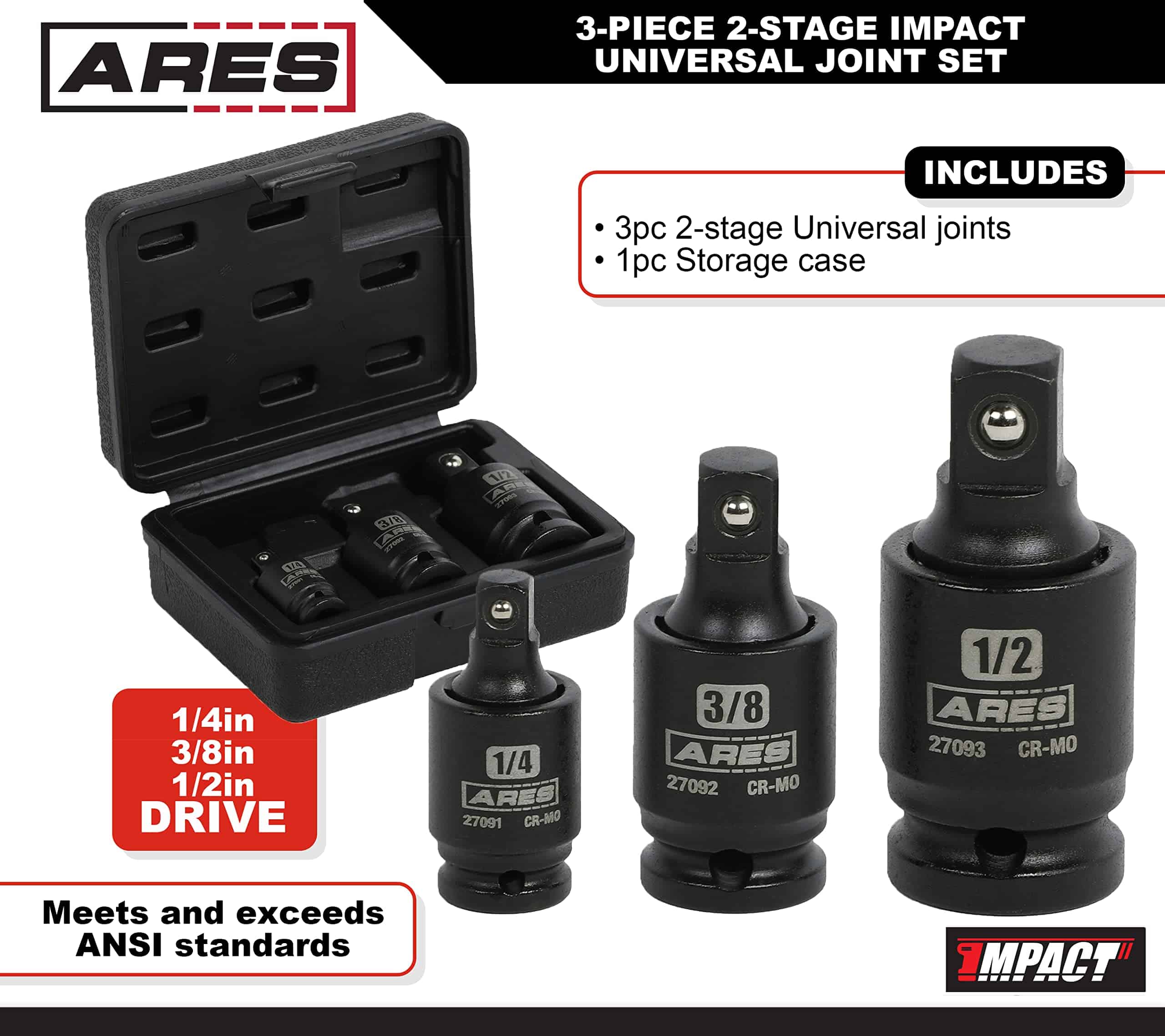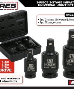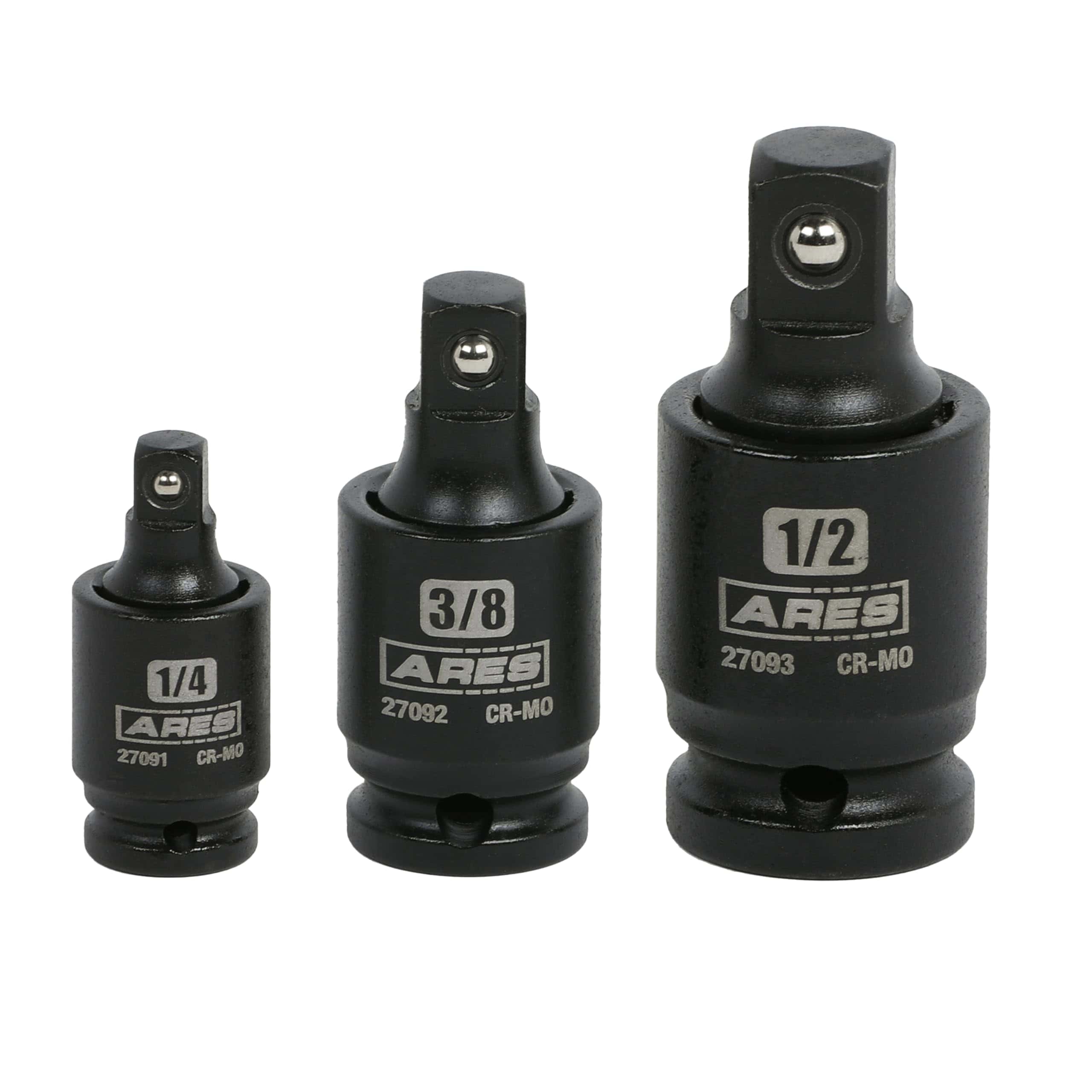 Este juego de 3 piezas de unión universal de impacto de 2 etapas ARES 27027 incluye zócalos de unión de 1/4, 3/8 y 1/2 pulgadas de accionamiento que cuentan con un diseño de bola de 2 etapas, lo que les permite cambiar rápida y fácilmente de una función giratoria a fija. Estos zócalos están fabricados con acero cromo molibdeno de alta resistencia y cuentan con un acabado de fosfato de manganeso negro para una máxima resistencia a la corrosión y al óxido. El diseño de 2 etapas de las uniones universales permite una versatilidad superior en comparación con los zócalos tradicionales de unión, ya que la posición giratoria de cada zócalo proporciona un rango de movimiento de 360 grados para un acceso más fácil a áreas de difícil alcance, mientras que la posición fija ofrece un uso estándar. Estas uniones universales están listas para impacto, lo que las hace ideales para su uso con herramientas de alta potencia. Además, cuentan con nervaduras en el cuello para un agarre mejorado y cumplen o exceden las normas ANSI. Los usuarios confían en ARES como herramientas de calidad que impactan, respaldados por la Garantía de Rendimiento de la marca. Como Embajador de Negocios de ASPCA, ARES se enorgullece de apoyar a esta gran organización que reconoce a las mascotas como parte de la familia. ¡Obtén tu juego de unión universal de 2 etapas ARES 27027 hoy mismo y experimenta la confiabilidad, eficacia y eficiencia que los usuarios esperan!
