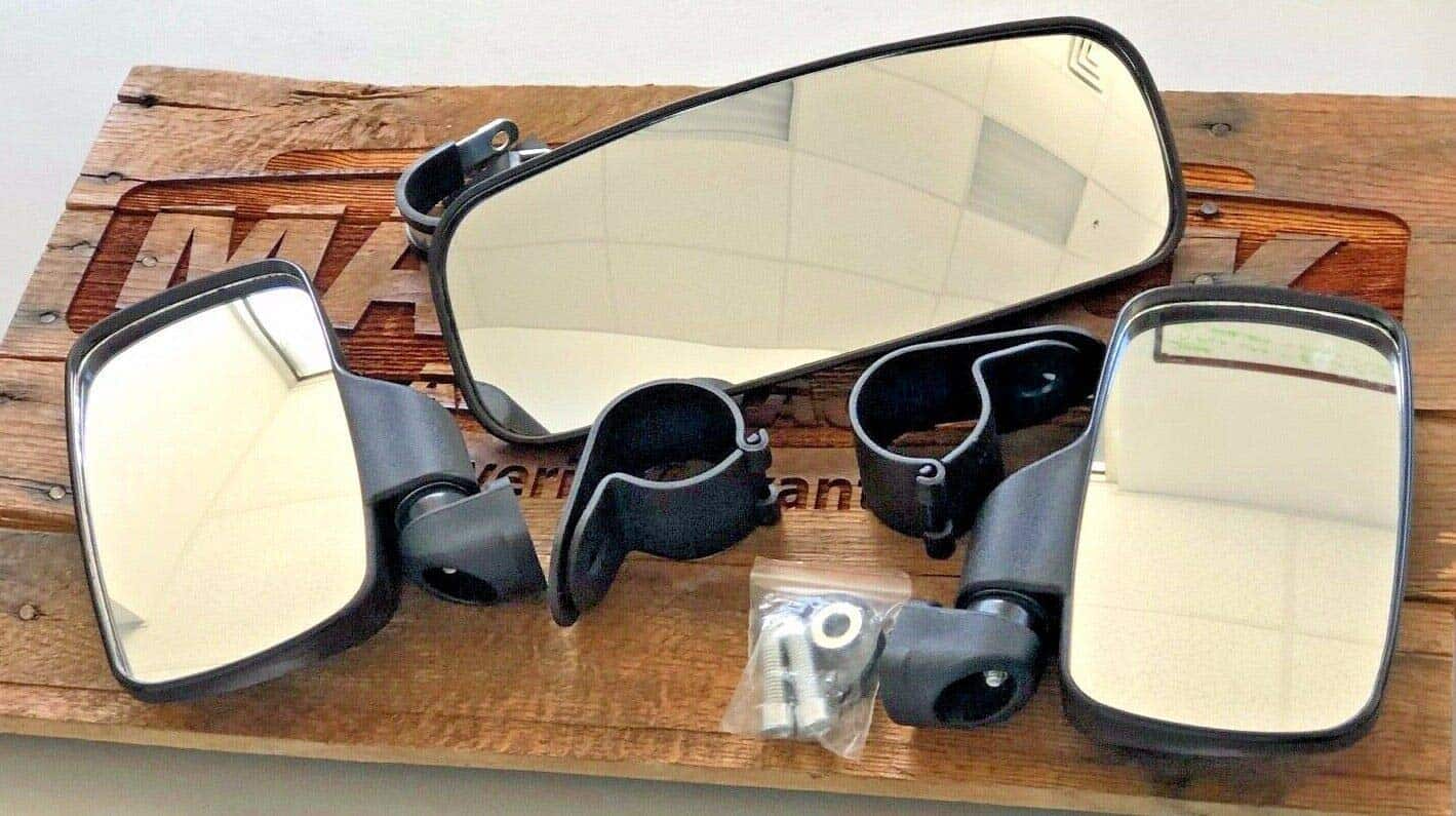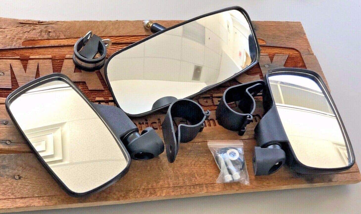 Conjunto/PAR de Espejos de visión lateral para barras redondas de 2.01″ en UTVs todoterreno. Abrazaderas de metal de acero envolventes, 2 piezas. Las abrazaderas de ACERO proporcionan máxima resistencia y durabilidad. No es una abrazadera de plástico barato que se romperá cuando estés en un paseo en el sendero! Material de espaciador de goma proporcionado según sea necesario, si es necesario en absoluto. Fácil de recortar al tamaño requerido. Espejo de cara de 8″ de alto x 4.5″ de ancho. Ligero espejo convexo con una amplia área de visualización. Carcasa de espejo ABS de alto impacto. Montura de bola totalmente ajustable (en todas direcciones). La montura de bola está diseñada para condiciones de senderos agrestes. Muy rápido y fácil de instalar. Se aprieta con un solo perno. Instala en cualquier lugar en tus postes verticales. Se pliega rápidamente para remolcar tu UTV. Espejo de visión trasera DELUXE (12″ de ancho X 4 1/2″ de alto): Espejo de 12″ de ancho x 4 1/2″ de alto. ¡Mucho más ancho que los espejos más pequeños de 8″ y 10″ que hay por ahí! ¡Curvado para ver todo lo que tienes detrás de ti! Fácil de instalar con abrazadera de estilo OEM para montar directamente en tu BARRA DE ROLLO REDONDA. Espejo duradero para todos los terrenos. Resistente a la vibración. Sé seguro y poder ver lo que está sucediendo detrás de ti. Gracias, EL EQUIPO