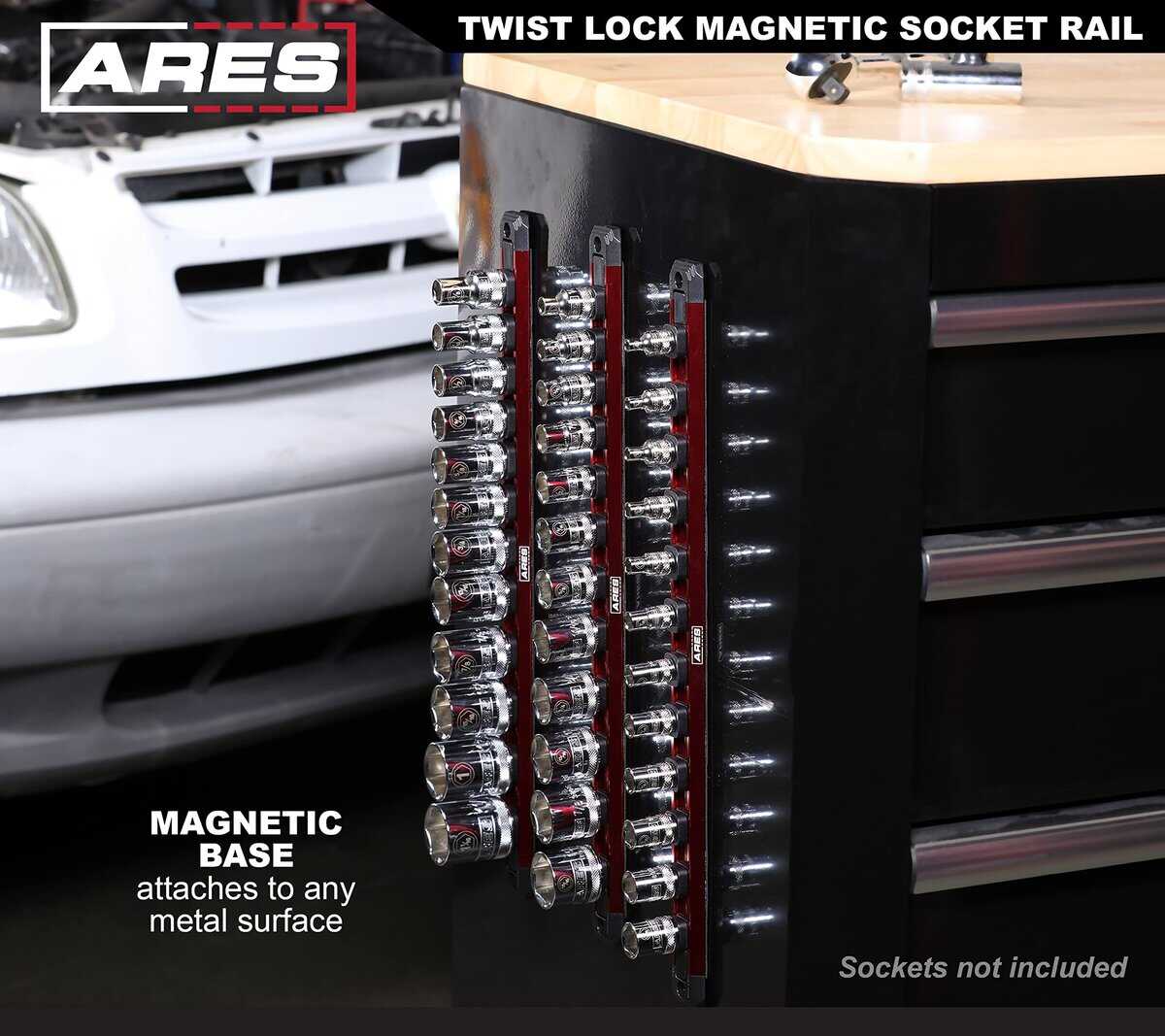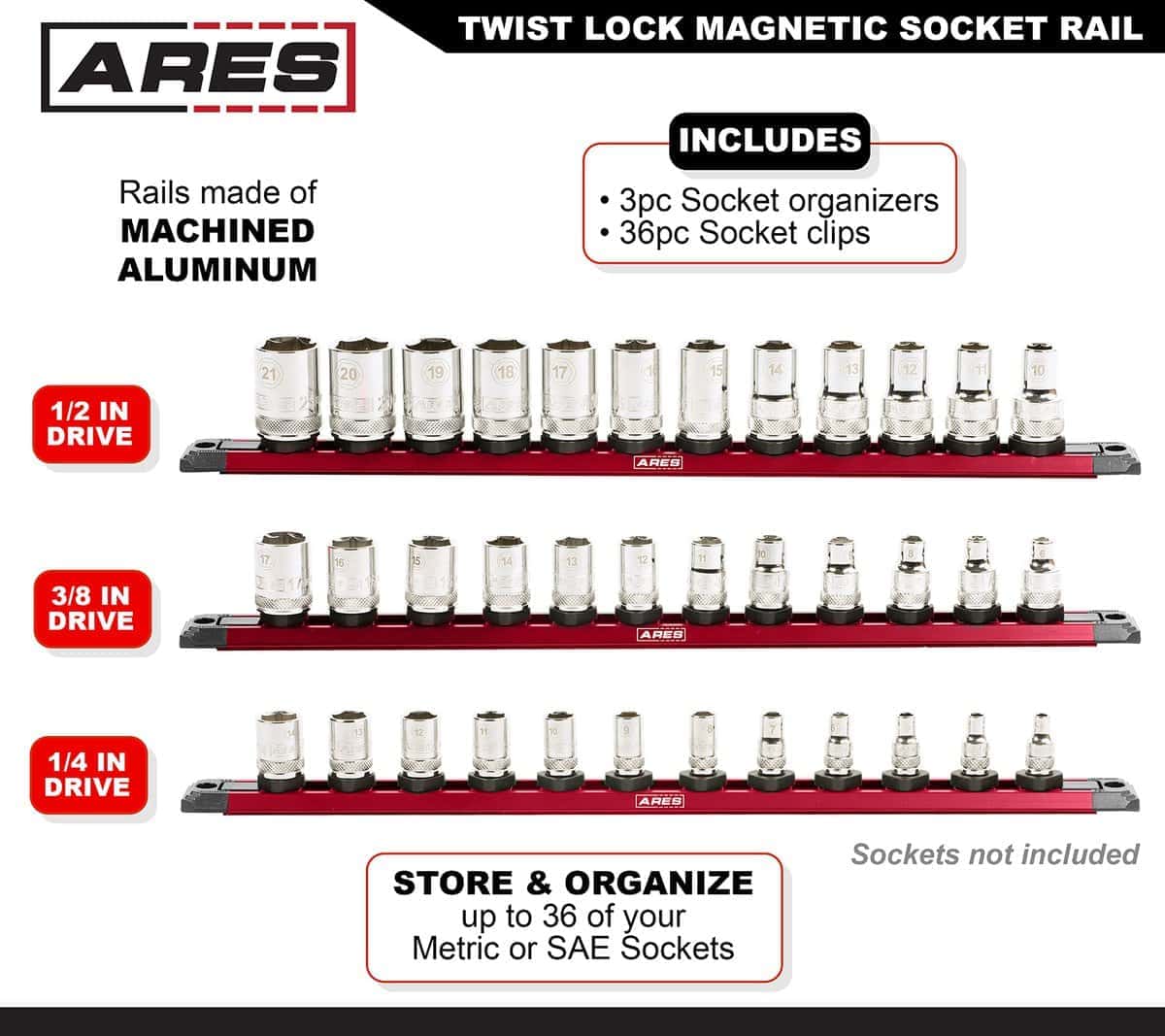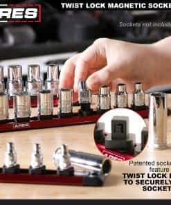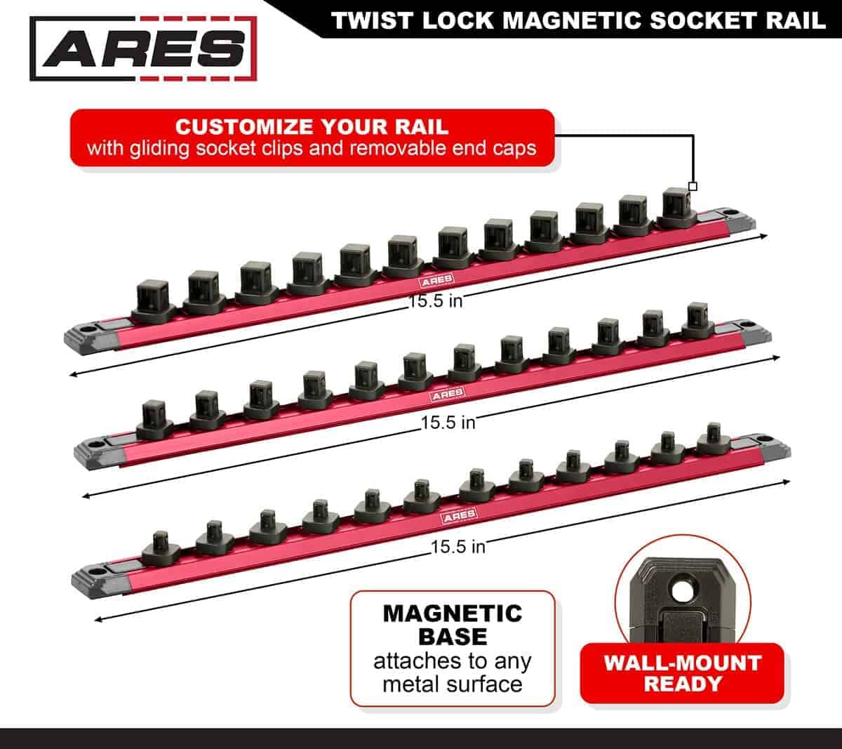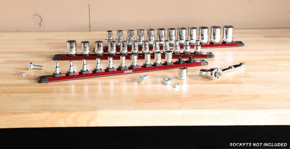 Almacena y organiza tus llaves de 1/4 pulgada, 3/8 pulgada y 1/2 pulgada El Set de 3 rieles magnéticos Twist Lock de 15.5 pulgadas en color rojo ARES tiene espacio para organizar hasta 12 de tus llaves más utilizadas en cada riel de 1/4 pulgada, 3/8 pulgada y 1/2 pulgada de accionamiento, para que puedas mantenerlas almacenadas de forma ordenada y accesibles en un solo lugar. Hechos de aluminio mecanizado con bases magnéticas, estos organizadores de 15.5 pulgadas de longitud se fijarán a cualquier superficie metálica, además de estar listos para montar en la pared. Los clips patentados de las llaves del riel sujetan las llaves SAE o métricas en su lugar, incluso boca abajo, gracias a su diseño de bloqueo de giro. Con clips de llaves deslizantes y tapas finales extraíbles, puedes personalizar tus rieles de bloqueo de giro y siempre tener las llaves que necesitas para cualquier trabajo al alcance de la mano. Características: Incluye: 3 piezas. Organizador de llaves y 36 clips para llaves Tamaños de clip incluyen 12 de cada uno: 1/4 pulgada, 3/8 pulgada y 1/2 pulgada de accionamiento Soporta hasta 12 llaves en cada riel Rieles de aluminio mecanizado Bases magnéticas se adhieren a cualquier superficie metálica Clips patentados de llaves con diseño de bloqueo de giro para sostener las llaves de forma segura Las llaves no están incluidas