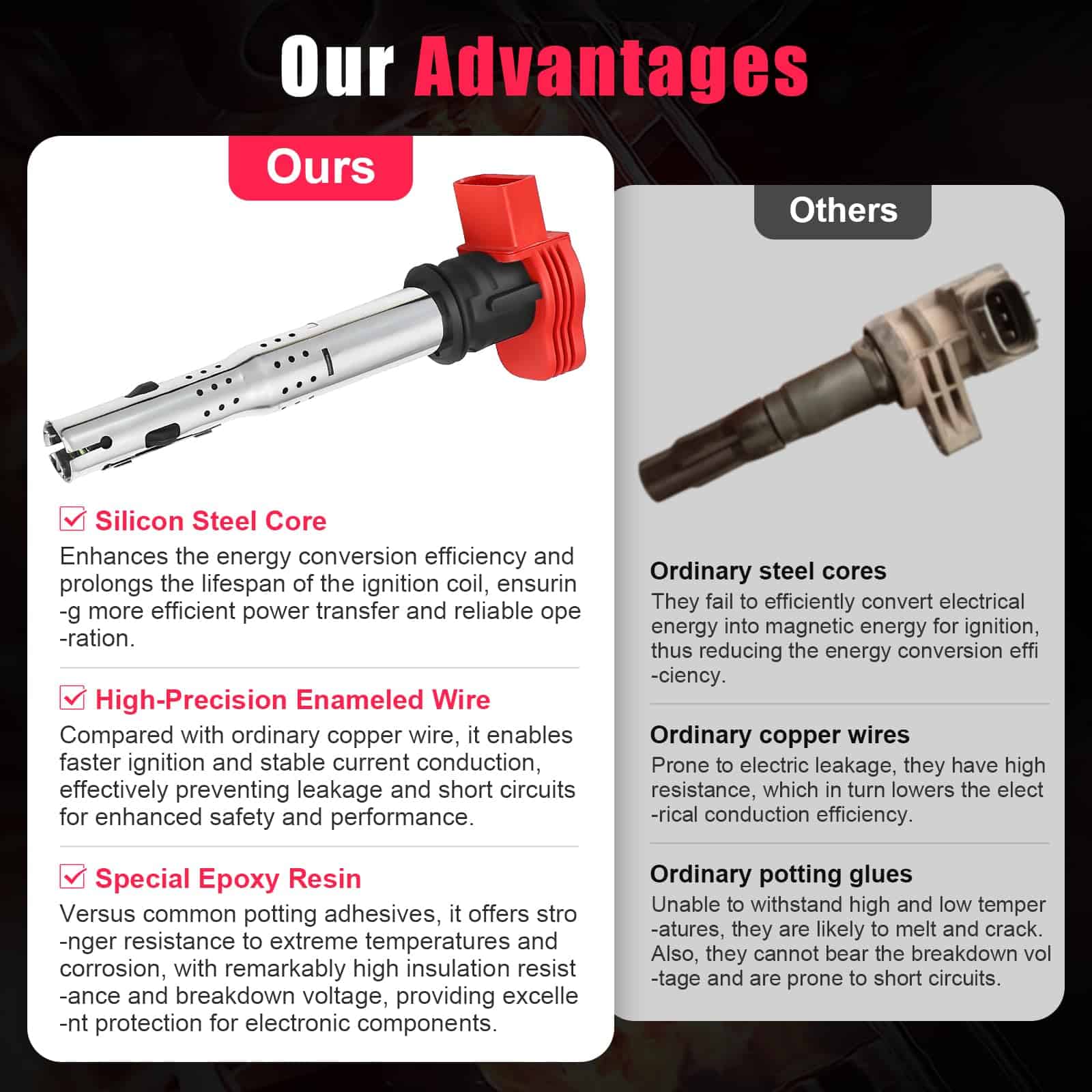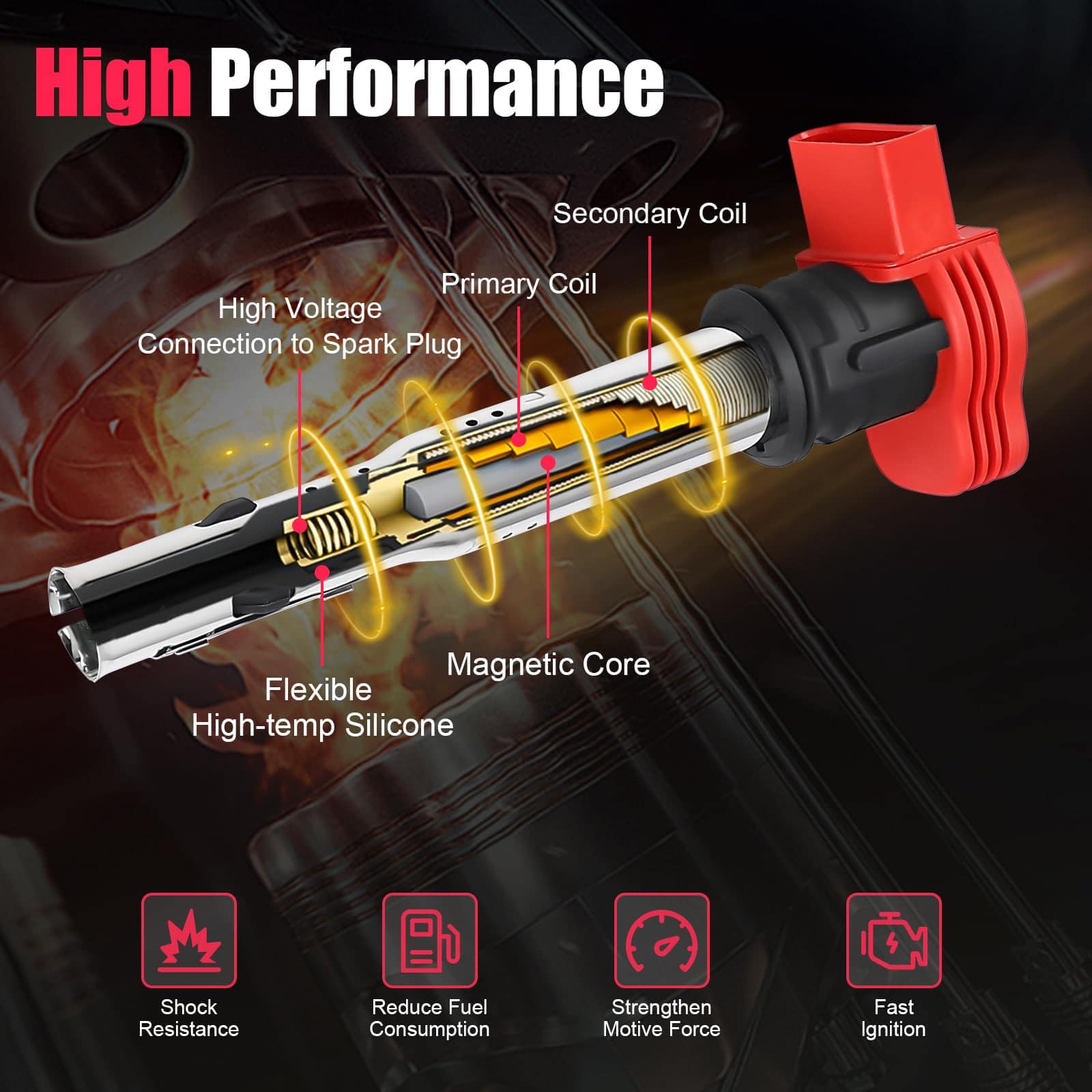 4. Función Excelente: Después de aproximadamente 50,000 kilómetros de conducción, es posible que sus bobinas de encendido comiencen a mostrar signos de envejecimiento, lo que podría provocar fallos en el motor, ralentí irregular, disminución de potencia y baja economía de combustible. Nuestras bobinas de encendido meticulosamente diseñadas y mejoradas están diseñadas para superar los estándares OEM, asegurando una instalación sin esfuerzo y mejorando drásticamente el rendimiento. Experimente capacidades excepcionales de arranque en frío y un funcionamiento más suave del motor.