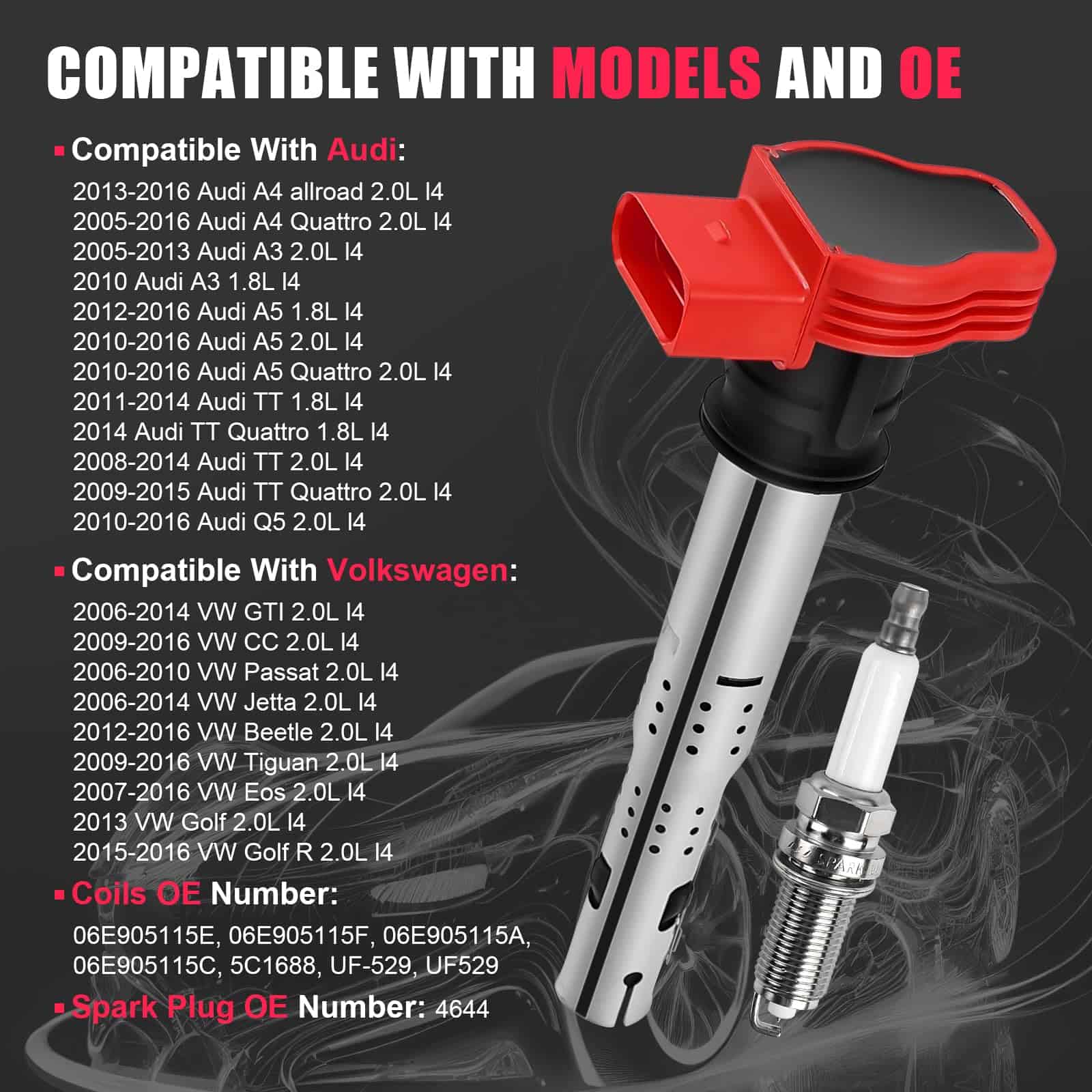 1. Compatible con: Juego de bobinas de encendido y bujías compatibles con: Audi A4 2.0T 2005-2016 | Audi TT 2.0T 2006-2014 | Audi A3 2.0L l4 2005-2013 | VW Passat 2.0T 2006-2010 | Volkswagen CC 2.0 2009-2016, etc. Para una comprensión más detallada, consulte la Descripción del Producto.