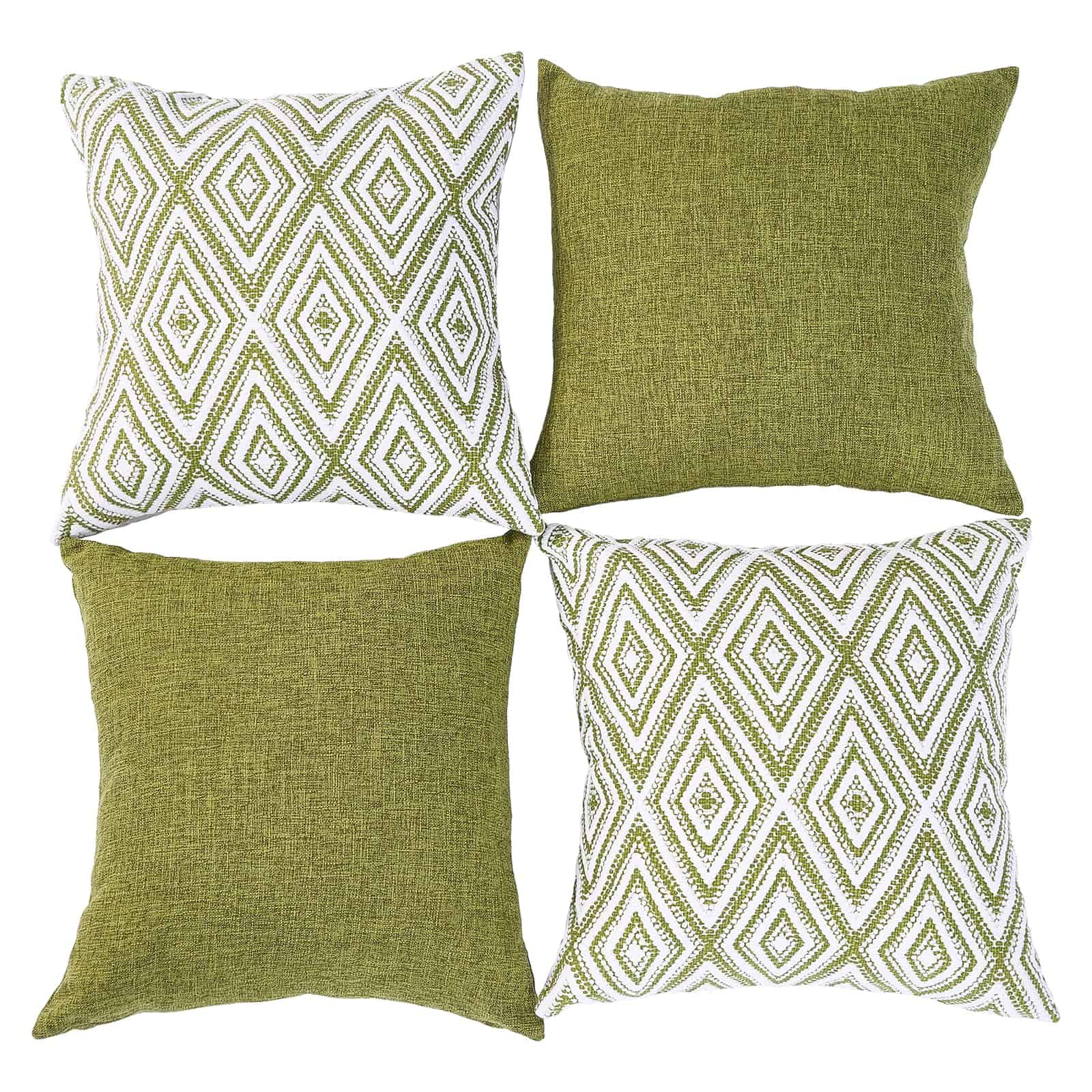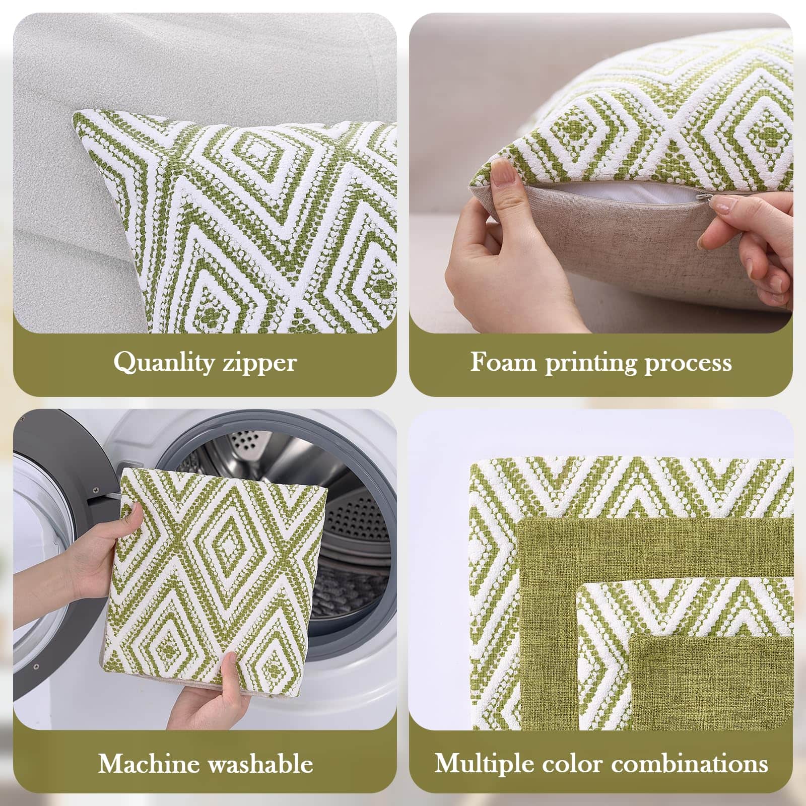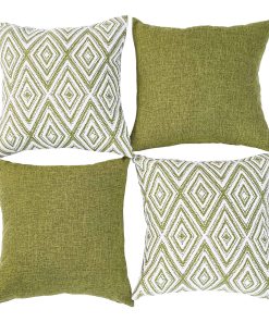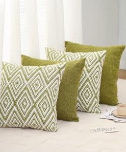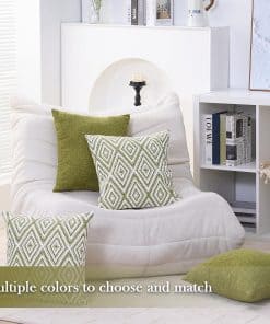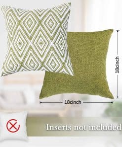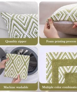 Conjunto de 4 fundas de cojín decorativas HPUK con un diseño geométrico en color verde. Estas fundas de almohada de 17×17 pulgadas están hechas de poliéster de alta calidad para una experiencia visual y una sensación de lino mejoradas. La tela es duradera, resistente a las manchas y a las arrugas, y es 100% ecológica y segura para la piel. El juego incluye 4 fundas de almohada sin relleno, por lo que se recomienda rellenarlas con almohadas de 18×18 pulgadas para lograr un aspecto más esponjoso. Las fundas de almohada cuentan con una cremallera invisible del mismo color para un aspecto elegante y son fáciles de insertar y lavar. Son ideales para decorar diferentes espacios como el sofá, la cama, la oficina, la sala de estar y el dormitorio, y también se pueden usar como regalo. Para mantener las fundas de almohada en óptimas condiciones, se recomienda lavar a máquina con agua fría por separado y solo en ciclo suave, sin usar blanqueador.