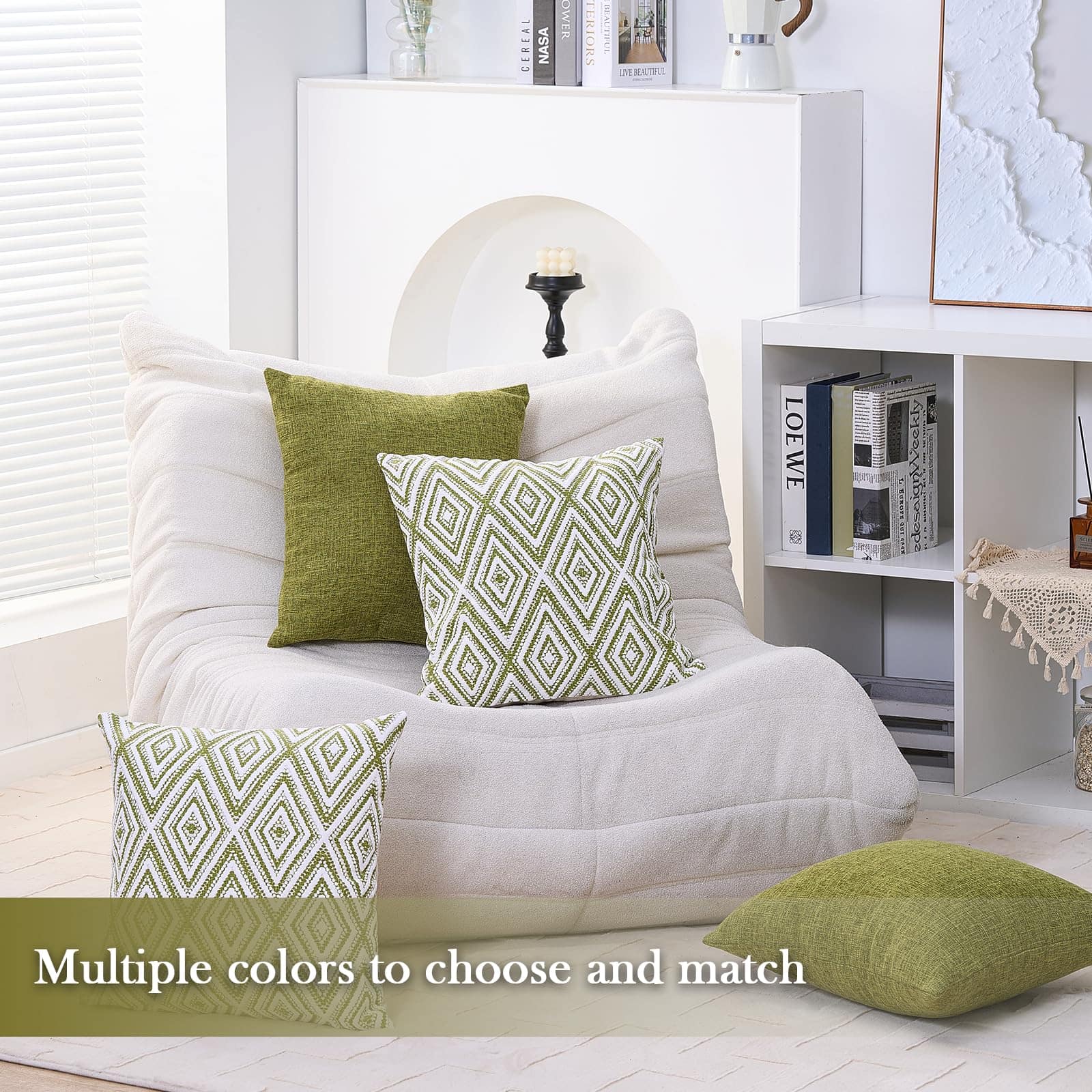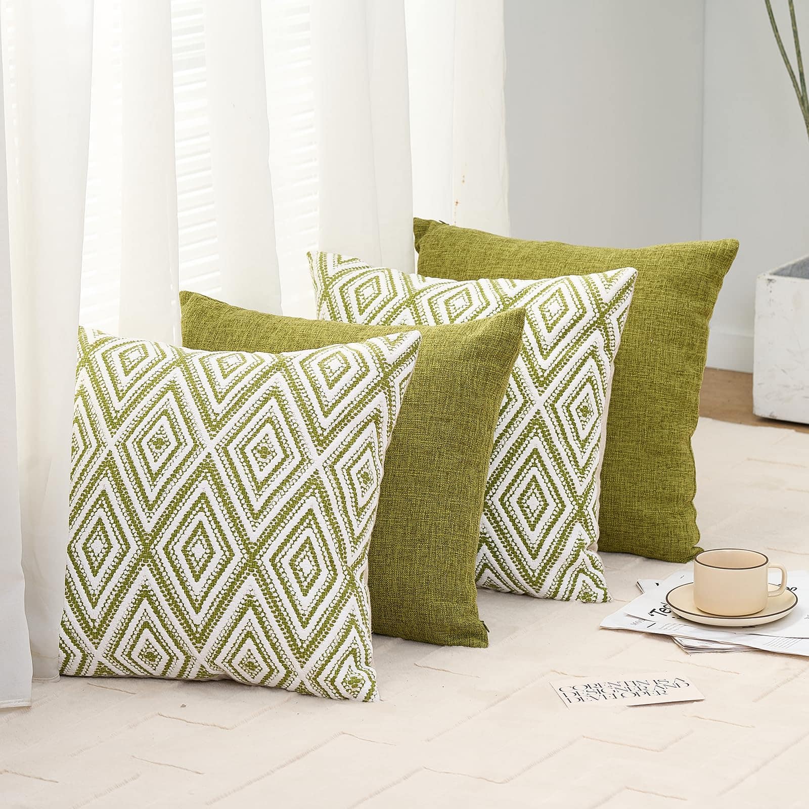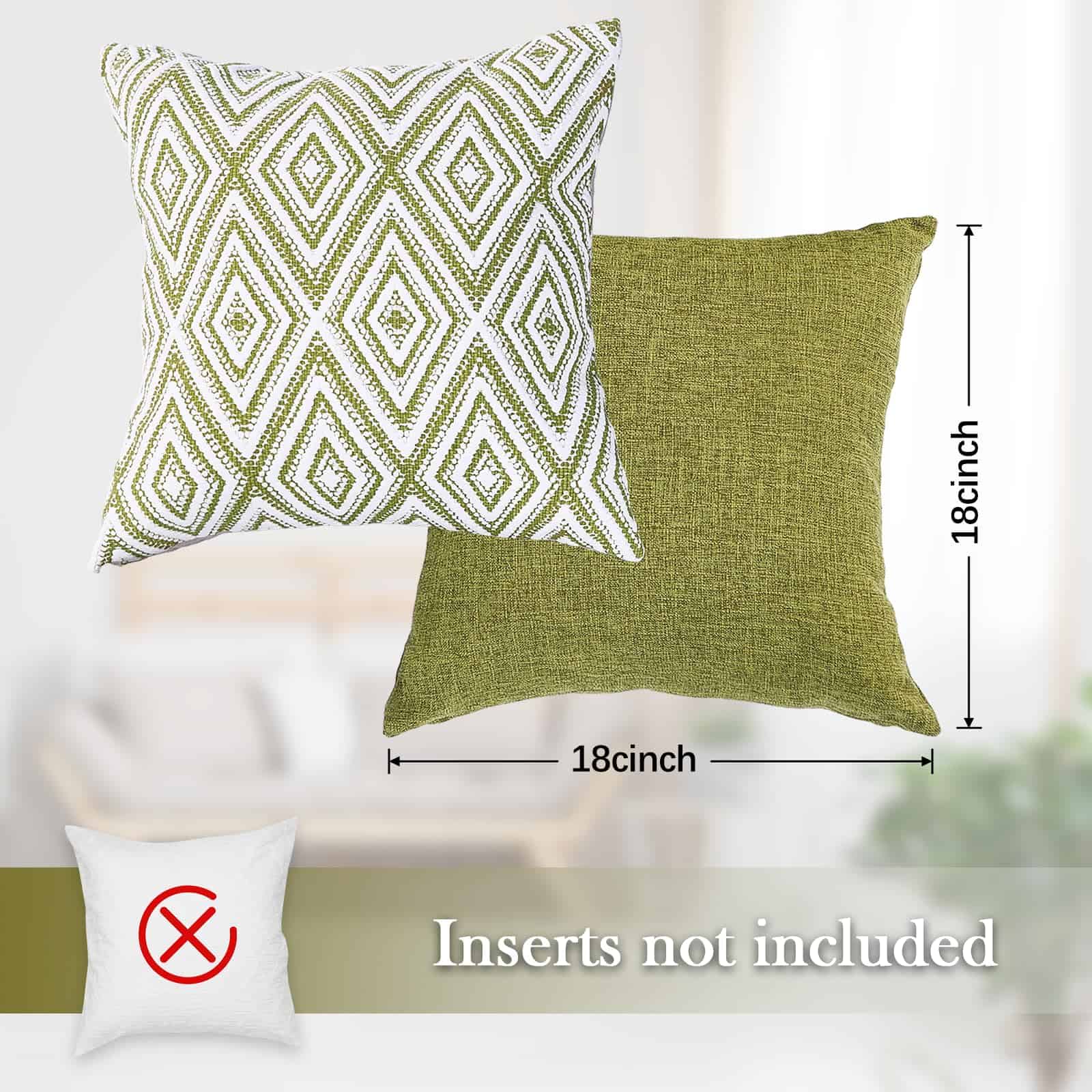 Conjunto de 4 fundas de cojín decorativas HPUK con un diseño geométrico en color verde. Estas fundas de almohada de 17×17 pulgadas están hechas de poliéster de alta calidad para una experiencia visual y una sensación de lino mejoradas. La tela es duradera, resistente a las manchas y a las arrugas, y es 100% ecológica y segura para la piel. El juego incluye 4 fundas de almohada sin relleno, por lo que se recomienda rellenarlas con almohadas de 18×18 pulgadas para lograr un aspecto más esponjoso. Las fundas de almohada cuentan con una cremallera invisible del mismo color para un aspecto elegante y son fáciles de insertar y lavar. Son ideales para decorar diferentes espacios como el sofá, la cama, la oficina, la sala de estar y el dormitorio, y también se pueden usar como regalo. Para mantener las fundas de almohada en óptimas condiciones, se recomienda lavar a máquina con agua fría por separado y solo en ciclo suave, sin usar blanqueador.