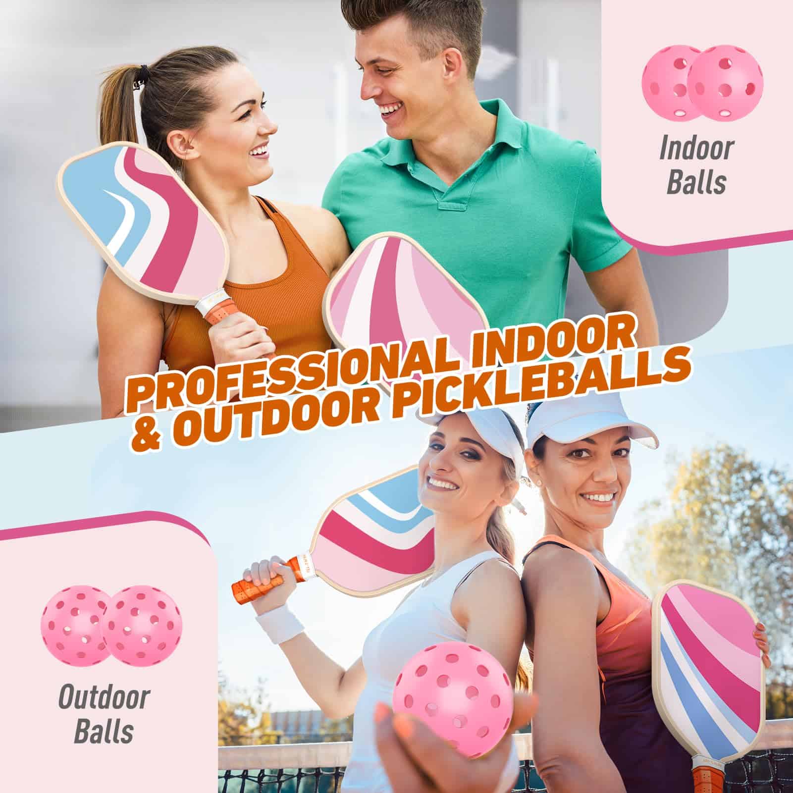 3. Palas de Pickleball Profesionales y Bolas: Las palas de pickleball están equipadas con un agarre acolchado perforado, que es antideslizante y que absorbe el sudor. El agarre ergonómico no solo te proporciona una gran comodidad, sino que también logra un agarre y maniobrabilidad precisos. Las dimensiones de las palas de pickleball son 15.7″ L x 7.6» W x 0.42»H, y el tamaño de nuestra bola de pala se ajusta estrictamente al estándar del juego. Están diseñados para jugar en interiores o exteriores con dos bolas para exterior y dos para interior incluidas.